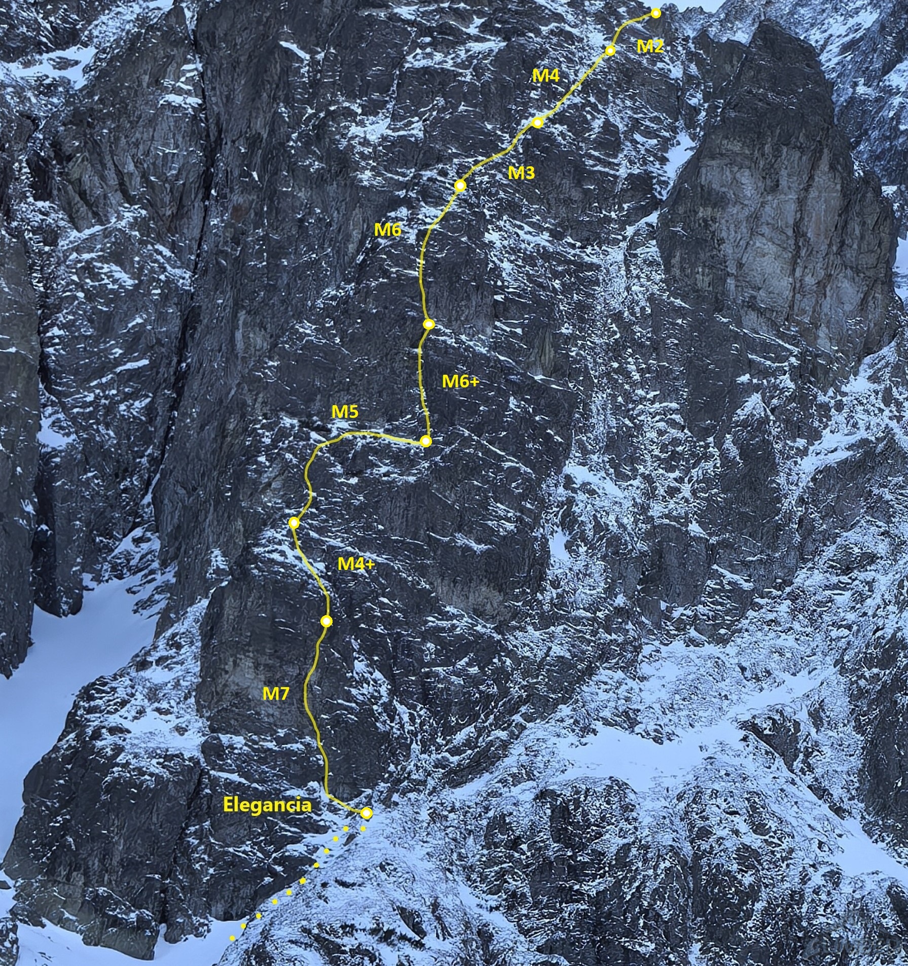 Elegancia startuje w ewidentnym miejscu – zatrzymujemy się na początku wielkiego śnieżno-trawiastego zachodu, którym biegnie Droga Żuławskiego (jej opis TUTAJ) i naszym oczom ukazuje się ciąg rys biegnących pionowo do góry. Pokonujemy nyżę u podstawy ściany i kontynuujemy w dość wyrównanych trudnościach ok. M6 do szerokiego, obłego pęknięcia (M7) pod którym znajduje się jedyny na tym wyciągu stały hak (przydają się zdublowane średnie i duże friendy). Kluczowe miejsce jest techniczne i nieco loteryjne – łatwo z niego wypaść, o czym przekonuje się Michał podczas pierwszej próby. Na szczęście po powrocie na ziemię i przewiązaniu się drugie podejście jest już skuteczne – z powodu późnej pory o której wystartowaliśmy nie podjęlibyśmy kolejnej próby. Po pokonaniu cruxa czeka jeszcze kilka czujnych metrów i wychodzimy na wygodną półkę, gdzie trzeba zbudować własne stanowisko.