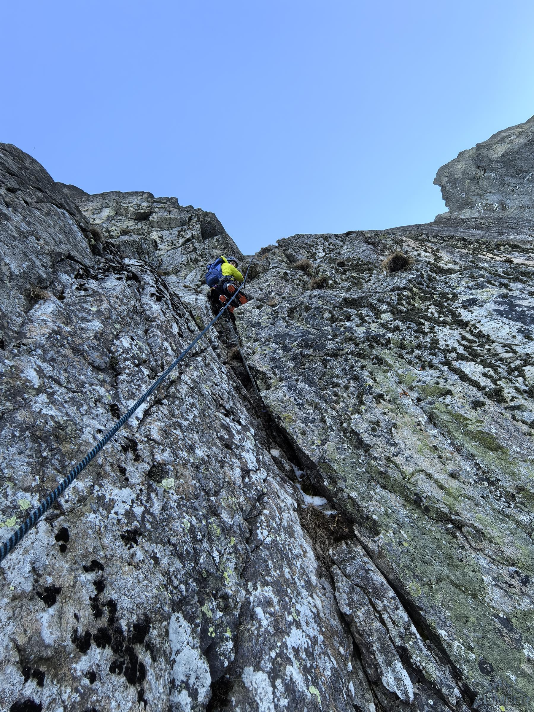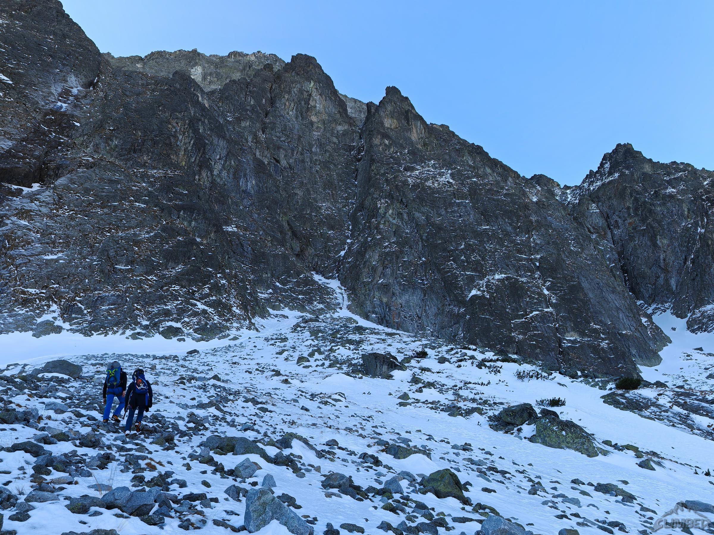 Po późnym powrocie w sobotę z Wielkiej Złotej Kazalnicy na której przeszliśmy Elegancię, w niedzielę odpuszczamy zaplanowaną dłuższą drogę i kierujemy się pod Kieżmarską Bulę. Cel wybieramy dopiero na miejscu – skuszeni logiczną linią i pięknym zacięciem w środku ściany decydujemy się na Cigáni idú do neba (M6). Droga okazuje się godna polecenia – w dolnej części poza wspomnianą formacją do przejścia jest niebanalny odcinek mikstowy i dość wymagający kominek, w górnej czeka fajne wspinanie w skale i nieco mniej przyjemne w płytkich trawach. Dodając do tego krótkie podejście i szybki powrót zjazdami otrzymujemy przepis na ciekawą szybką akcję do zrealizowania właściwie w każdych warunkach.