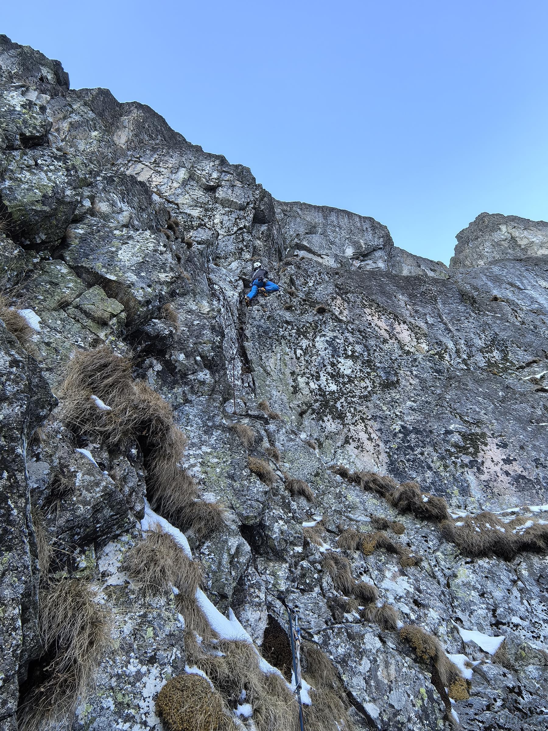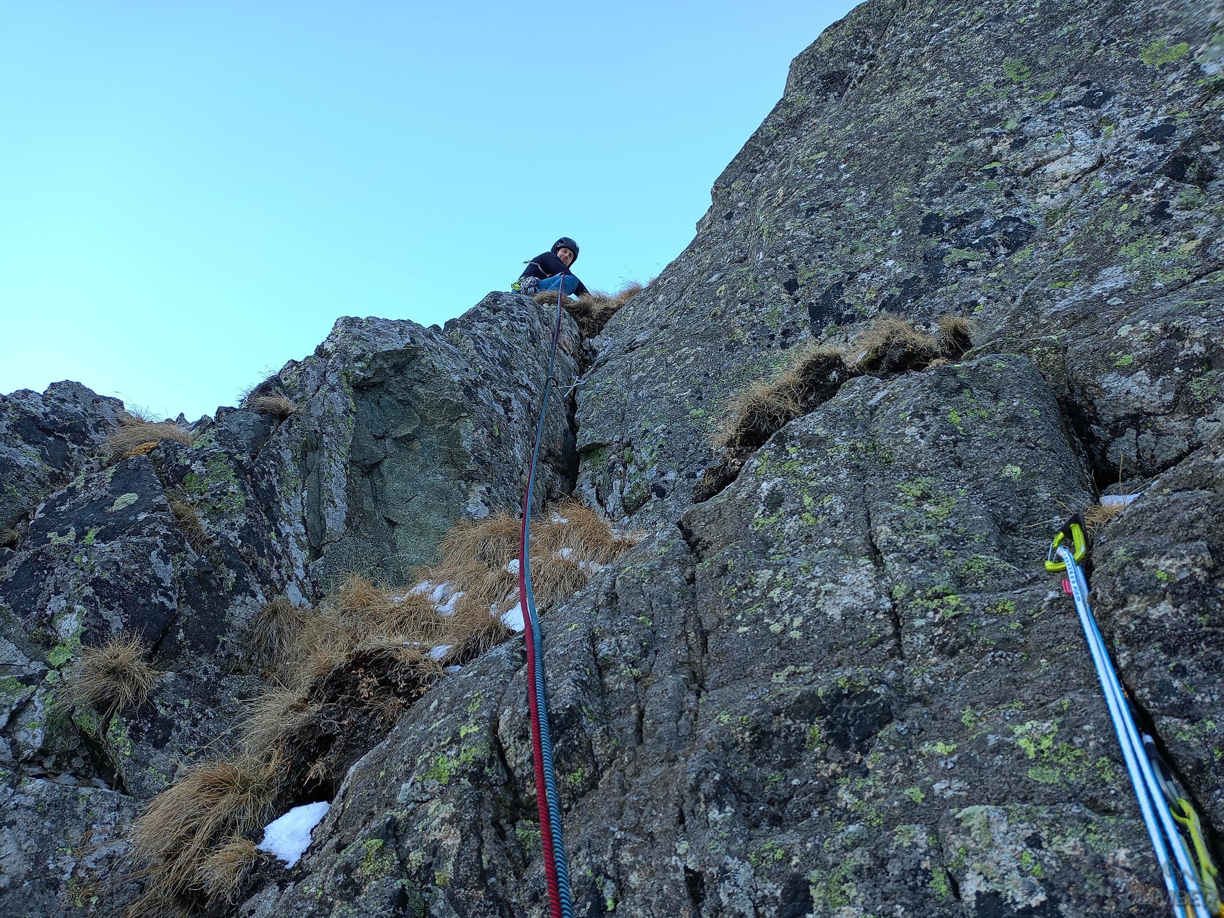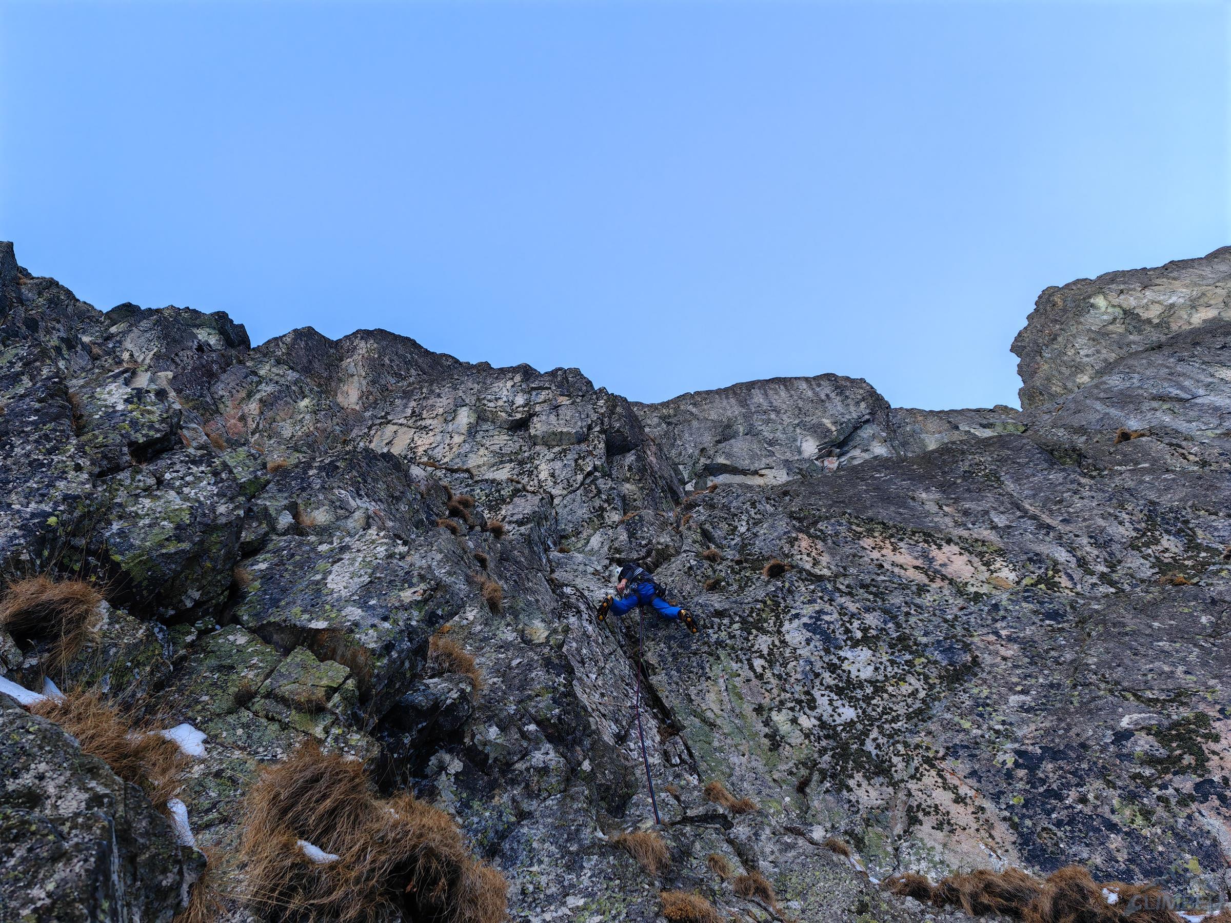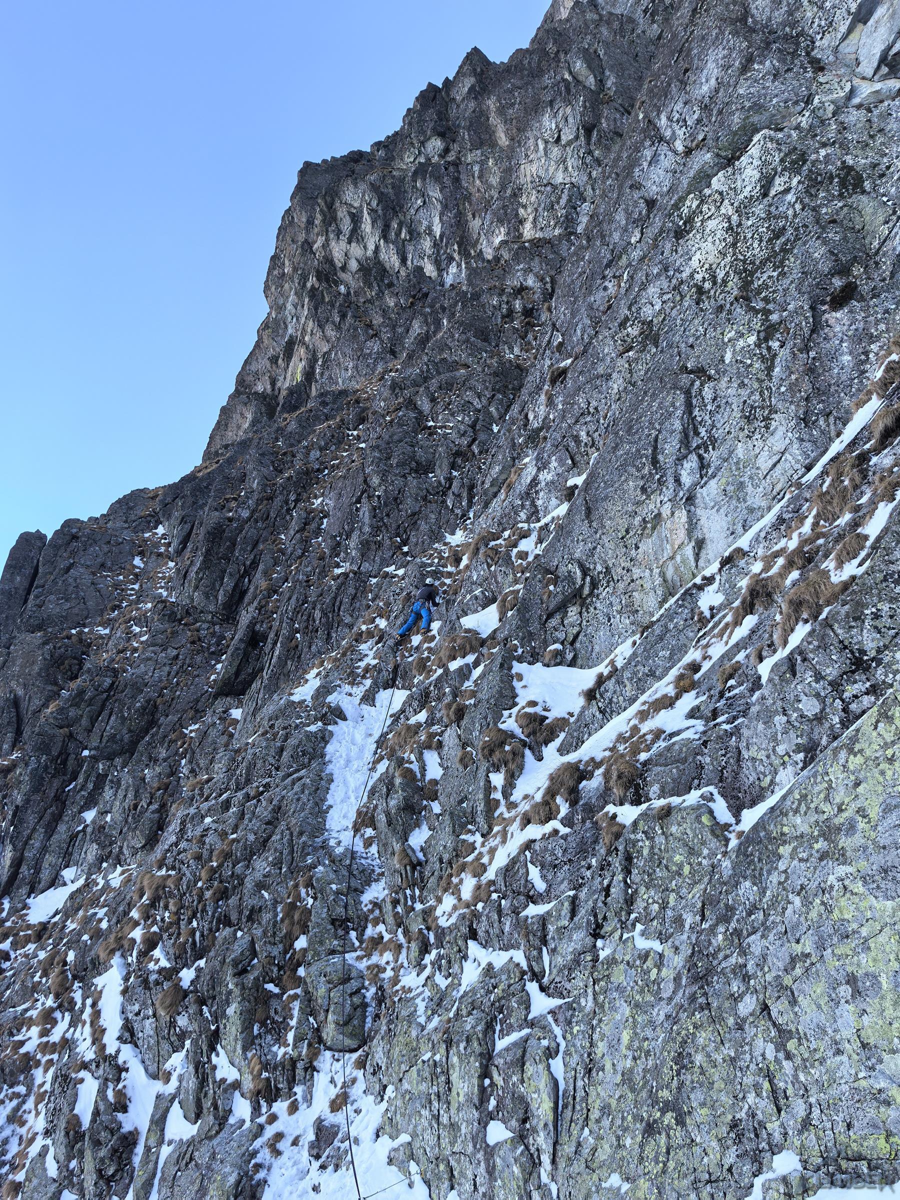 Piękne zacięcie przypada w prowadzeniu Michałowi – ze stanowiska (własnego) na półce ruszamy wprost do góry, pokonujemy kolejne lite metry z doskonałą asekuracją (ok. M5) i po dojściu pod odcinający dalszą drogę okap przechodzimy pod nim w lewo (wg topo M6 ale raczej max M6-) i przewijamy się na taras. Z niego warto podejść jeszcze kilka metrów do góry (M4+) na półkę pod wąskim tunelem skalnym. Kolejny wyciąg zaczynamy od pokonania tego miejsca (M4), po czym kierujemy się skośnie w lewo wyraźną załupą (M3) pod żółtą ściankę, gdzie w prawo odbija wariant oryginalny, obecnie rzadko raczej uczęszczany – sugerując się topo z przewodnika po wybranych drogach na Słowacji (pod red. Kuby/Richarda/Wadima) kontynuuję rampą do małego kominka (M4). Warto pokonać go w ciągu i po wyjściu na pole śnieżne zatrzymać się pod ostatnią przeszkodą czyli trawiastą ścianką. Odcinek ten choć łatwy (M4) wymaga wzmożonej czujności i asekuracji z haków i sprzętu do trawy – po jego pokonaniu pokonujemy jeszcze krótki uskok z dużymi blokami i wychodzimy na taras nad Kieżmarską Bulą.