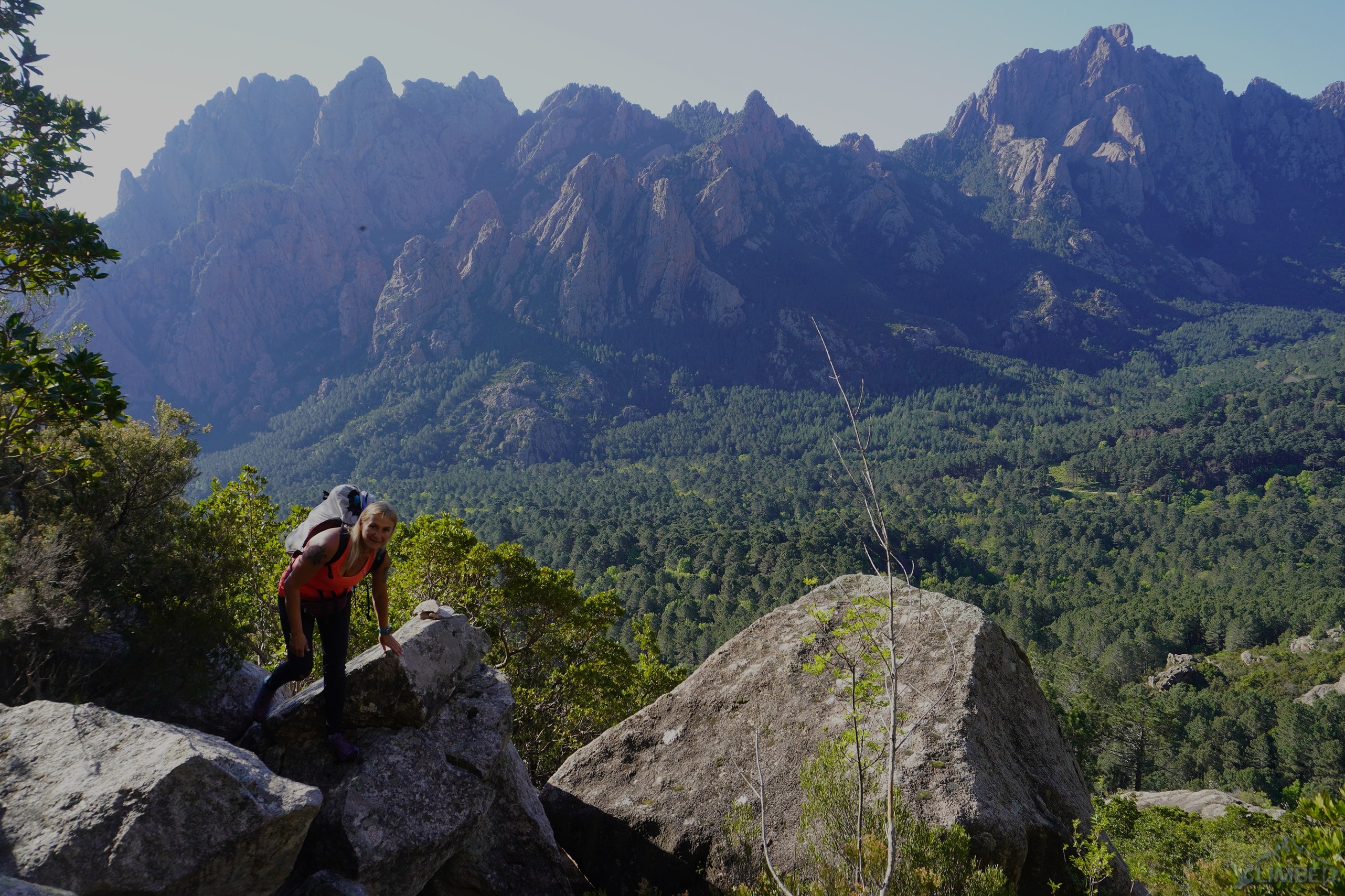 Na szczycie czeka nas piękny widok – z jednej strony góry, z drugiej morze, a tuż naprzeciwko imponujące ściany Punta Corbu i Punta Lunarda. Jeżeli zabraliśmy buty i nie zostawiliśmy nic pod ścianą można zejść ścieżką na stronę północną, my jednak wybieramy opcję zjazdową. Jest ona całkiem wygodna gdyż po trzech zjazdach słynną drogą Octogenese dostajemy się do kociołka z drzewami, z którego przechodzimy ścieżką do stanowiska po piątym wyciągu robionej przez nas drogi – stąd do ziemi mamy już tylko trzy zjazdy.