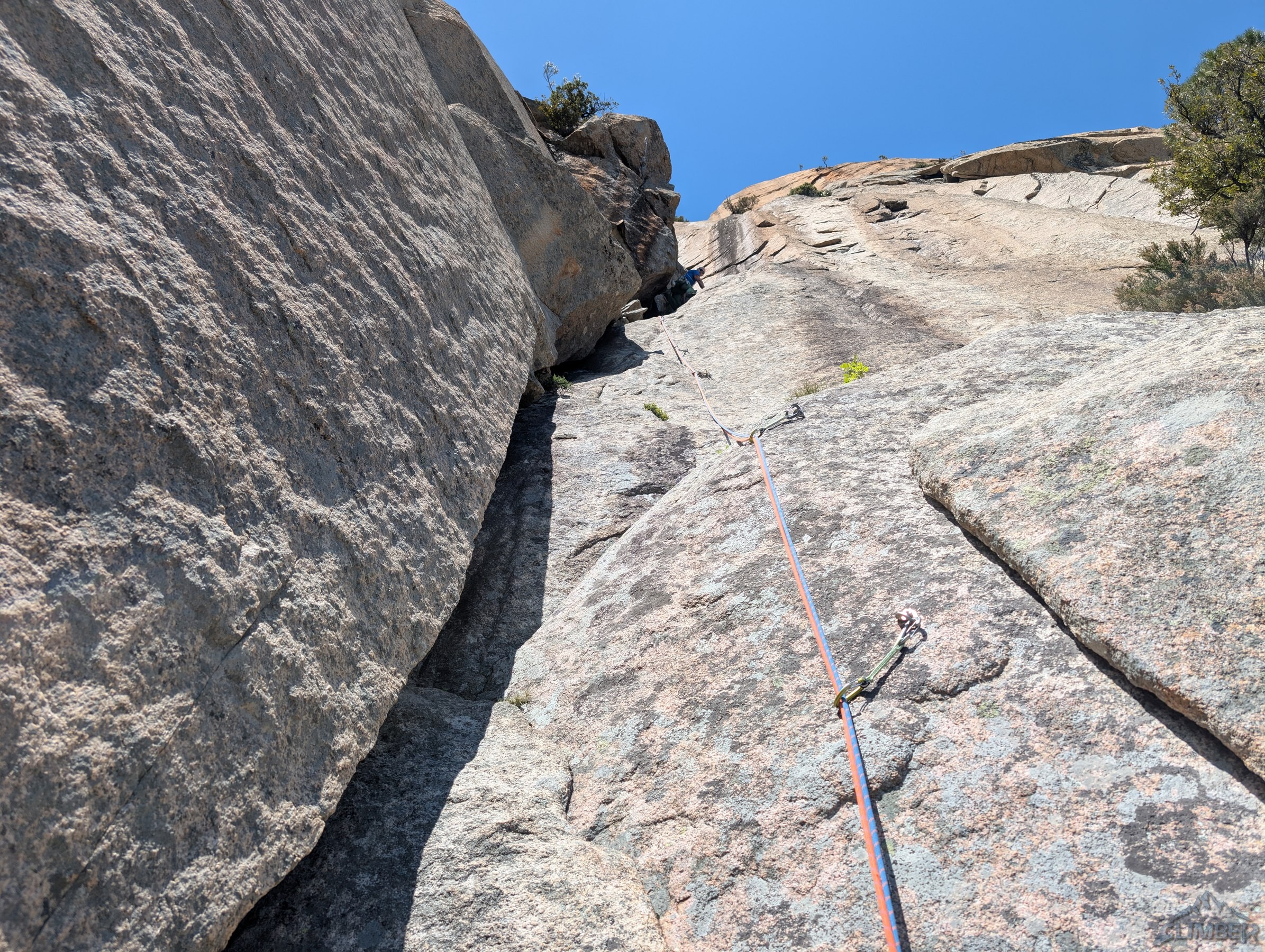 Trzeci odcinek wygląda imponująco i wspinanie na nim nie jest banalne jak na wycenę 6a+. Po przejściu odcinka płytowego wchodzimy do komino-rysy i pokonujemy kolejne uskoki, z których jeden z powodu śliskiej wymytej skały jest całkiem sprężny. Dla tego odcinka warto zabrać z 3-4 friendy (#0.5-2) by poprawić komfort wspinania. Z kolejnej zjazdówki przenosimy się na półkę po lewej i z niej wchodzimy w wyciąg czwarty – po przejściu po klamach czeka czujny ale dobrze obity trawers w lewo (6b) do bliskiego stanowiska. Z niego wspinamy się piękną techniczną płytą (6a) z jednym wymagającym miejscem, po którym rajbungiem docieramy do dużej półki. Z niej przenosimy się kilkanaście metrów w lewo pod start kolejnego wyciągu szóstego. Czeka na nim fajne tarciowe wspinanie – początkowo nieco trudniejsze (5c), po czym teren się kładzie i biegniemy do kolejnego stanowiska.
