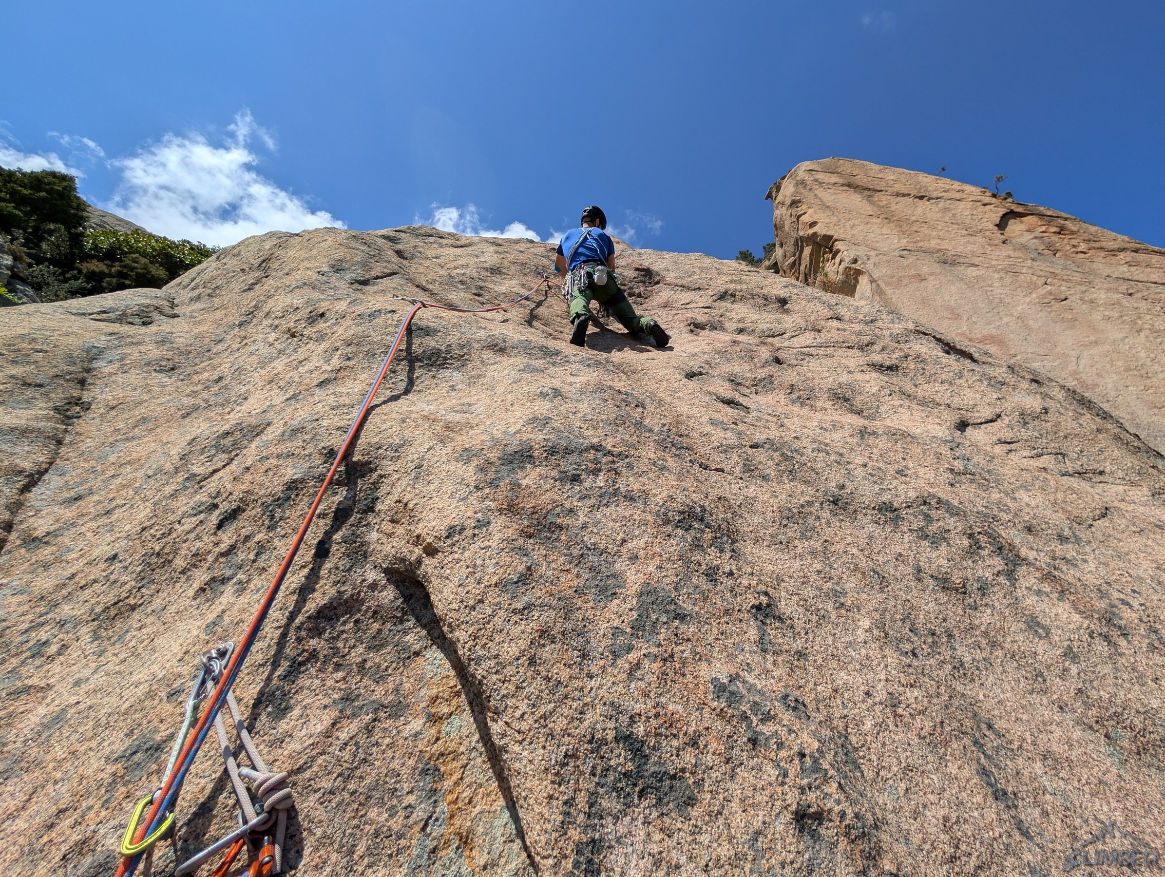 Podsumowując – droga, choć nieco mniej atrakcyjna od Acqua in Bocca, jest godna polecenia. Poza odstającym trudnościami pierwszym wyciągiem (który można przejść A0 jeżeli nie jest się dobrym off-widthowym wspinaczem) trzyma w trudnościach 6a-6b więc może stanowić łatwiejszą dla niej alternatywę wśród obitych linii na ścianie. Bo linie tradowe to już zupełnie inna historia – nawet na teoretycznie nisko wycenionych Porte des cieux (6b), Penne Rigate (6b) czy Crack’age (6c) nie ma co liczyć na taryfę ulgową, a słynna Abbastanza (7a+) to już zupełnie inna liga!