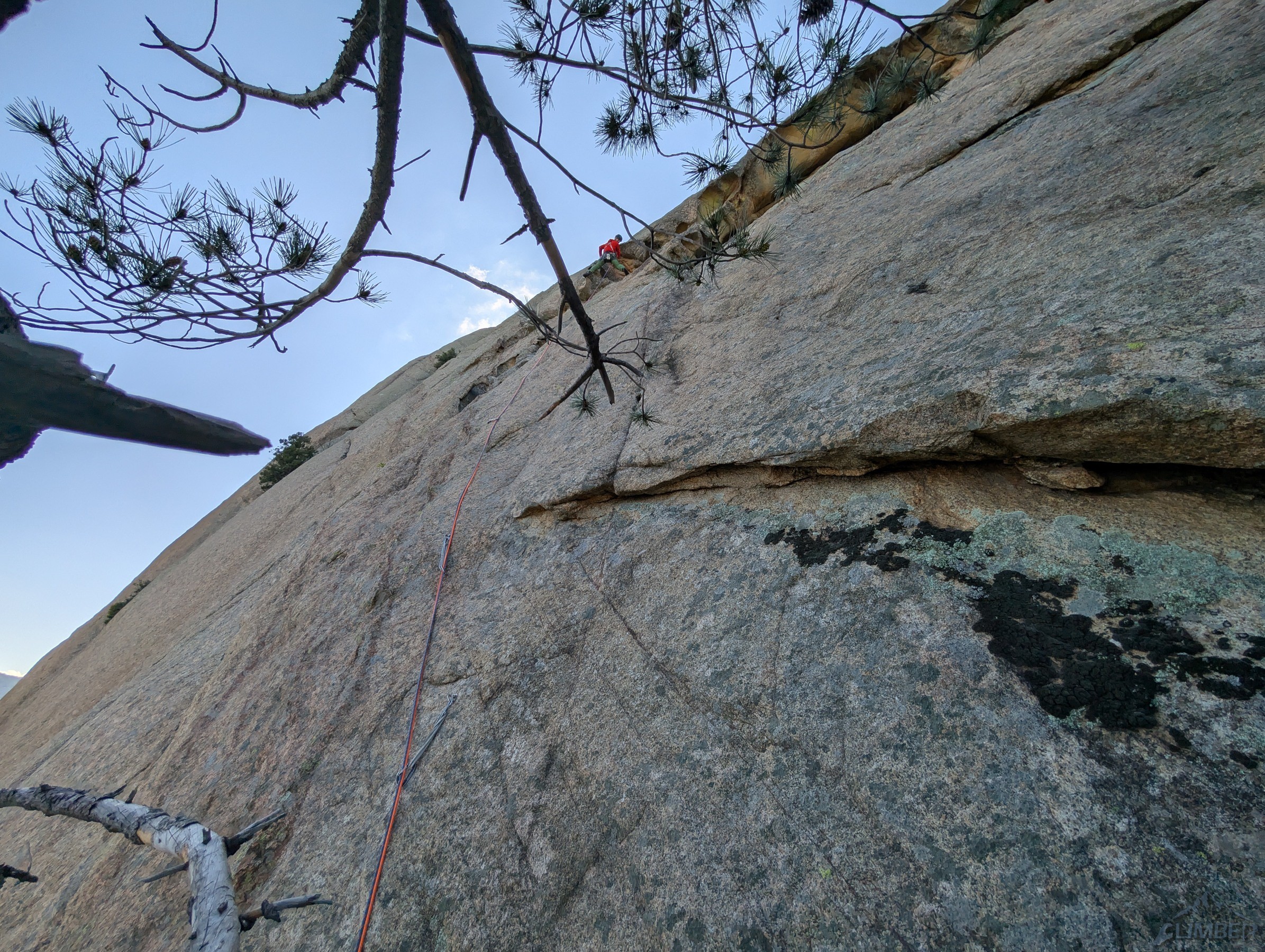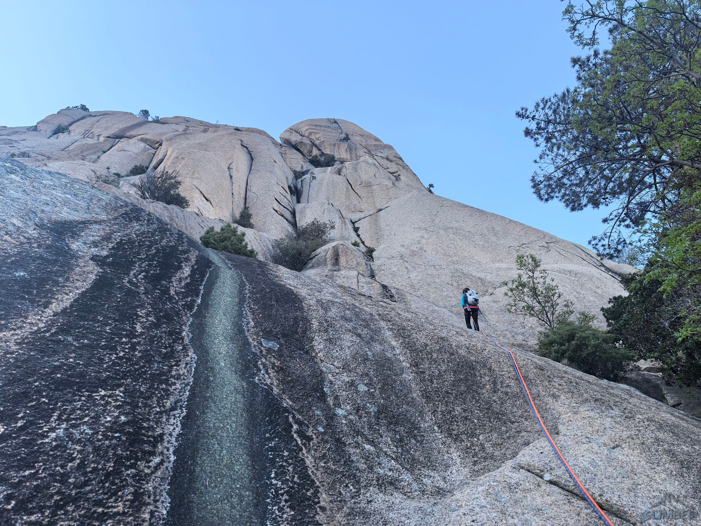 Do tego miejsca rampą z prawej strony dochodzi droga Invitation au voyage (5b), która w kombinacji z trzema kolejnymi wyciągami Avec etau stanowi najłatwiejszy sposób przejścia ściany – tydzień wcześniej wspinaczką taką odbyli zresztą nasi znajomi. W tym miejscu plan zakładał, że dalej poprowadzi Ania – odległe spity na niebanalnie wyglądających rajbungach spowodowały jednak, że po kilku metrach doszło do sabotażu 😉 i nie pozostało mi nic innego jak kontynuować prowadzenie. Na siódmym wyciągu (6a) przy rozgrzanej Słońcem płycie faktycznie można poczuć się nieco mało komfortowo robiąc tarciowe ruchy kilka metrów nad wpinką – dobrym rozwiązaniem jest poruszanie się jak najszybciej 😊. Wspinanie przypomina to z czym do czynienia mamy na słynnym grzbiecie Słonia (RELACJA), tam jeden wyciąg jest jednak trudniejszy i jeszcze rzadziej obity. Na ósmym wyciągu (5c) kontynuujemy rajbungową płytą, która przedzielona jest jednak okapem – omijamy go sprytnie prawą stroną i wracamy w lewo po czym kierujemy się do stanowiska na drzewie. Ostatni wyciąg wygląda na trudniejszy niż jest w rzeczywistości (6a) aczkolwiek jest bardzo ładny i różnorodny – zaczynamy od płytowego trawersu, pokonujemy tafonisy oraz niebanalny okapik powyżej i już bez spita (można coś dorzucić) wychodzimy ze ściany.