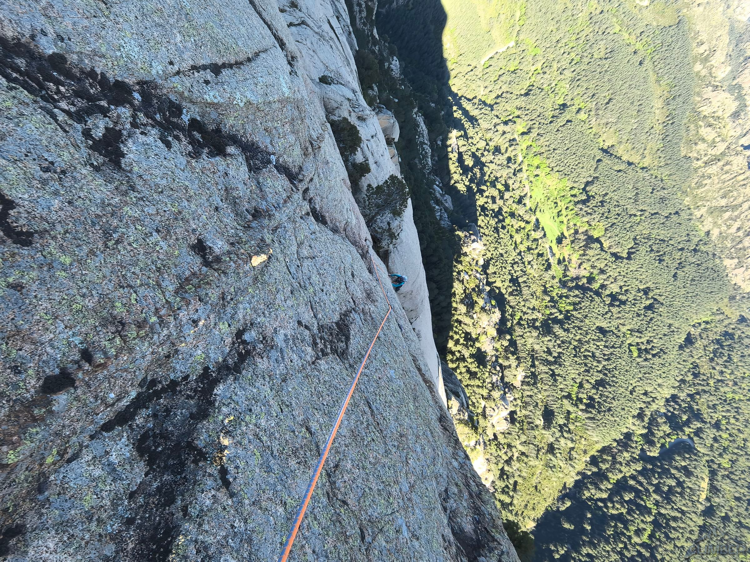 Drugiego dnia pobytu w Bavelli ruszamy na jedną z dwóch najlepszych ścian rejonu, Teghie Lisce. Po świetnym Acqua in Bocca (7a 350m, relacja TUTAJ) w 2024, tym razem kolejny klasyk - Avec etau et violon (6c/6c+ 300m). Teoretycznie linia łatwiejsza, nie należy jej jednak lekceważyć. Szczególnie przerysa na starcie okazuje się nie być przereklamowana i przekonujemy się skąd tyle wpisów z A0 jak sugerują w przewodniku 😉. Dalej też jest ciekawie i mimo niższych wycen oraz prawie kompletnego obicia miejscami niebanalnie, a na rajbungach konieczne są wyjścia wysoko nad wpinkę. Plusem drogi jest to, że jako jedna z nielicznych kończy bezpośrednio na szczycie, skąd rozpościera się piękny widok.