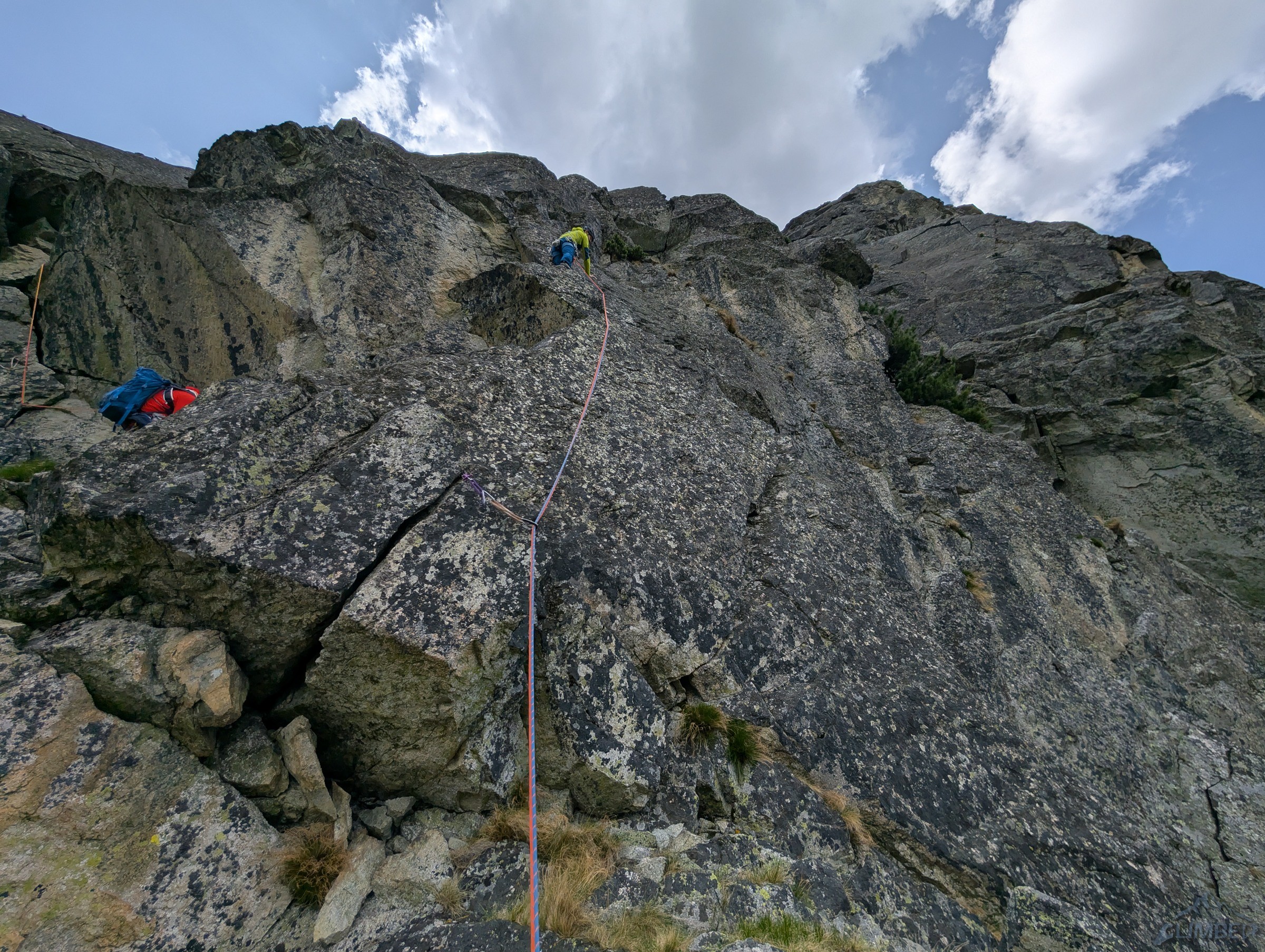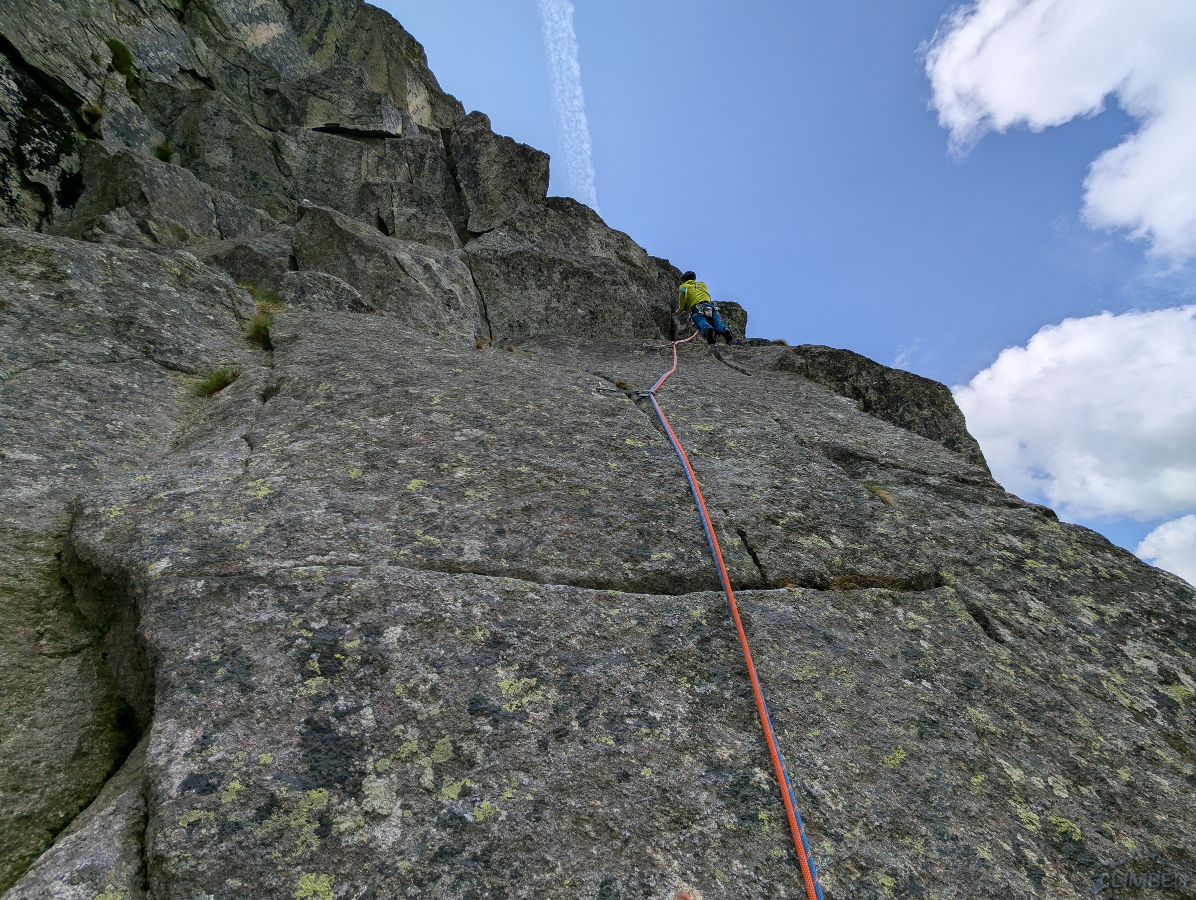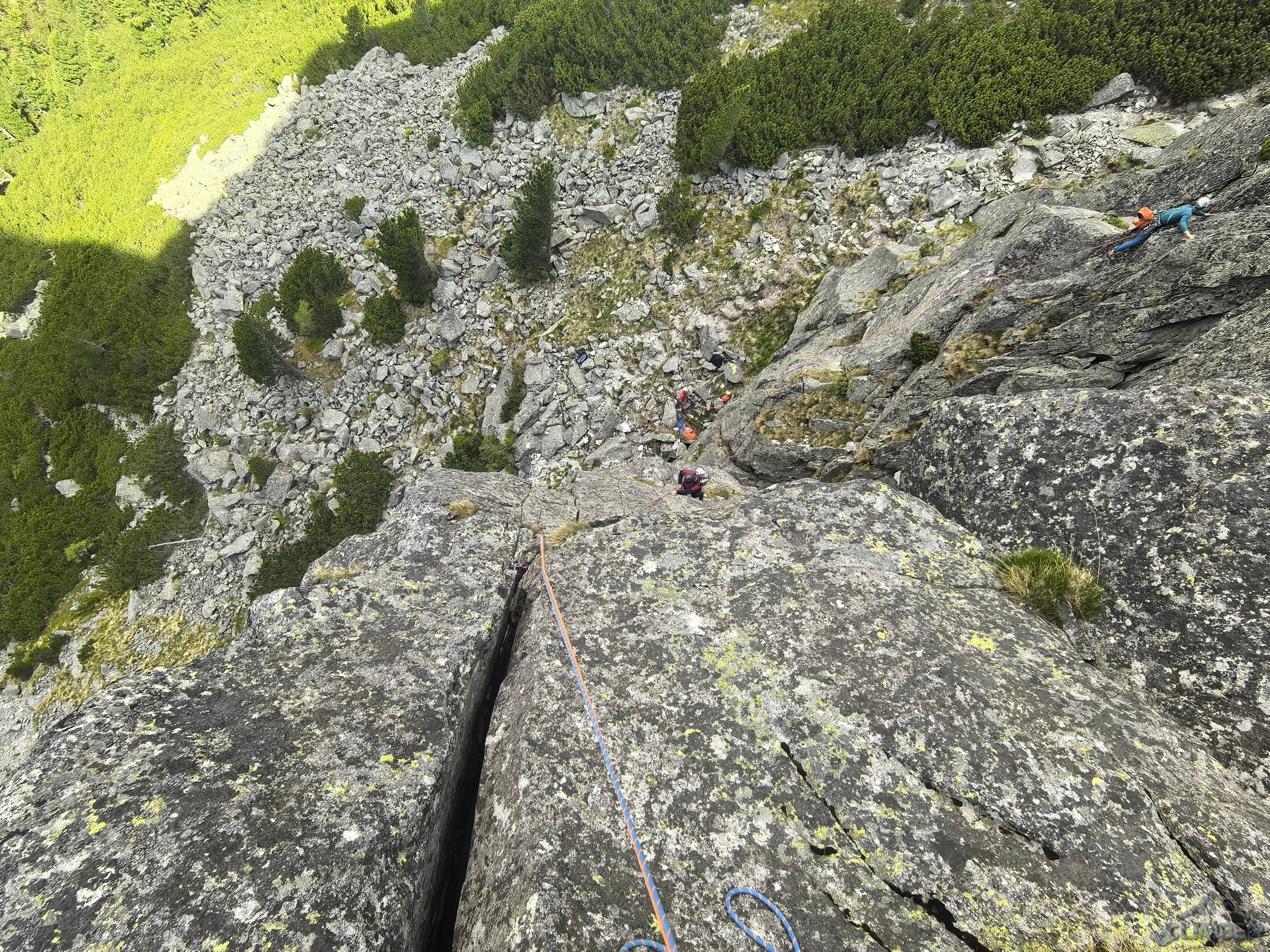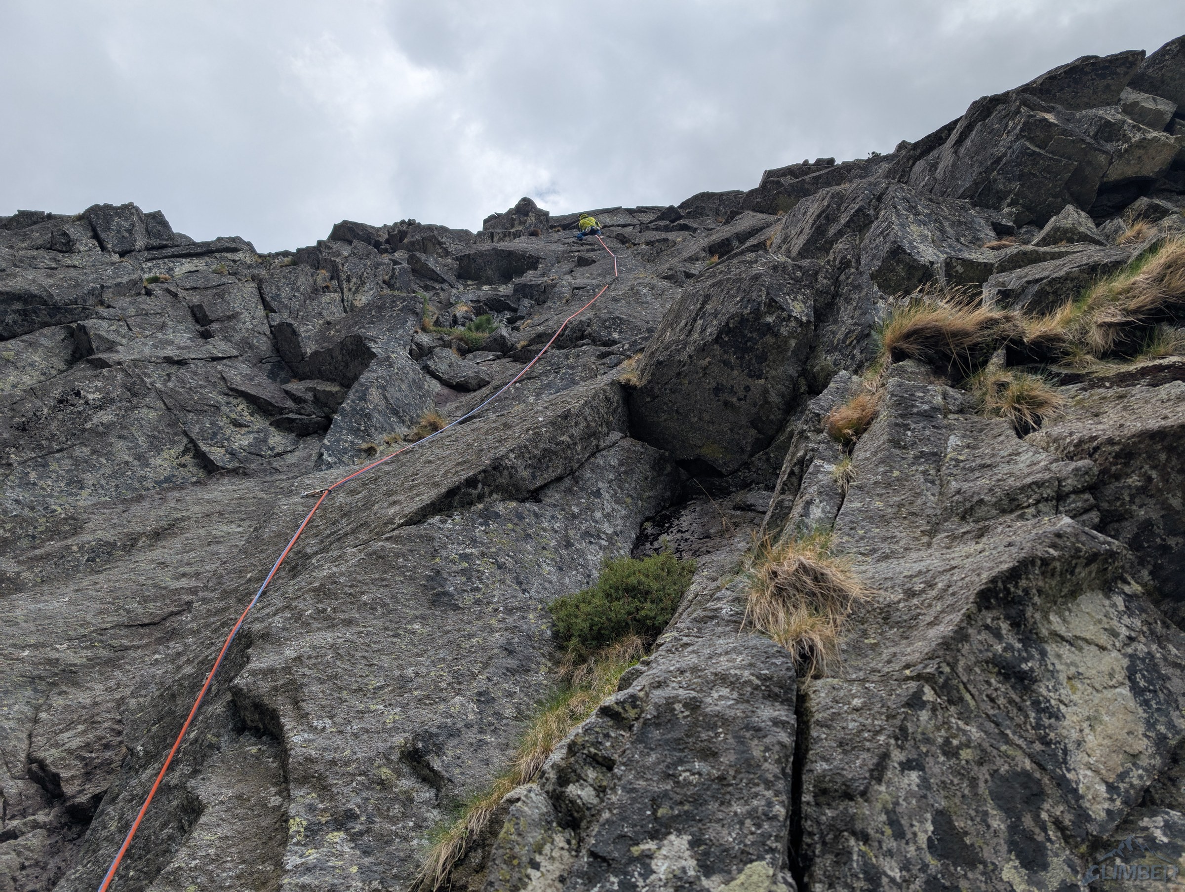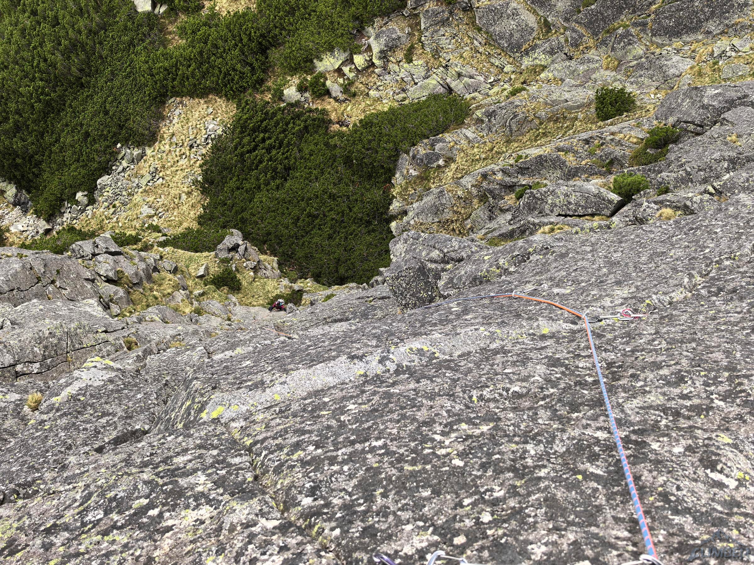 Pierwszy odcinek to urozmaicone 40 metrów wspinania płytami – linię drogi wyznaczają kolejne spity, miejscami trzeba trochę pokombinować i pokonać trudniejsze miejsca (VI+). Drugi odcinek zaczyna się nieco porośniętym ale łatwym połogiem, z którego kierujemy się do zacięcia ze spitami – kilka fajnych ruchów (przystępne jak na VII) i zmierzamy do stanowiska na półce pod wieńczące ścianę kaskadowe przewieszenie na lewo od wielkiej żółtej płyty. Na kluczowym wyciągu (VII+) trudności czekają już na starcie – pokonujemy ściankę z ryską (trudne dojście do spita, warto coś założyć) i wychodzimy na półeczkę pod okapem. Z niej przewijamy się w prawo (nie widać spita) i odbijamy do góry na techniczną ściankę (uwaga – dobra klama się urywa więc bez niej jest nieco trudniej) i mantlujemy na taras wieńczący ścianę. Stąd pozostaje nam do pokonania krótki uskok, po którym grań się wypłaszcza i dochodzi do ścieżki w kosówce – tam najlepiej się rozwiązać i kontynuować do Niżnich Wrótek.