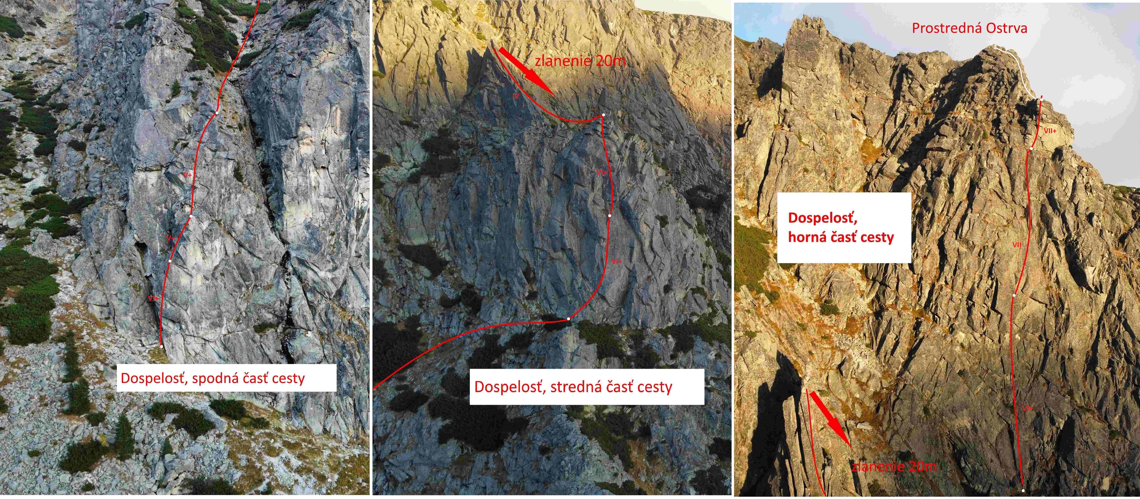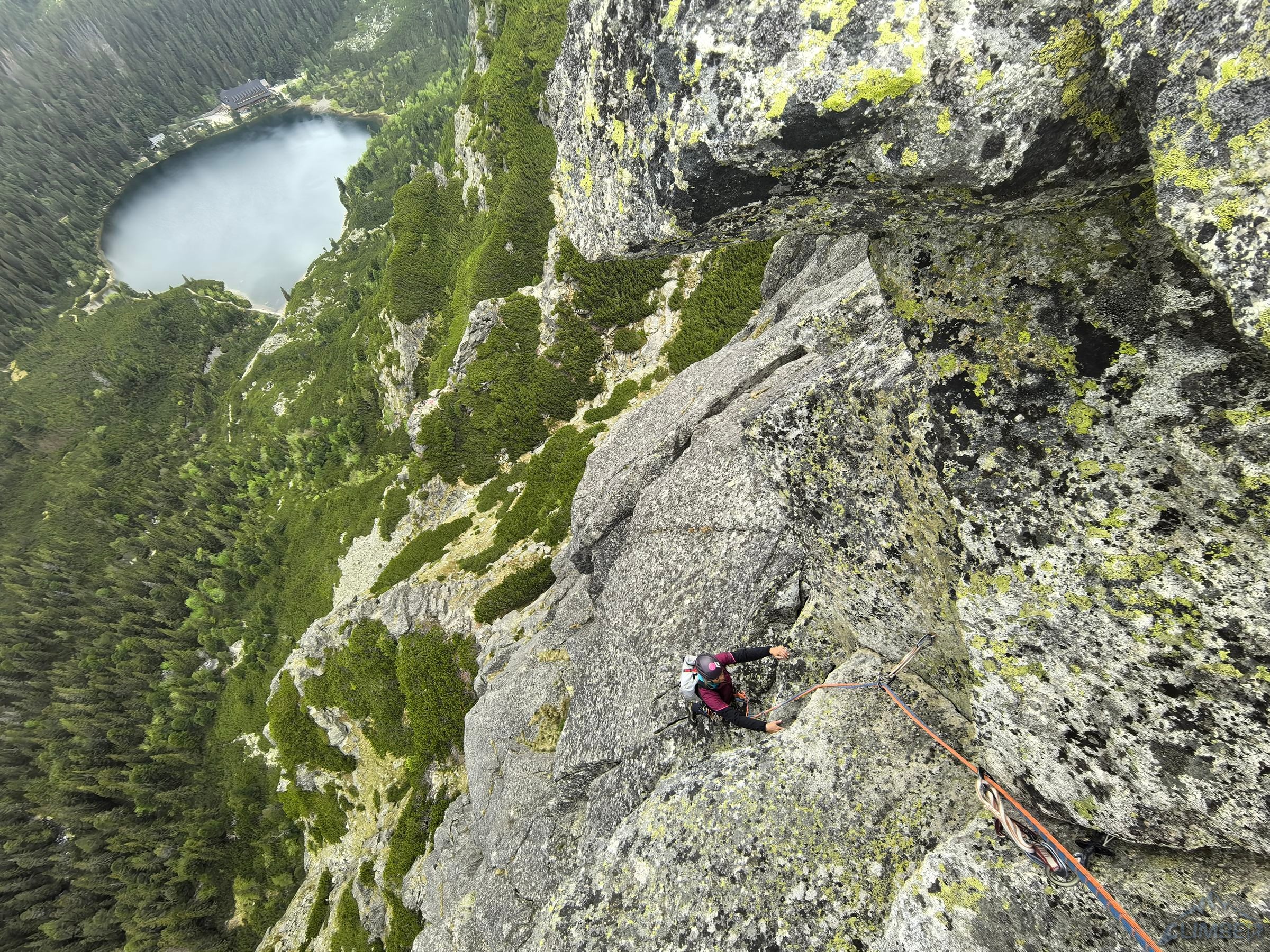 Wyciągi na Galerii Osterwy wciśnięte są nieco na siłę i po namyśle stwierdzam, że lepszym rozwiązaniem byłoby przejście jednej z ładnych linii na Lewej Turni (np. Spravny Cas, Carpe Diem czy Gulliver) – wtedy ze ściany wyjdziemy prosto pod Dzwonem, gdzie Dospelost ma swoją drugą część. Chcąc jednak iść całość „jak należy” startujemy u wylotu komina z lewego skraju Galerii – tam gdzie Pavlin czy AliNina. Nie wchodzimy jednak do komina ale wspinamy się kantem na prawo – wzdłuż kilku widocznych ringów. Przechodzimy siłowego dilferka przez rysę, po którym czeka kilka łatwiejszych ale czujnych metrów i łańcuch na półce już po 20 metrach. Istnieje też prostowanie za VIII (spity po prawej) ale jego wygląd nie zachęca – po pokonaniu okapu czeka gładka porośnięta płyta, gdyby ktoś robił niech się podzieli wrażeniami 😊. Drugi odcinek można by właściwie przejść w ciągu – pokonujemy bowiem krótką płytkę ubezpieczoną dwoma spitami (V+) oraz nietrudną ryskę i docieramy do kolejnego stanowiska. Trzeci wyciąg zaczyna się filarkiem (V+), którym docieramy do pierwszego spita i kontynuujemy nieco kruchym zacięciem w kierunku drugiego. Jeżeli chcemy przedłużyć wspinanie w dolnej części można przejść w lewo na drogę Pavlina – jeżeli nie to wychodzimy płytą w prawo do stanowiska za przełamaniem ściany.