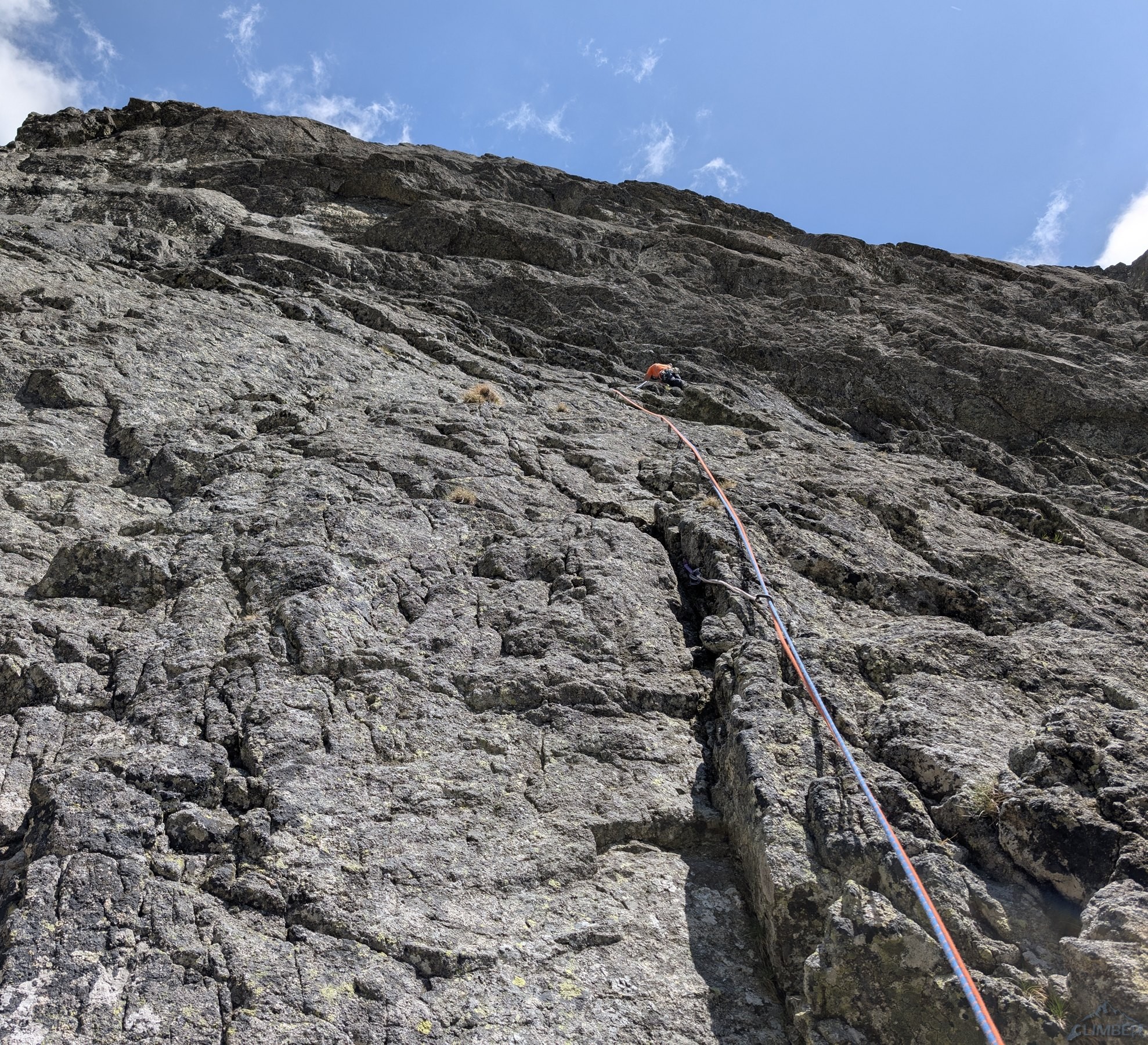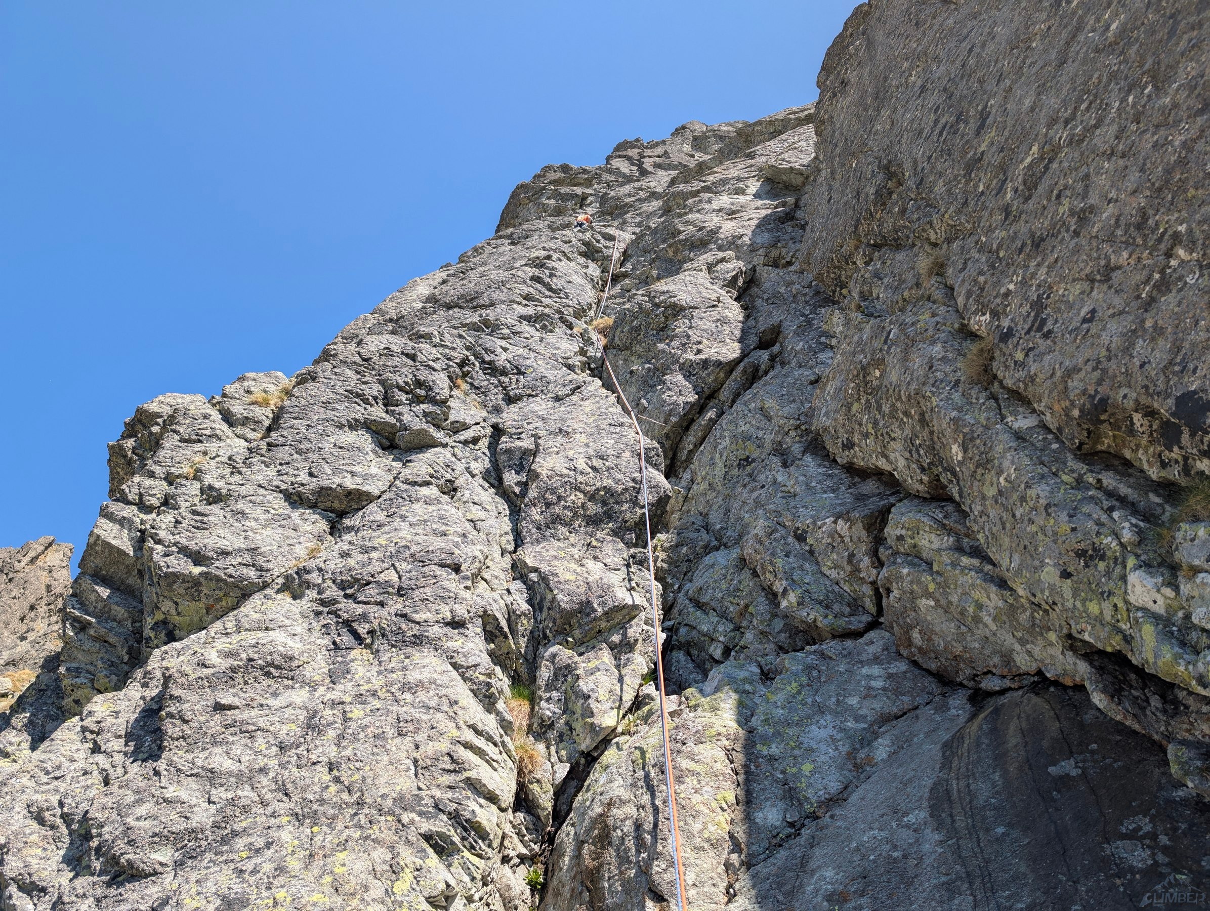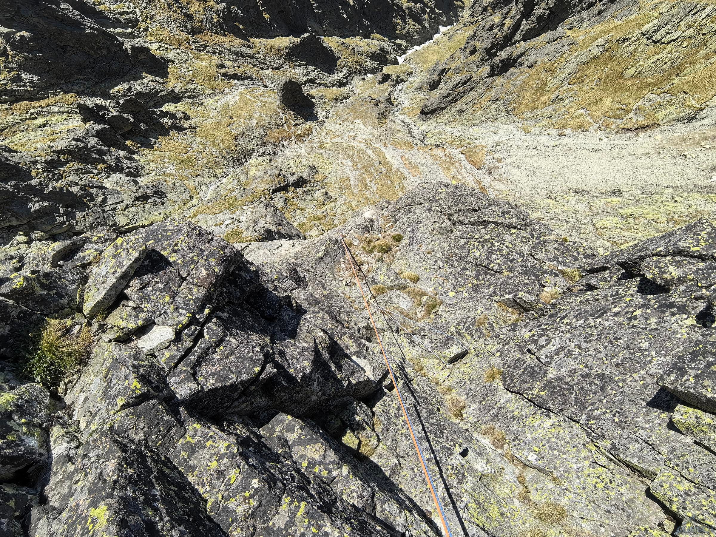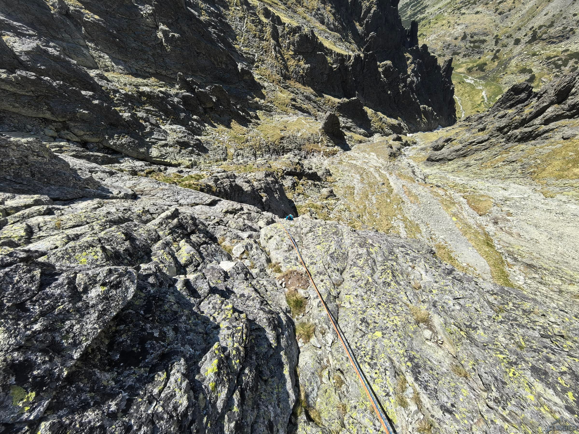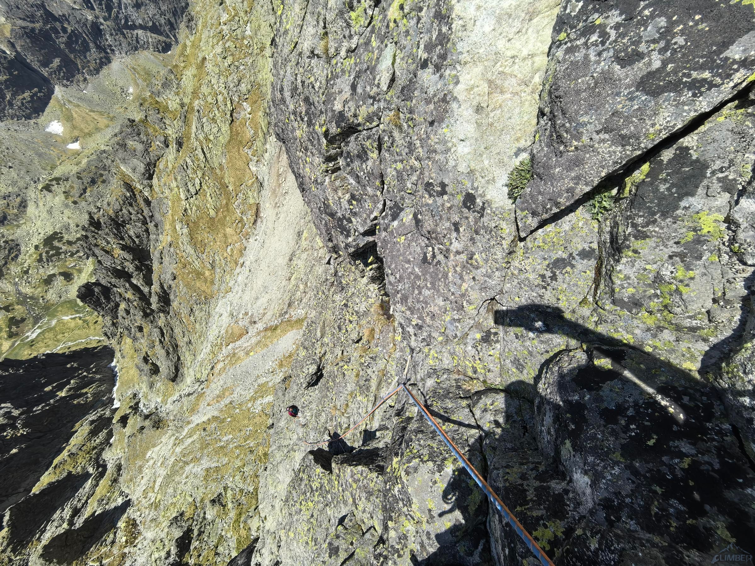 Po powrocie na Granacką Ławkę przechodzimy pod północno-zachodnią ścianę Wielickiej Baszty, która od dawna kusiła swoim efektownym wyglądem, a w zeszłym roku pojawiła się na niej nowa linia ze stanowiskami i kilkoma spitami - Vyhliadkový let (VII). Po 30 metrach wspinania okazuje się jednak, że by dojść do pierwszego spita w trudnościach trzeba pokonać dywan mchu, a wyżej nie wygląda to lepiej. Nie mając szczotki oraz wystarczającej ilości sprzętu i zapasu czasu decyduję, że nie warto ryzykować oraz stresować partnerki i zjeżdżam z taśmy zabezpieczonej kostką. Może kiedyś uda się wrócić, w międzyczasie gdyby ktoś się wybrał proszę o sprzątnięcie sprzętu i podzielenie się wrażeniami z drogi. My tymczasem wracamy na Granacką Ławkę i trawersujemy masyw do końca, po czym schodzimy do Domu Śląskiego – wyszło sporo kilometrów chodzenia i niewiele wspinania ale trzeba było się z tym liczyć wybierając do łańcuchówki niezbyt często powtarzane drogi 😉.