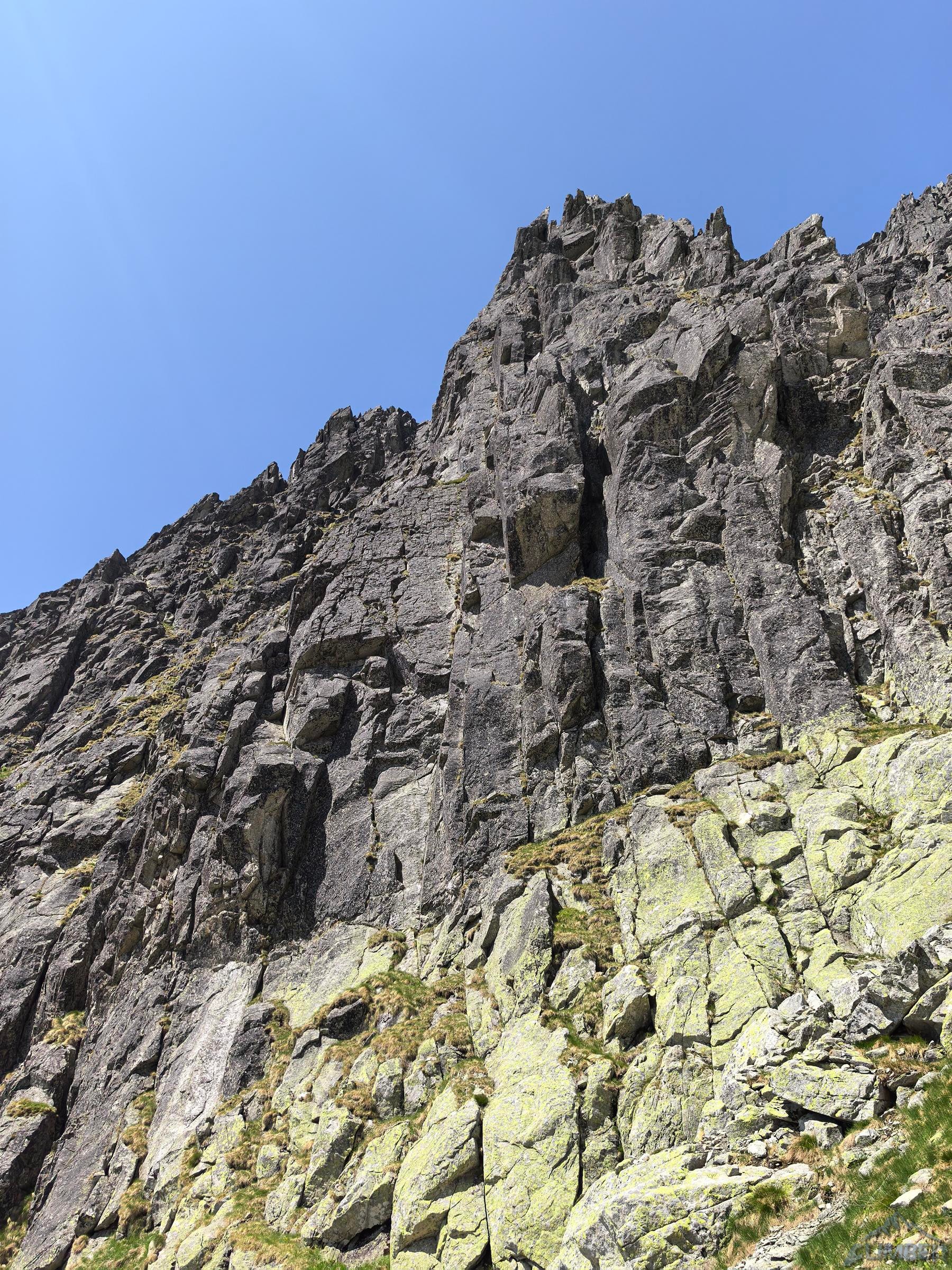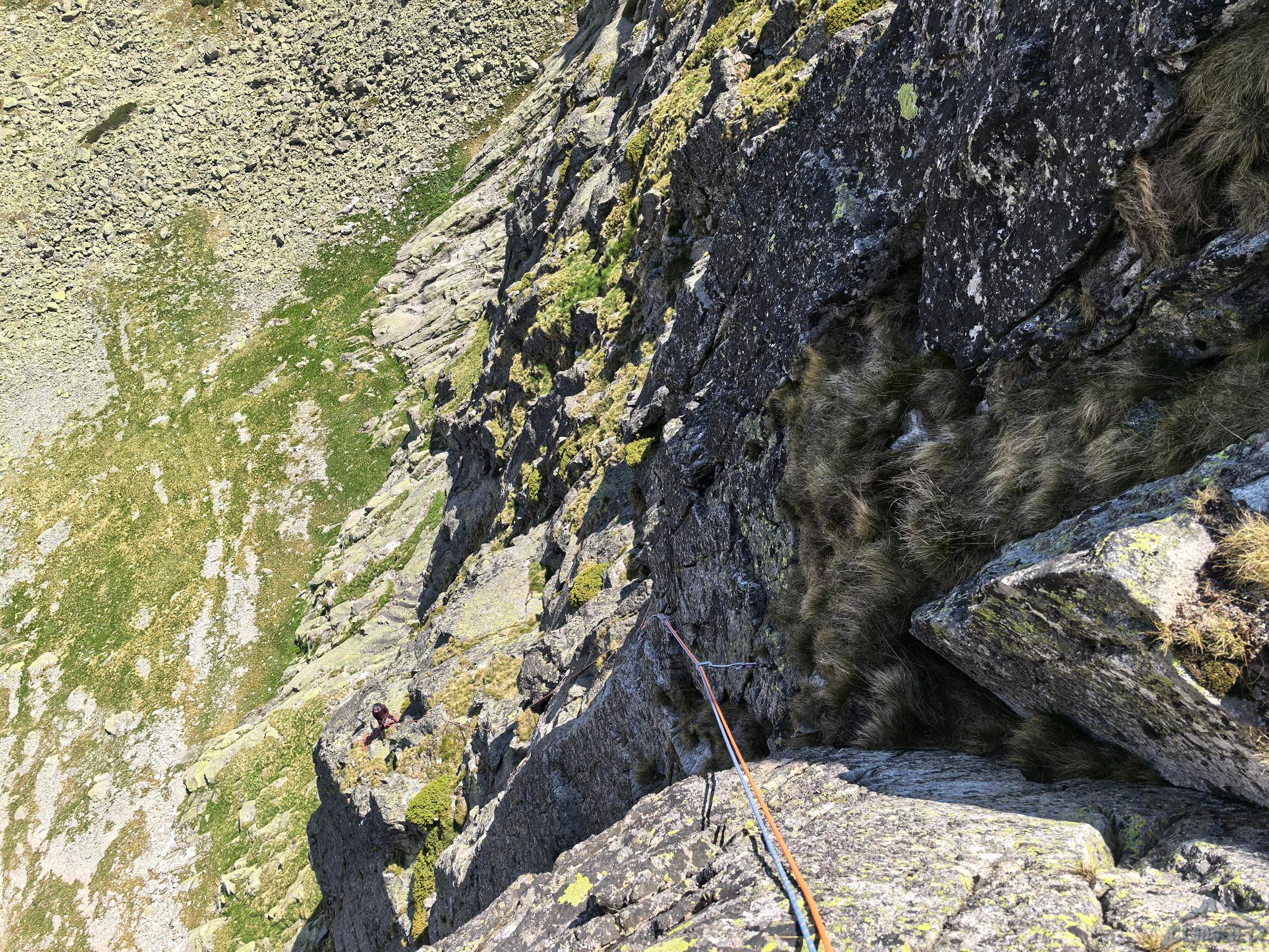 By oszczędzić nogi, drogę pod ścianę skrócić można sobie kolejką – po wyjechaniu pod Solisko czeka nas trawers do Doliny Furkotnej i godzinny spacer z ok. 300m różnicy wysokości na podejściu. Nie startując zbyt późno i nie grzebiąc się spokojnie zdążyć można na kolejkę powrotną (do 16:45) – my nie spełniamy tych warunków, spóźniamy się kilka minut i czeka nas dodatkowa godzina na zejściu 😉. Pod Prawy Filar dotrzeć można trawersując skośnie pod ścianą, wygodniej jednak iść szlakiem aż pod Niżni Wielki Furkotny Staw i przejść w poziomie. Forever Young startuje na trawiastej półce na lewo od wejścia w drogę (ciekawą ale dość porośniętą) Lewa Ściana Prawego Filara i biegnie równolegle do niej – na początku jest spit z karabinkiem.