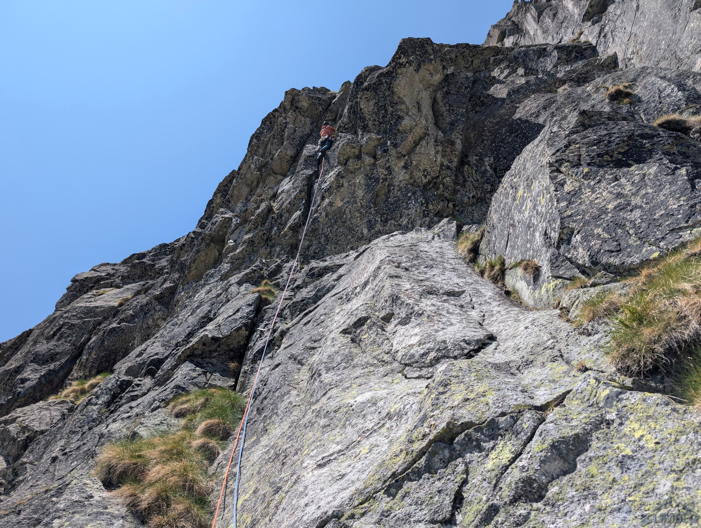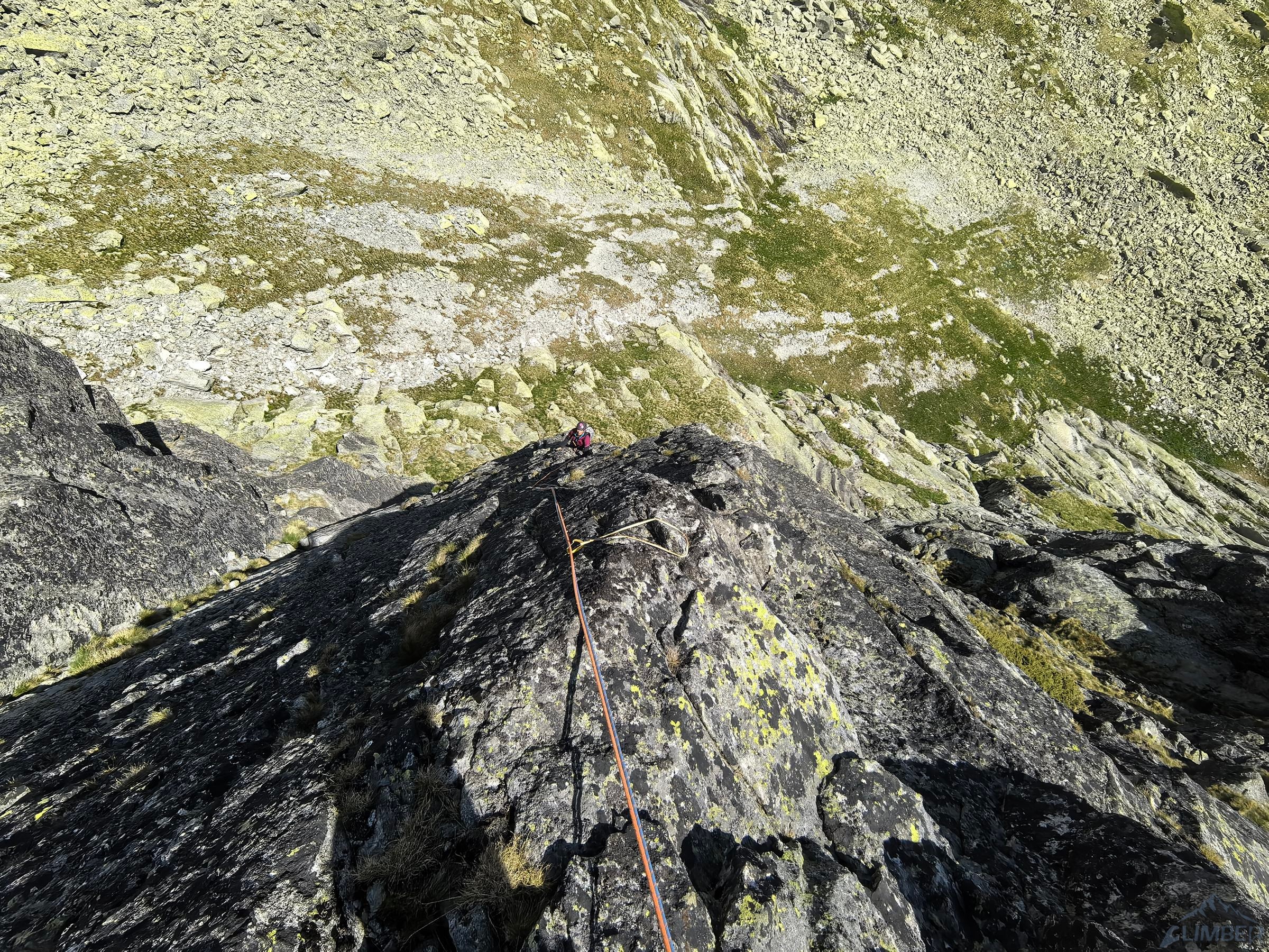 Po ochłonięciu na stanowisku oraz wyproszeniu partnerki żebyśmy mogli kontynuować, ruszamy w drugi wyciąg. Ten na szczęście okazuje się ładny, lity i dobrze asekurowalny – jest co prawda tylko jeden spit ale spora liczba rys umożliwia zakładanie wielu własnych przelotów. Idziemy filarkiem do góry (V+) i odbijamy przy bolcie skośnie w prawo wzdłuż pęknięć (VI+) aż do zacięcia wyprowadzającego na trawiastą półkę. Po podejściu kilkanaście metrów do góry i w lewo (duża kosówka) czeka nas ciekawy okapik (VI-) i stanowisko zaraz powyżej. Trzeci wyciąg również oferuje ciekawe i przyjemne wspinania – idziemy wzdłuż rys po lewej (V) do kantu (widoczny spit) i przewijamy się przez niego na połogą płytkę z krótkim technicznym miejscem (bardziej VI+ niż VII-) ubezpieczonym drugim punktem. Na koniec zostaje nam krótki 15-metrowy wyciąg rozpoczynający się efektownym przewinięciem między przewieszkami z trzema blisko umieszczonymi sptiami. Dobrze balansując czekają nas tylko dwa trudniejsze ruchy (VII) i łatwy odcinek do stanowiska pod zwieńczeniem filara - całość udaje zrobić się więc OS-em.