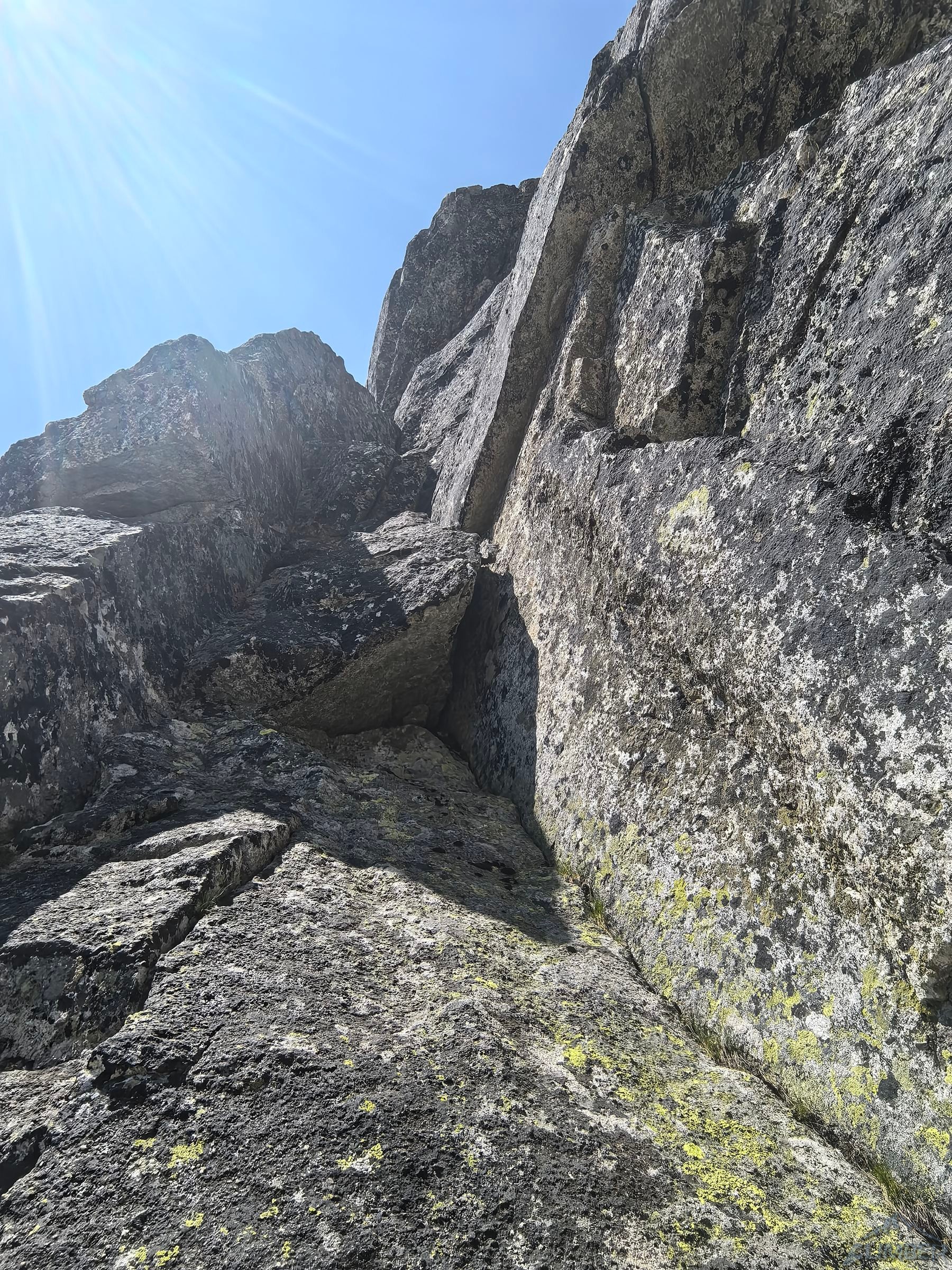 Wspinanie zaczynamy łatwym terenem (IV) w kierunku szerokiej rysy między przewieszkami – pokonanie jej i wejście do zacięcia powyżej to trudności tego wyciągu (VII-, dwa spity). Wyżej czeka kilka łatwych metrów i odbicie w prawo obok kolejnego spita – zdecydowanie warto rozważyć stanowisko pośrednie gdyż jest wygodna półka. Gdy tego nie zrobimy czeka nas w sumie prawie 60 metrów wspinania - jeżeli nie mamy dodatkowego sprzętu (normalnie wystarcza zestaw friendów 0,2-2 i kostki) to czeka nas stres i szarpanie się z liną w dość kruchym terenie pod koniec wyciągu. Stan ten zasugerowali zresztą sami autorzy po naszym przejściu więc jest oficjalne przyzwolenie jeżeli ktoś by miał wątpliwości 😉. Ja jednak idę dalej i po przewinięciu na porośniętą ściankę (VI-) wpadam w tarapaty bo nie mam czym się asekurować, do tego odbijam za wcześnie w lewo i ląduję na półeczce nad którą czeka gładka porośnięta ścianka. Po spędzeniu w tym miejscu pół godziny w końcu zbieram się na odwagę i wracam gdzie trzeba, kosztuje to jednak sporo nerwów zarówno mnie jak i Anię z którą mam tylko radiowy kontakt.