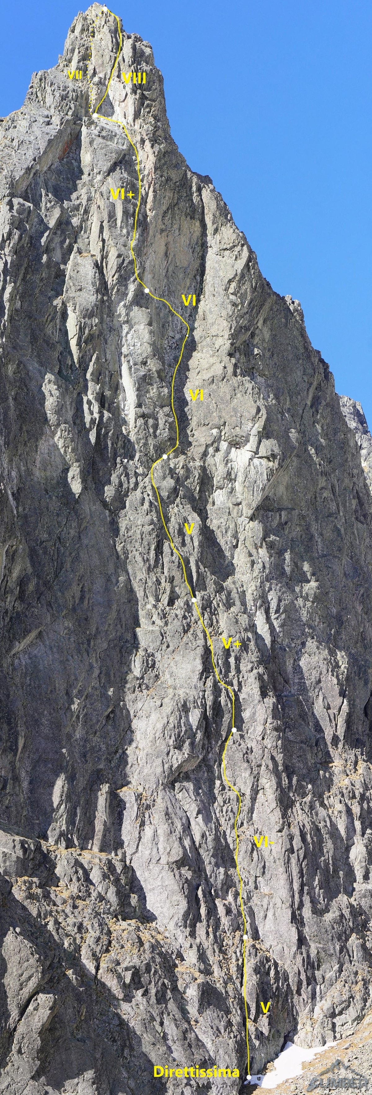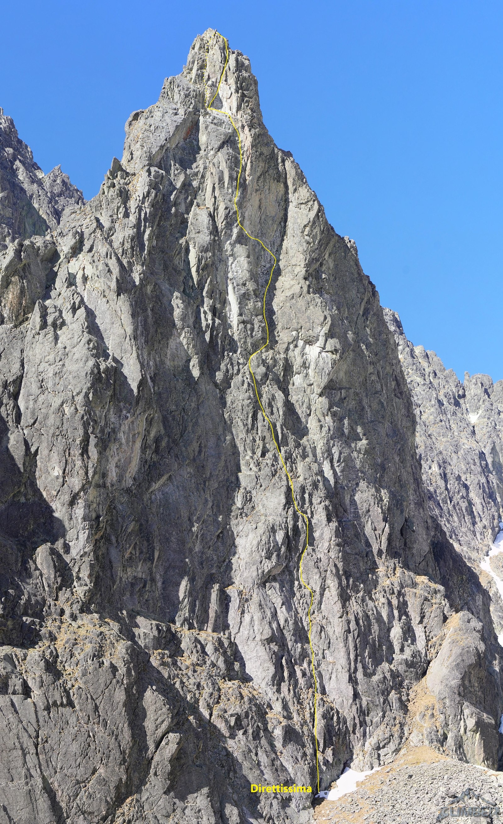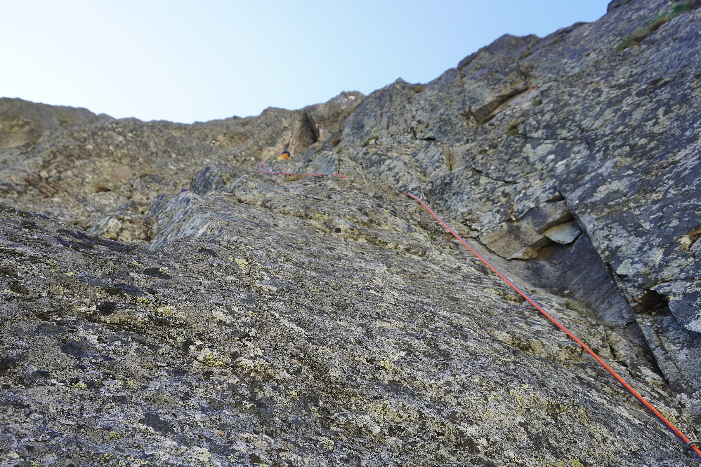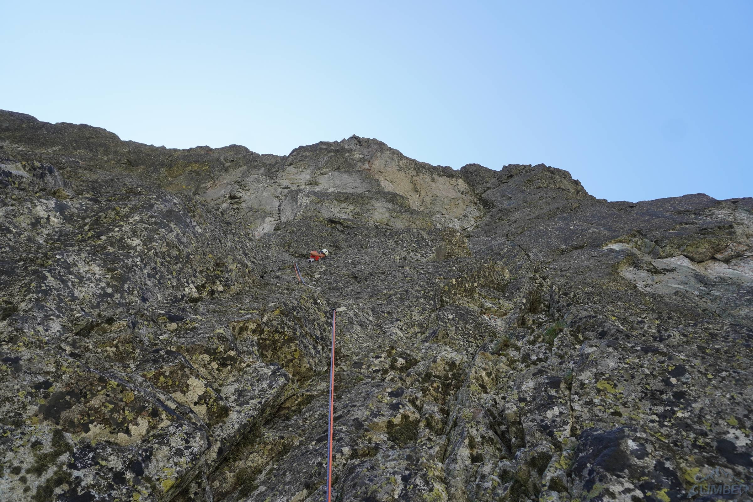 Choć koordynowany przeze mnie obóz klubowy odbywa się nad Popradzkim Stawem, pierwszy dzień jest jednym z najgorętszych w roku – dlatego też z Szymonem nie działamy jeszcze w słonecznej Dolinie Mięguszowieckiej, lecz chowamy się w północnej zerwie Żółtej Ściany. Prawie zawsze zimna i wilgotna tutaj skała jest tego dnia w idealnych warunkach – pojawia się więc świetna okazja by przejść Direttissimę wariantem prostującym Korczaka (VIII). Na drodze jakiś czas temu pojawiły się stałe stanowiska oraz kilka dodatkowych spitów - na „moralnych” piątkach i szóstkach w dolnej części ściany nie trzeba już bać się o życie, a w trudnościach można skupić się na pięknych ruchach. Dzięki temu linia powinna być w miarę regularnie powtarzana i nie popaść w zapomnienie – brawo dla zdrowego podejścia osób myślących o innych wspinaczach!