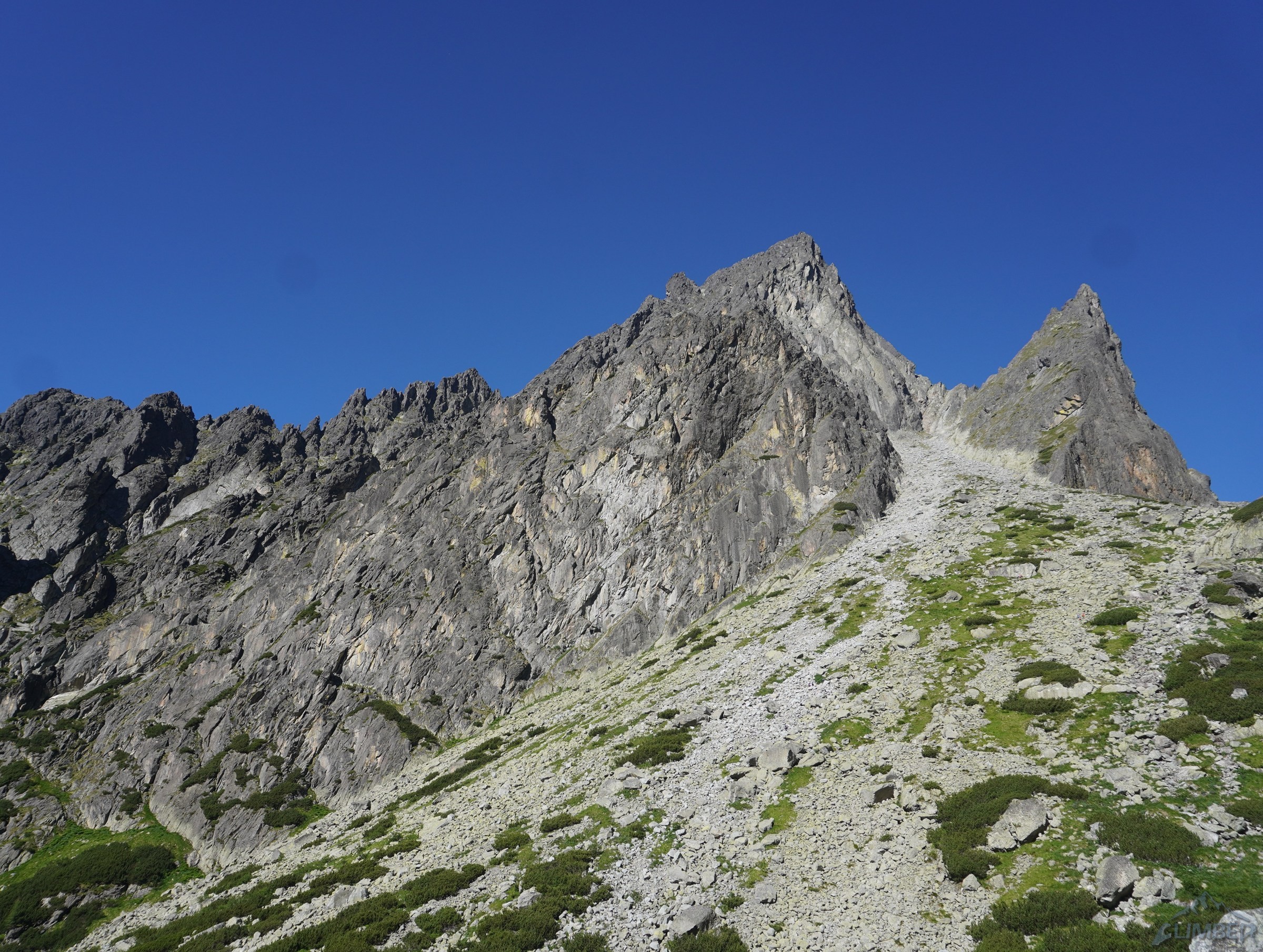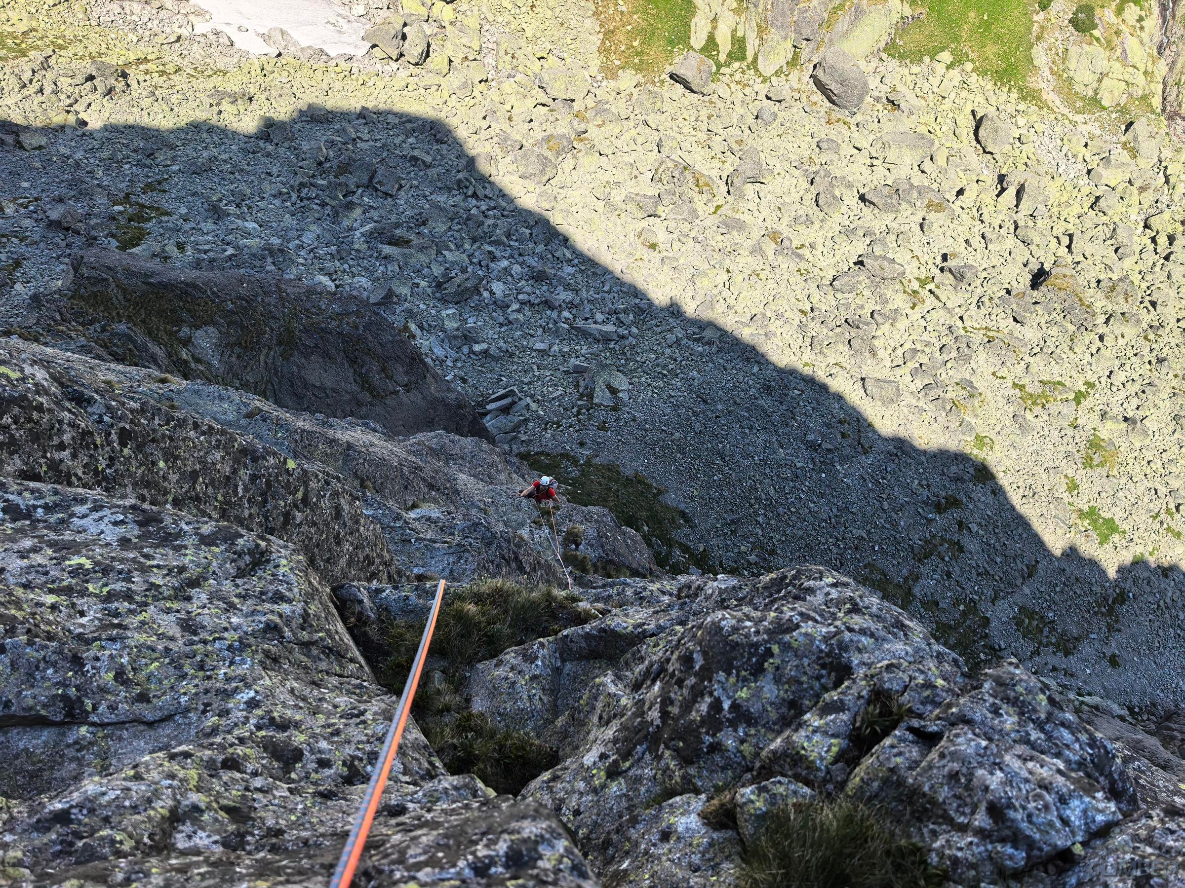Z wierzchołka teoretycznie można zjechać – zejście jest jednak szybkie i wygodne, czy to na prawo przez Przełączkę pod Żółtą Ścianą, czy w lewo na dół do siodełka z którego dwa zjazdy żlebem po 50m (lub zejście II-III) do piargu opadającego spod Pośredniej Grani. Wybieramy drugie rozwiązanie licząc jeszcze na zrobienie dodatkowej drogi na Małej Żółtej Ścianie ale na to brakuje już sił i czasu – chcemy jeszcze przed nocą dołączyć do reszty klubowiczów w Schronisku nad Popradzkim Stawem. Dodam jeszcze, że na drogę wystarczy w zupełności standardowy zestaw friendów do #2 + kości, młotka używaliśmy tylko do dobijania haków.