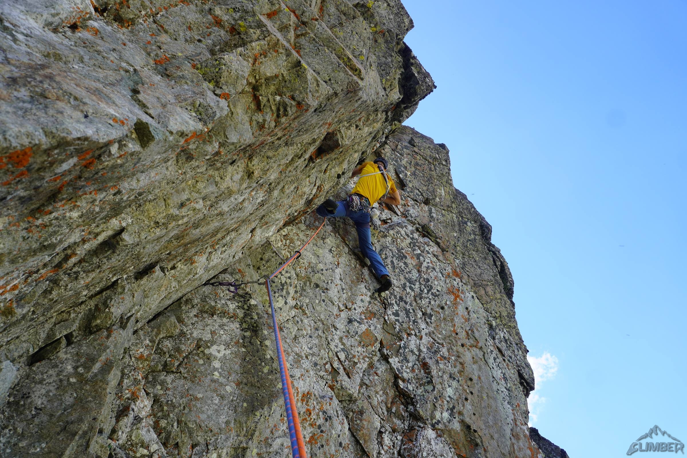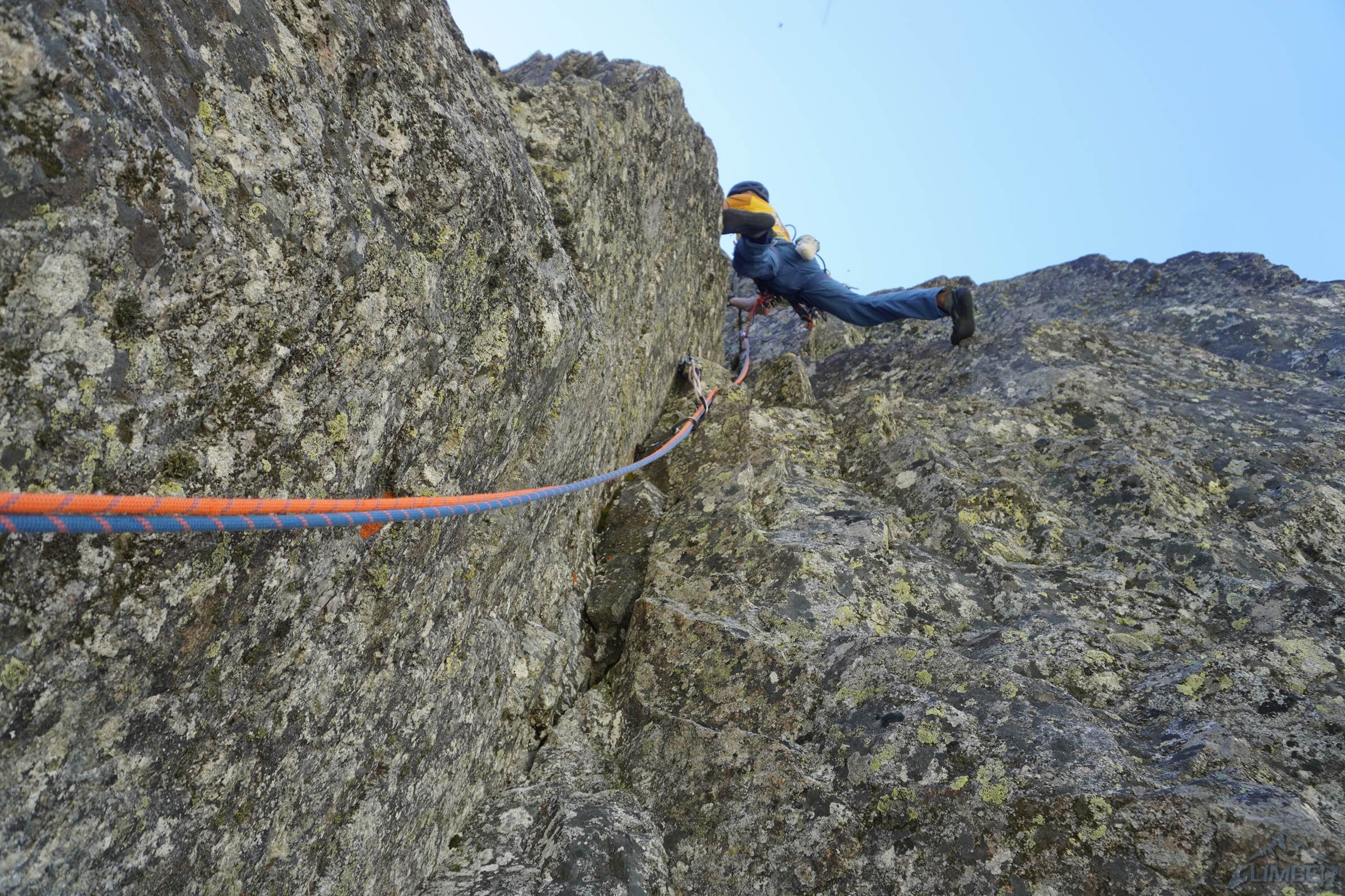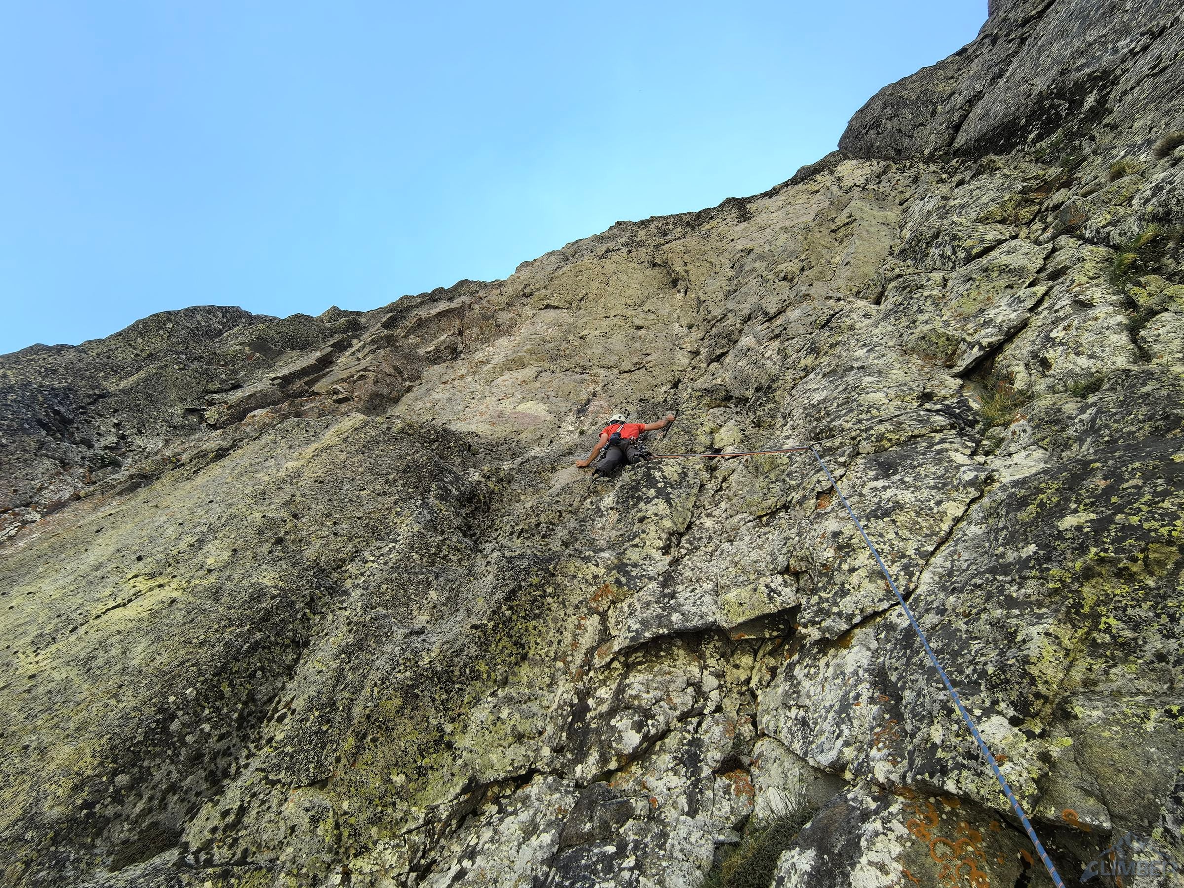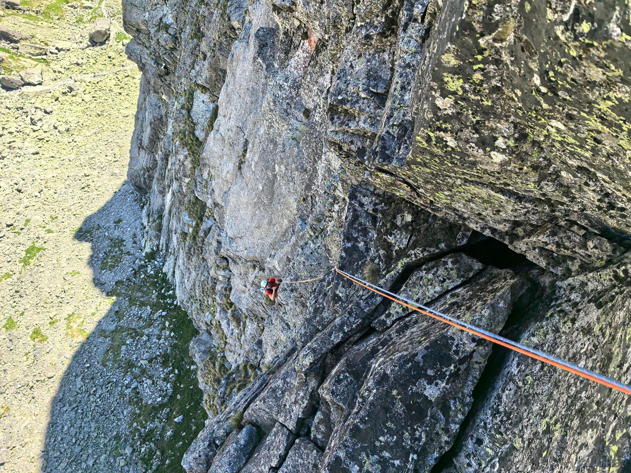 Kolejny wyciąg jest bardzo efektowny i w ciągowych szóstkowych trudnościach (do tego są miejsca z mocnym VI+) – przewijamy się na powietrzny przewieszony kant i kontynuujemy nim przez kolejne uskoki wzdłuż haków do ostatniego wymagającego miejsca (spit), po którym wychodzimy na taras pod ścianką szczytową. Nowe stanowisko jest po prawej (pod kątem zjazdu), my jednak dochodzimy do wniosku że w kolejny wyciąg lepiej startować ze stanu z haków po lewej – zarówno w wariant siódemkowy (filarkiem wzdłuż haków), jak i ósemkowy (przewieszonym zacięciem z rysą). Świetna asekuracja (dwa spity i super rysa na friendy) przekonuje mnie do spróbowania prostowania OS-em, bulderowy charakter cruxa powoduje jednak że źle odczytuję ruchy na wyjściu z trudności i zawisam. Po dopracowaniu patentów wstawiamy się z Szymonem na zmianę – druga próba kolegi okazuje się skuteczna, z dużą pomocą rękawiczek do rys które dość przypadkowo zabraliśmy 😊. Dodam tylko, że sekwencję rodem z bulderowni na wyjściu z przewieszonego zacięcia 200 metrów nad ziemią śmiało dopisać można do grona taternickich perełek – już tylko dla tego miejsca warto się tutaj wybrać! Po pokonaniu trudności dojście do stanowiska to już formalność – dwa ostatnie spity znajdziemy na szczycie po przejściu piątkowego zacięcia. Wspinanie zakończyć można też wspomnianym oryginalnym wariantem wprost (VII) lub obejściem z Cagasika po lewej (V).