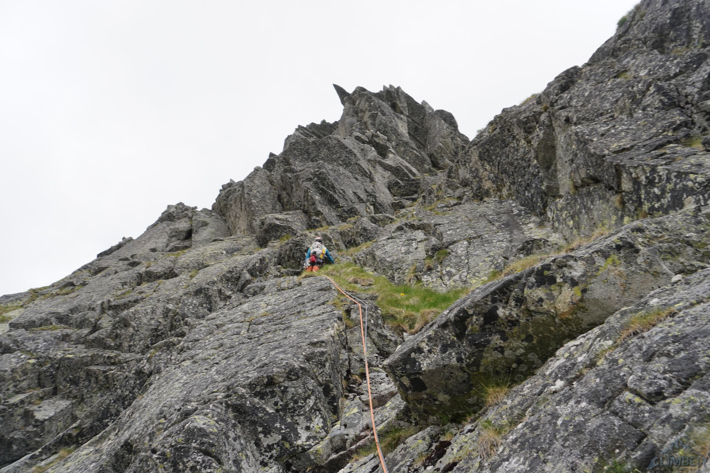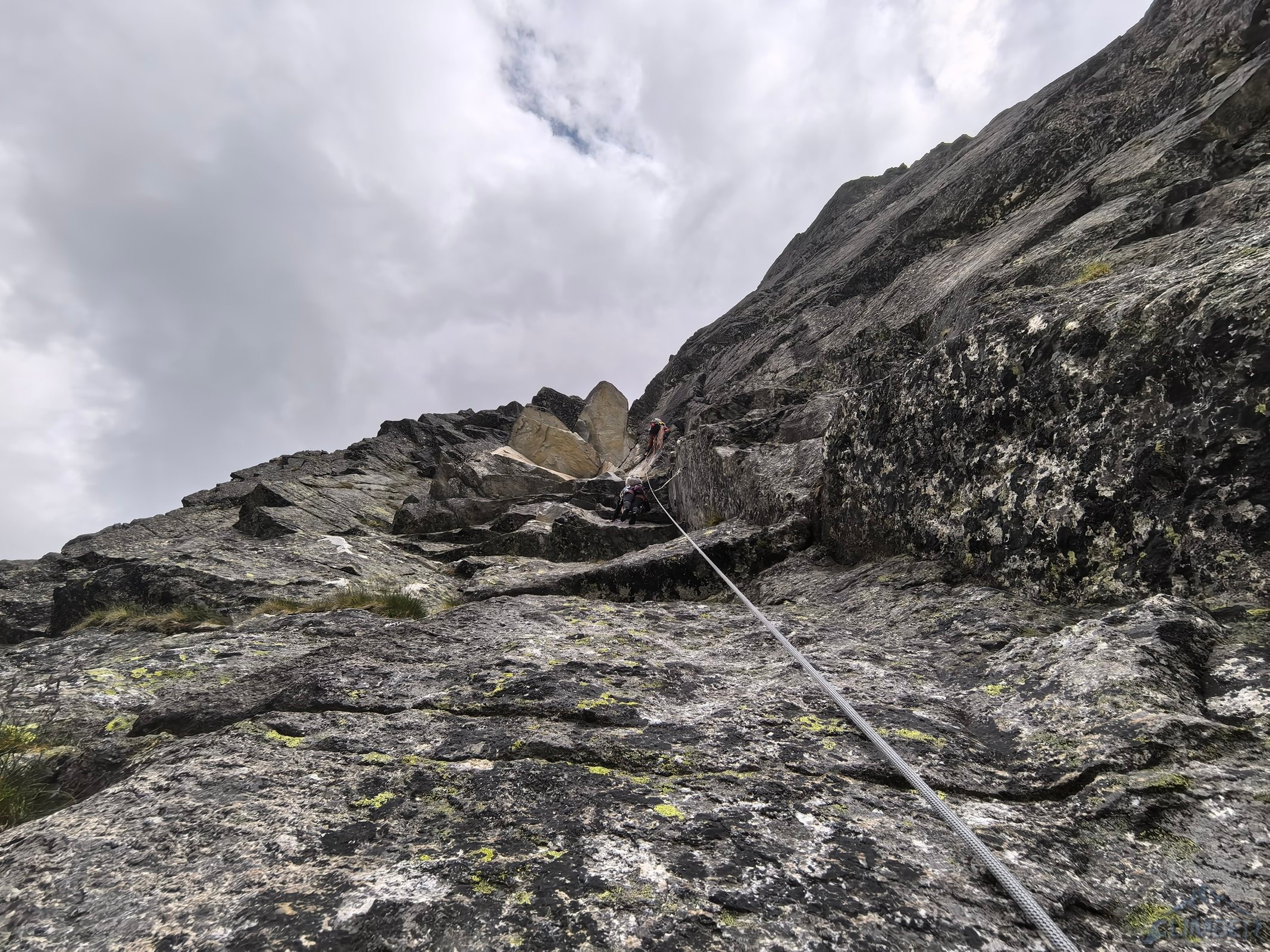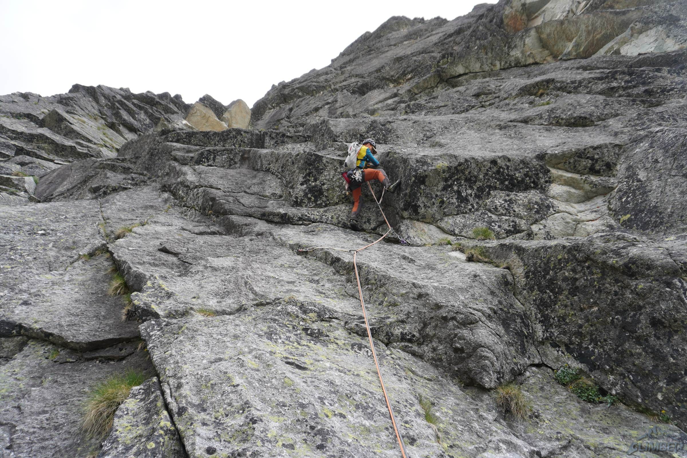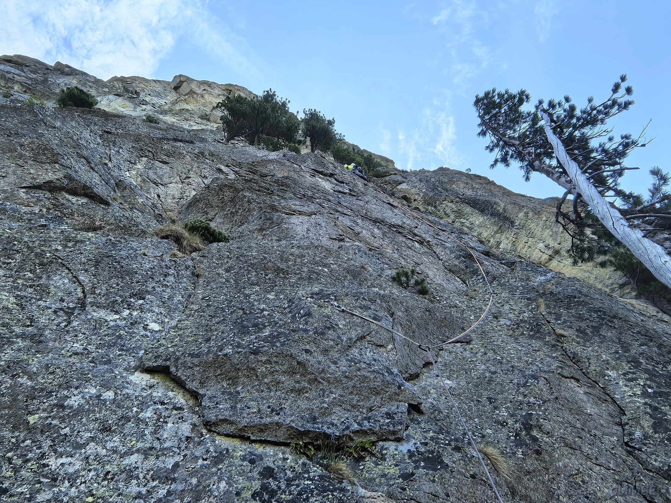 Droga startuje ok. 50 metrów od wejścia w Veličkov Kut, który robiłem zresztą (RELACJA) w podobnej kombinacji do tej zaplanowanej na dziś, z Siarkańską Granią i Drogą Motyki na zachodniej ścianie Szarpanych Turni – opcji na linkowanie jest oczywiście więcej, polecam 😊. Wspinanie na Dragonline zaczynamy u podstawy ściany, pod płytą z mchem lub z poziomej trawiastej półki zaraz nad nią. Przechodzimy filarkiem do systemu wyraźnych zacięć (III/IV) którymi kontynuujemy aż do stanowiska zlokalizowanego na balkonie pod okapem. Znajdziemy tutaj łańcuch zjazdowy, podobnie jak na każdym kolejnym stanowisku – dzięki temu orientacja jest znacznie łatwiejsza. Drugi wyciąg (III) to najmniej ciekawy i przyjemny odcinek drogi – obchodzimy okap trawnikiem w lewo i trawersujemy przez kruchy teren (który ucierpiał z powodu obrywu powyżej) w prawo, po czym wąską połogą płytą z rysami wprost do widocznego powyżej stanowiska.