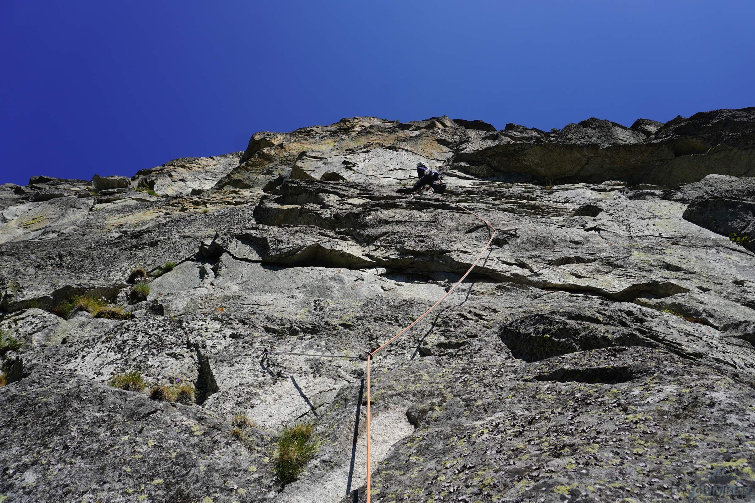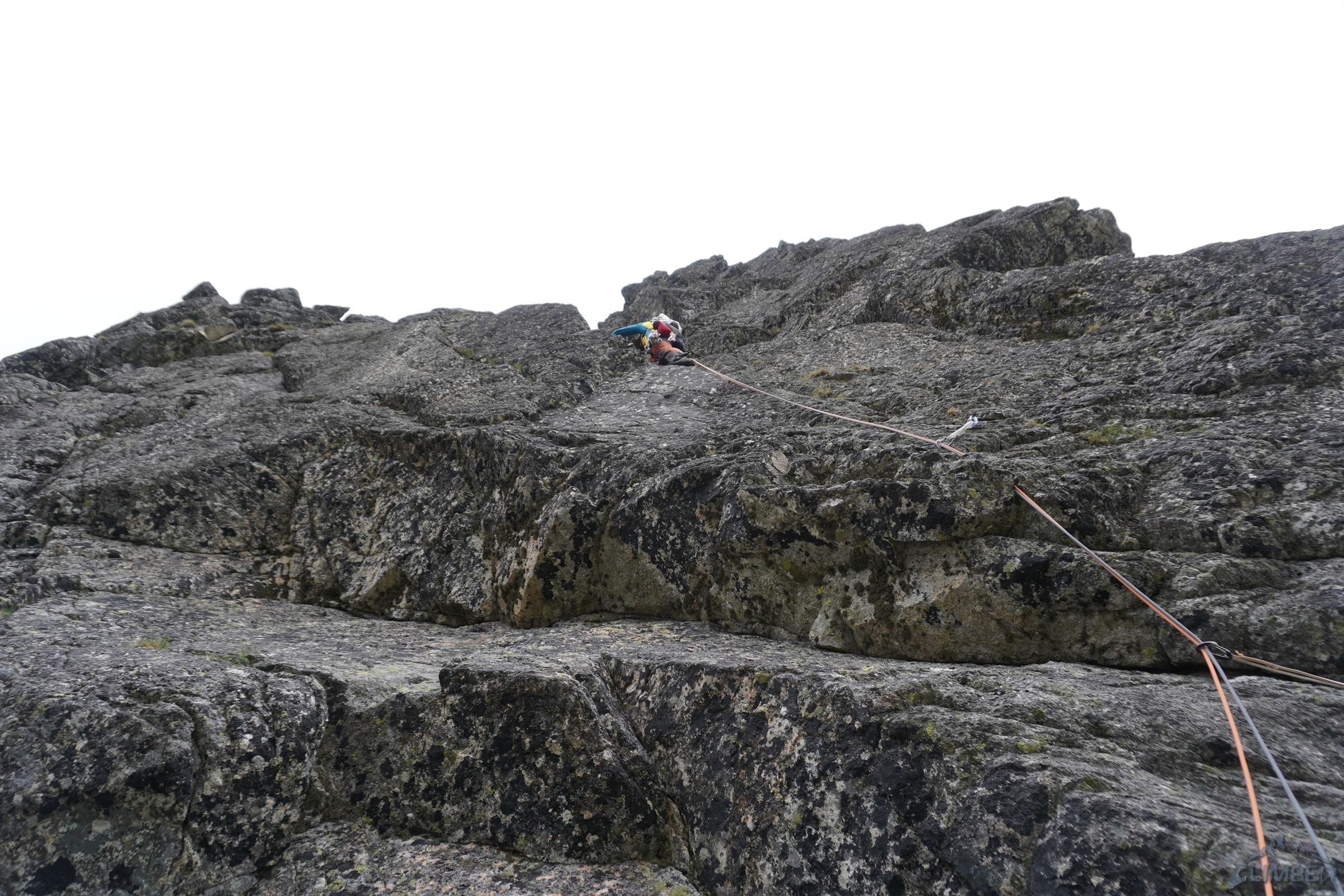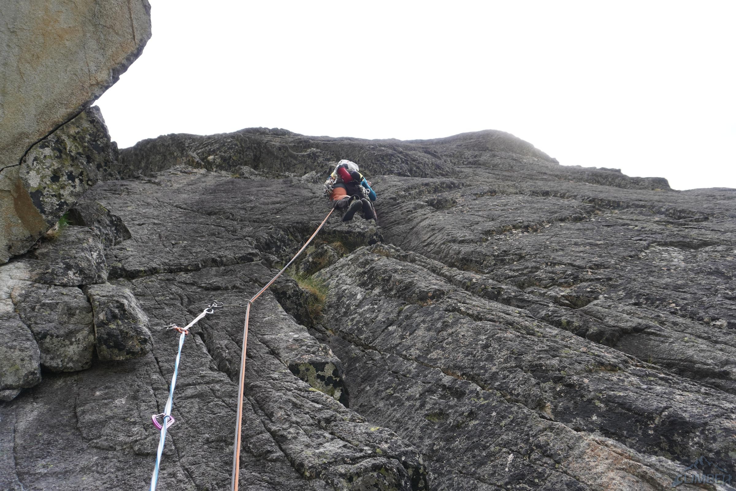 Kluczowy czwarty wyciąg zaczynamy od pokonania szerokiej rysy na prawo od stanowiska (V+), po wyjściu z niej trawersujemy mocno (uwaga na przesztywnienie!) w prawo i lekko w dół by w najbardziej dogodnym miejscu wejść w niewyraźną rysę rozszerzającą się wyżej – ponownie asekurujemy się z małego frienda/kostki (lub bijemy haka) i ostrożnie pokonujemy wymagający (VII-) odcinek. Zmęczony i z bolącymi stopami w sportowych butach szczerze ucieszyłem się że Bartek prowadził ten wyciąg 😉 – jest bowiem całkiem sprężny, a skała porośnięta. Wyżej trudności odpuszczają (VI), na koniec czeka jednak czujny trawers w lewo do łańcucha.