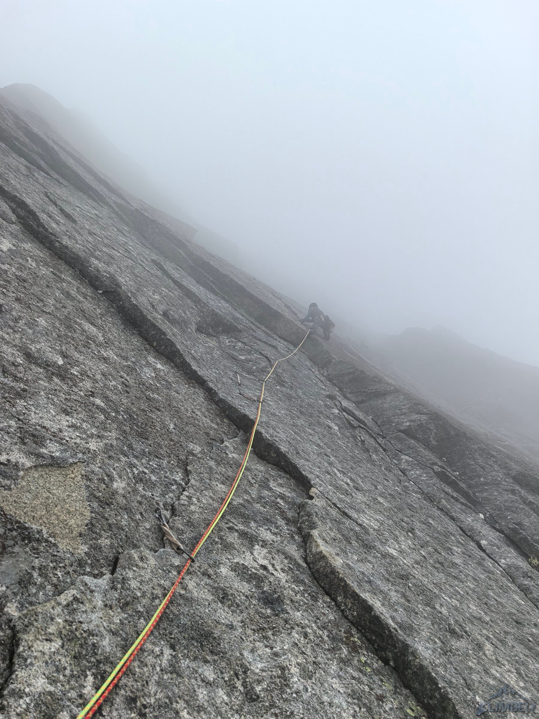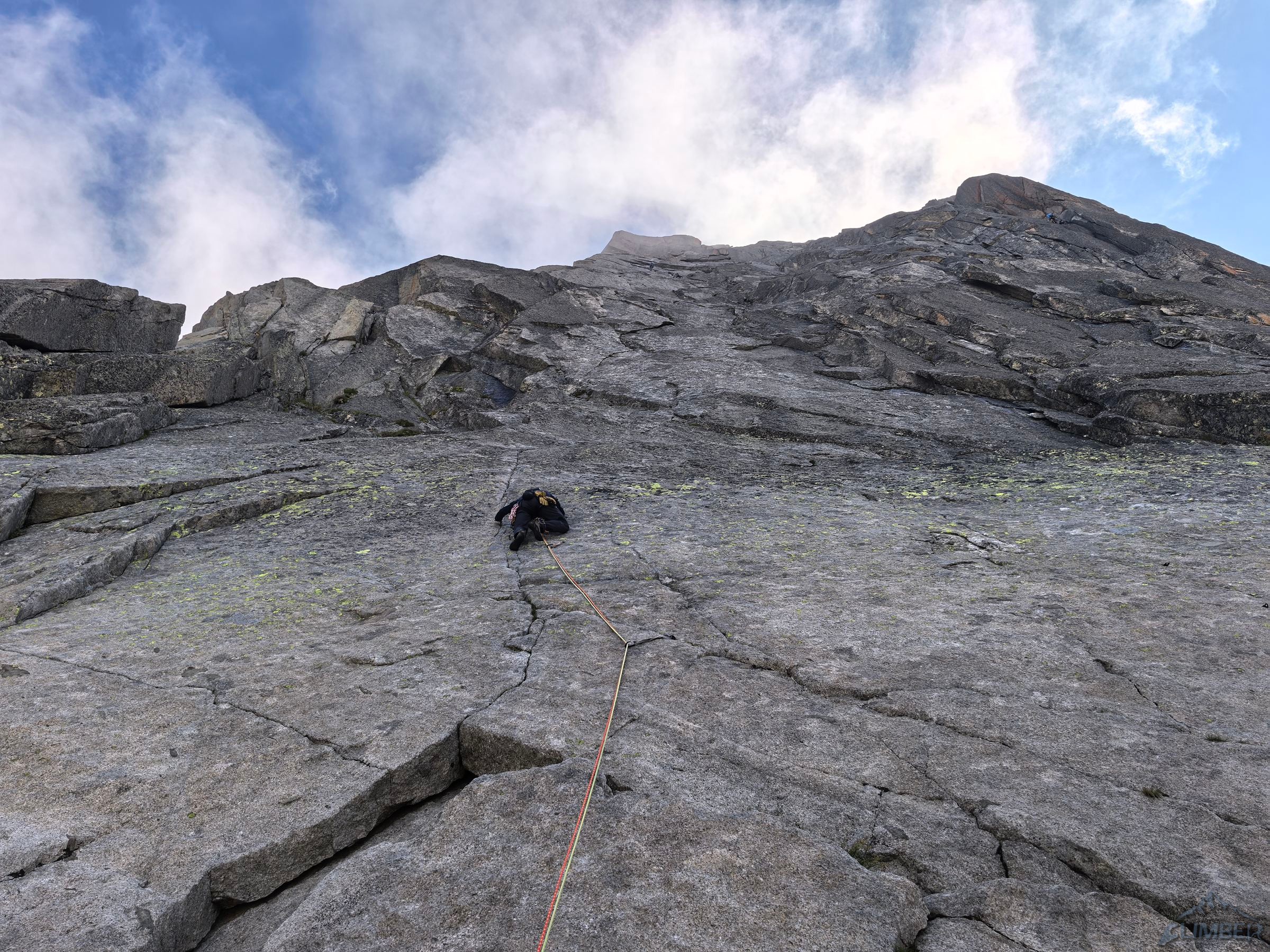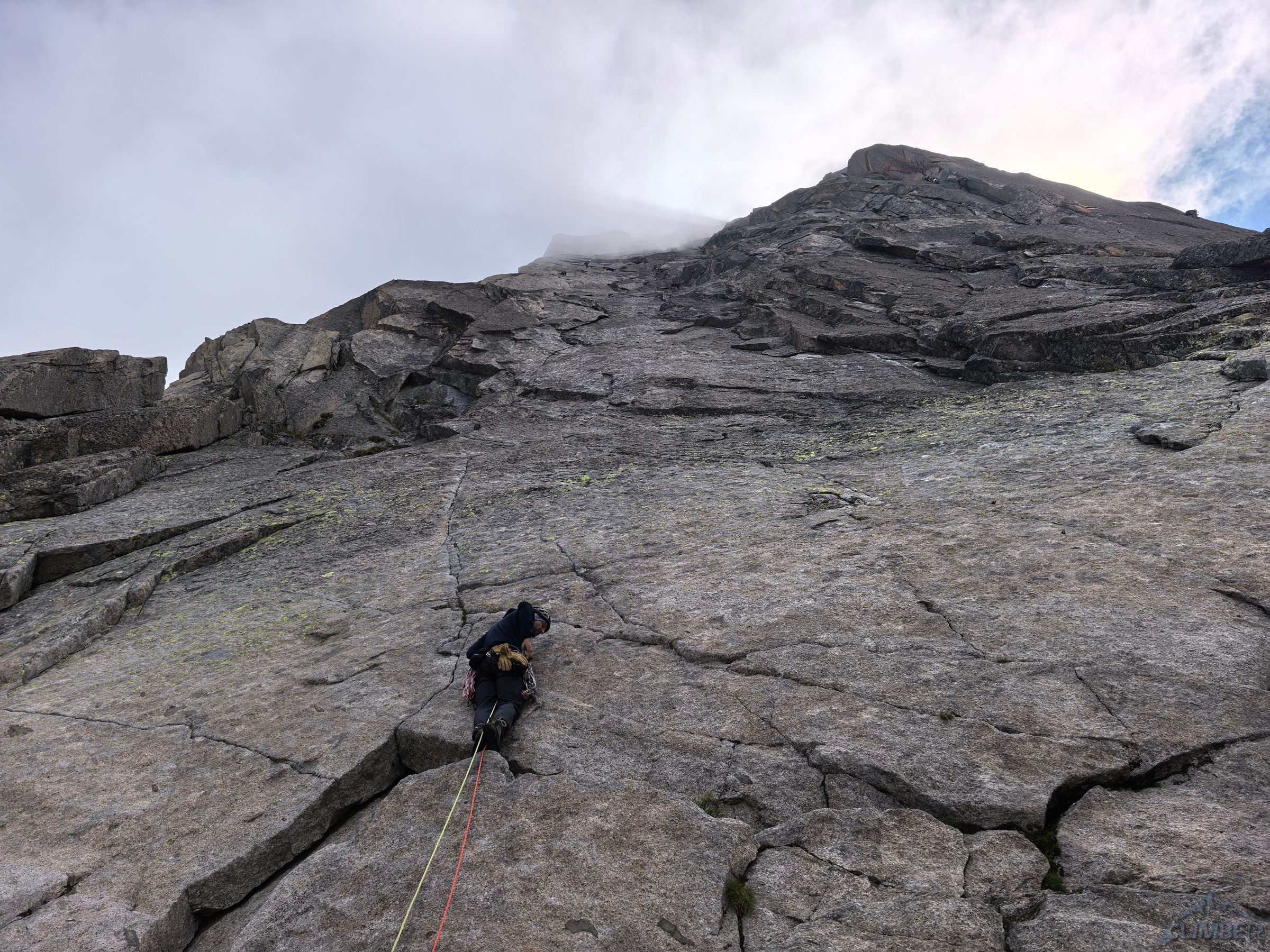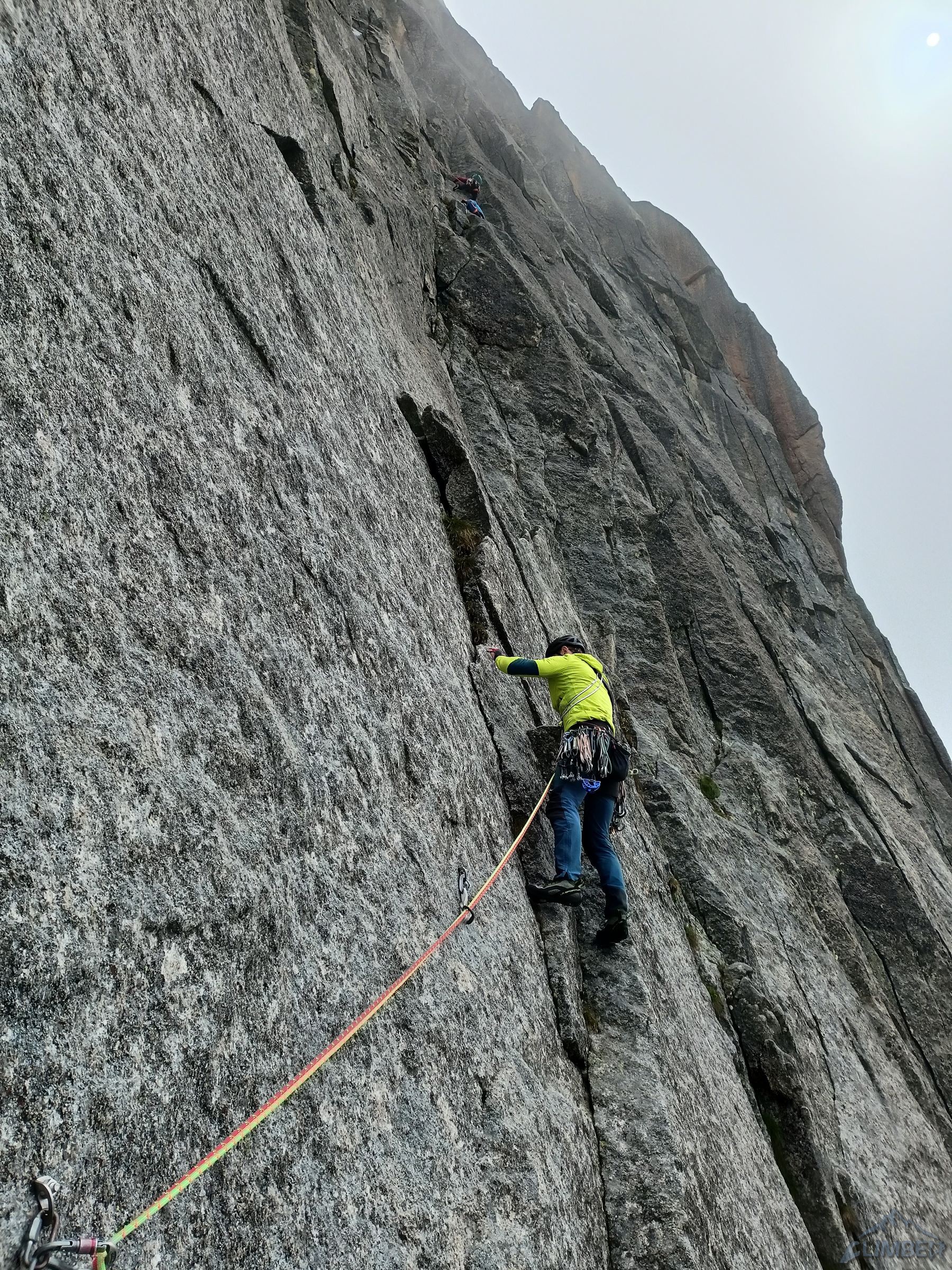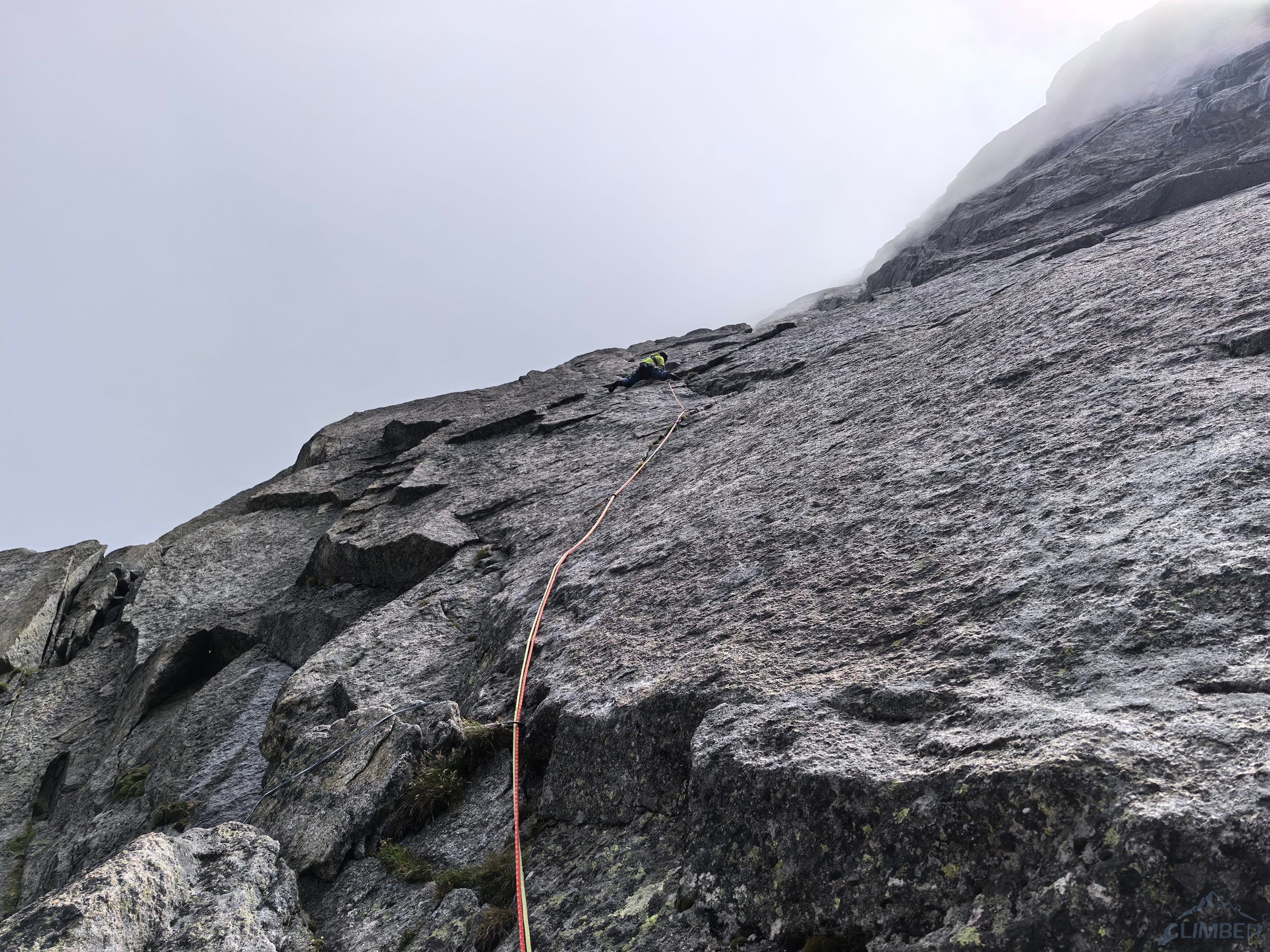 Na czwartym odcinku (5c) prowadzenie przejmuje Bartek – wąskie zacięcie zaraz po prawej (nie idziemy za daleko do widocznego tam spita z innej drogi) prowadzi do trikowego miejsca w płycie, z której wychodzimy na mały taras i kontynuujemy wzdłuż pęknięć do stanowiska. Choć pogoda cały czas się pogarsza, liczymy że dociągniemy do końca. Piąty wyciąg (6b) w tych warunkach okazuje się jednak wymagający – po czujnym starcie czeka dość skomplikowany bulder ubezpieczony spitami. Zamarzając na niewygodnym stanie przyglądamy się patentowaniu Bartka – jest rozgrzany więc zmienianie go wydaje się bez sensu, dopiero jednak przy trzecim podejściu udaje mu się uporać z trudnościami i dostać do ładnej rysy nad okapikiem, która doprowadza do zacięcia i stanowiska w nim.
