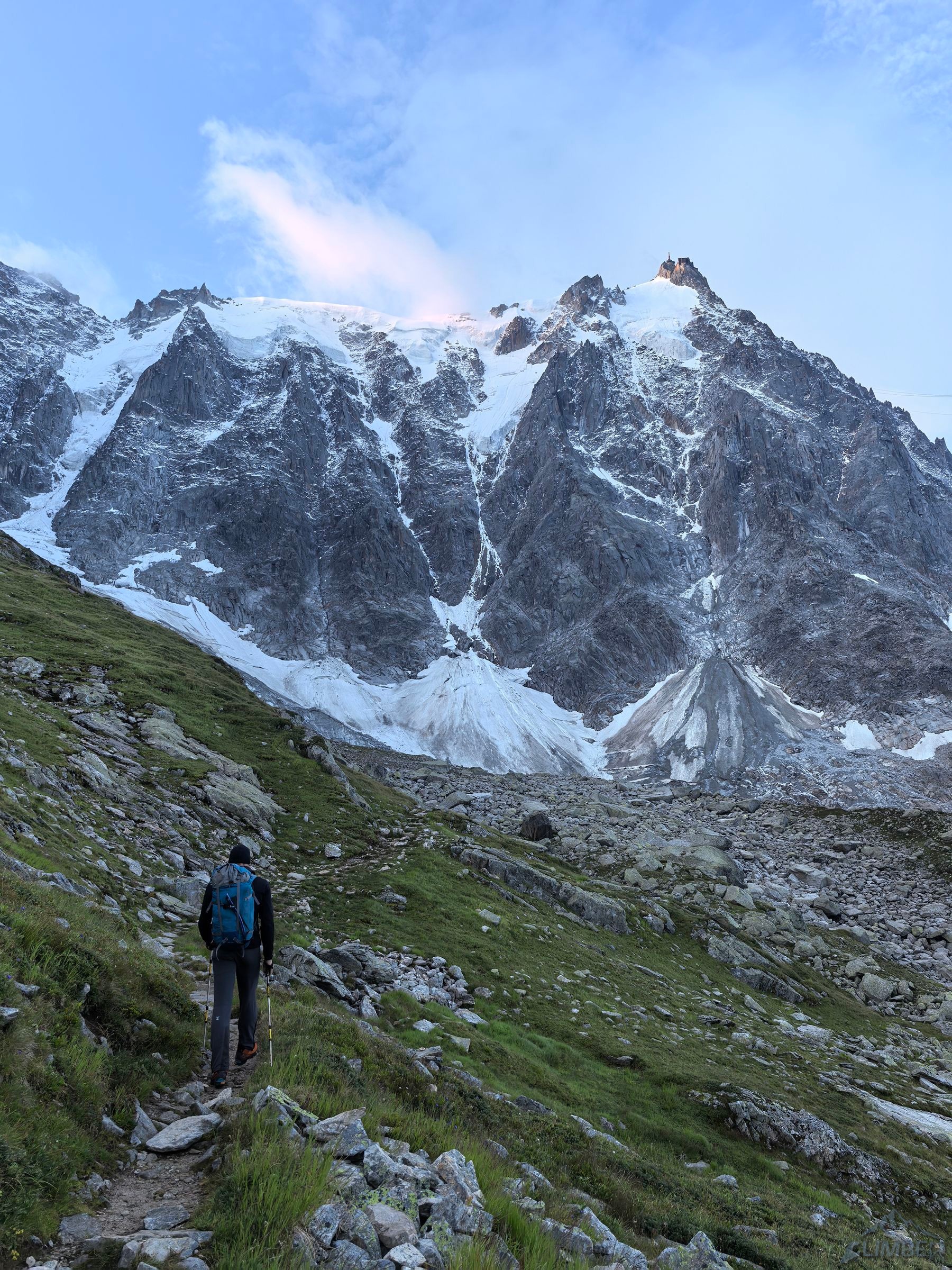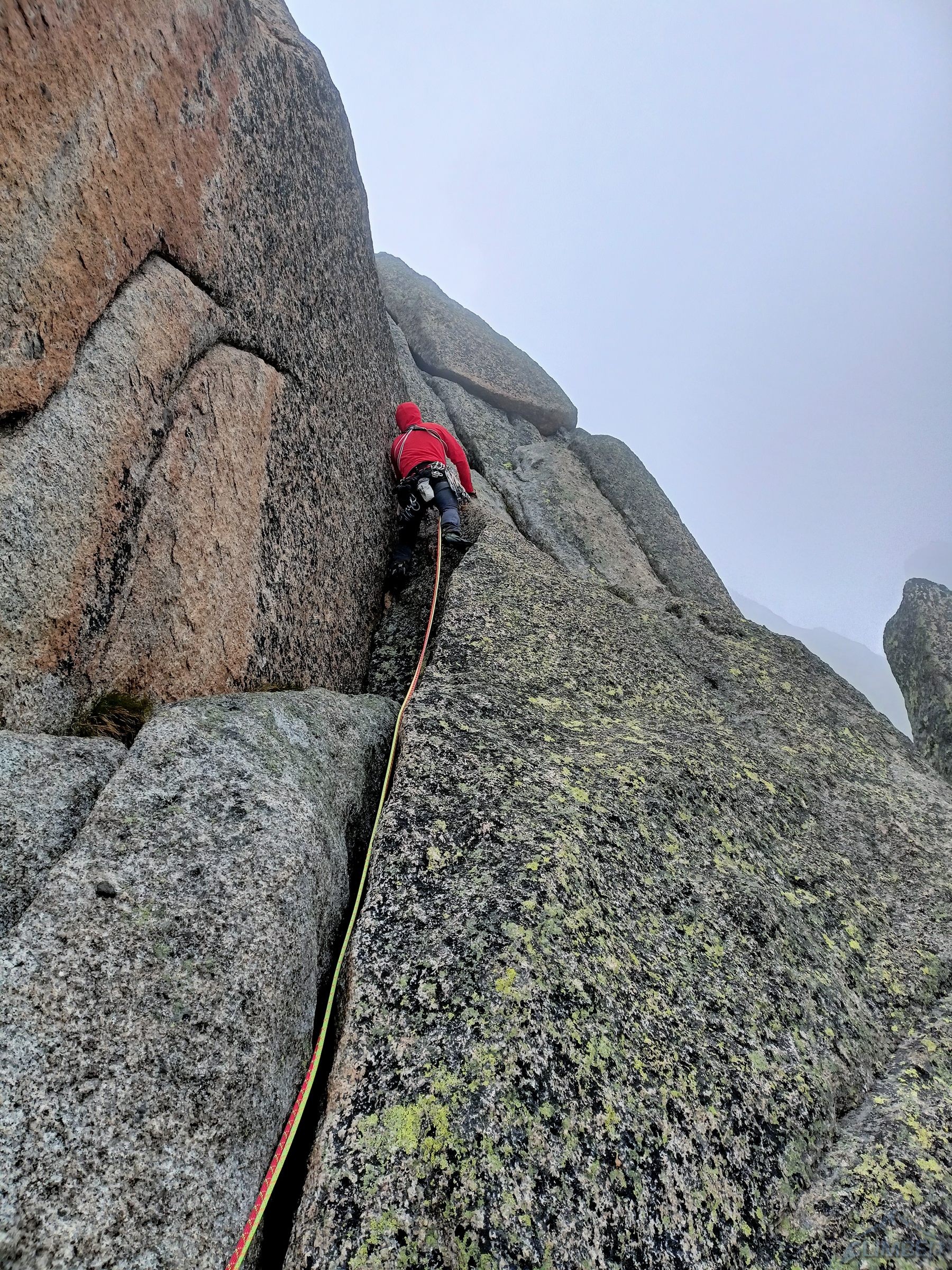 Kolejny dzień naszego pobytu w rejonie Mont Blanc zapowiada się pochmurno i zimno, liczymy że po dwóch dniach bez opadów uda się w końcu wybrać na jedną z zaplanowanych przed wyjazdem dróg. Im wyżej tym ma być gorzej, ponownie pozostaje więc spróbować na Planie – ruszamy pod Czerwony Filar Aiguille Peigne na drogę Maillon Manquant. Piękna ok. 480-metrowa linia (13 wyciągów) Pioli oferuje głównie trudności do 6b+, z jednym krótkim fragmentem 7b – najczęściej pokonywanym A0. Liczymy że szybko uda uporać się z łatwiejszymi wyciągami i kluczowy wyciąg zdążymy spróbować klasycznie przed kolejnym załamaniem pogody zapowiadanym na wieczór.