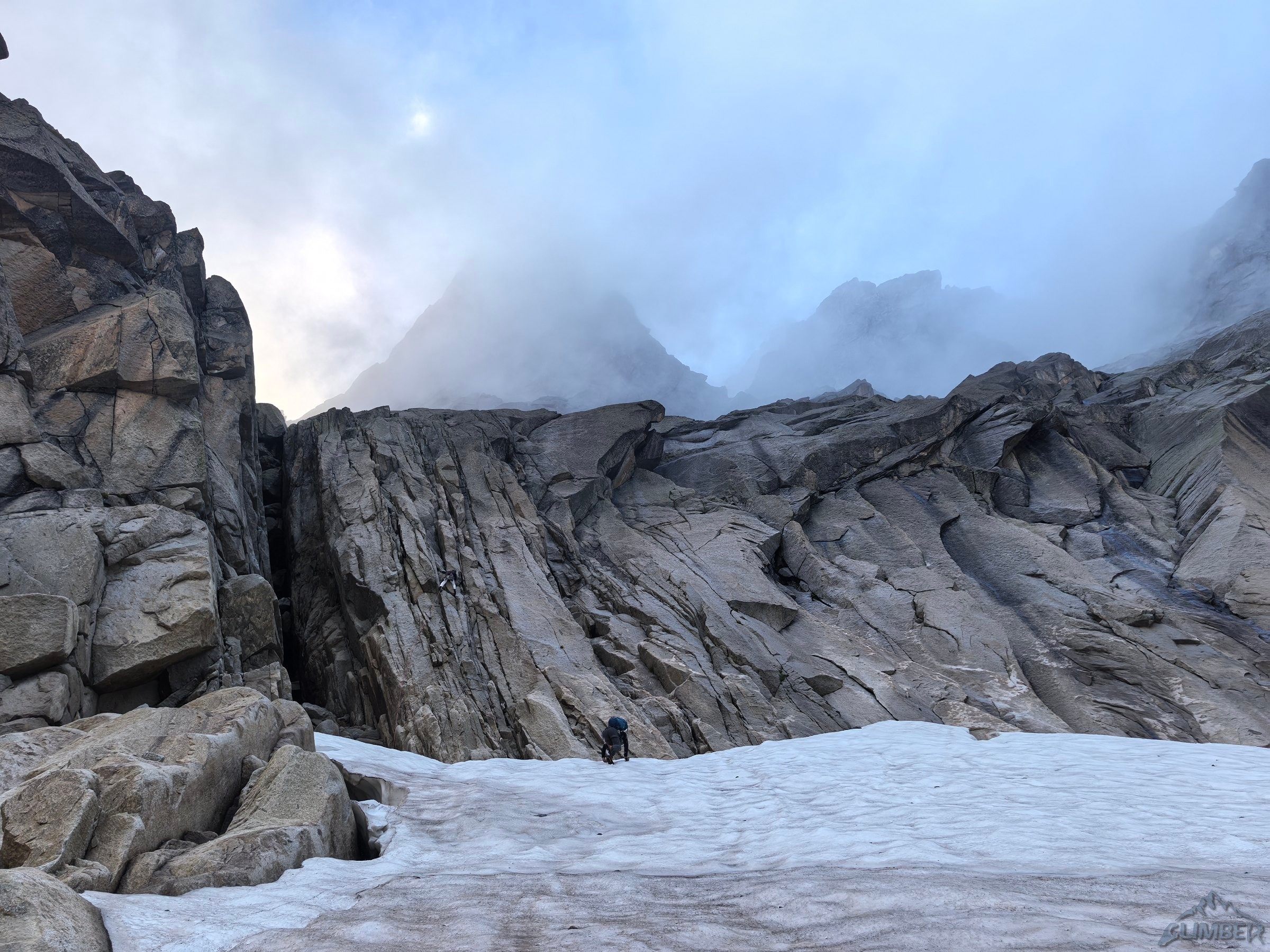 Podejście pod ścianę z pośredniej stacji kolejki zajmuje ok. 40 minut, na miejscu pokonać trzeba jednak jeszcze krótkie pole lodowe lub przewspinać próg po lewej i strawersować pod start drogi. Stanowisko „zerowe” znajduje się na półce kilka metrów nad śniegiem, u podstawy wyraźnego zacięcia opadającego na lewo od charakterystycznego skośnego okapu. Pierwsze wyciągi przypadają w prowadzeniu Szymonowi – są przystępne i z dobrą asekuracją, wspina się więc szybko i przyjemnie. Od razu wspomnę że na drogę warto zabrać dwa komplety friendów #0.3 - #2.0 i jednego #3, z tym że na poszczególne wyciągi przydają się różne rozmiary.