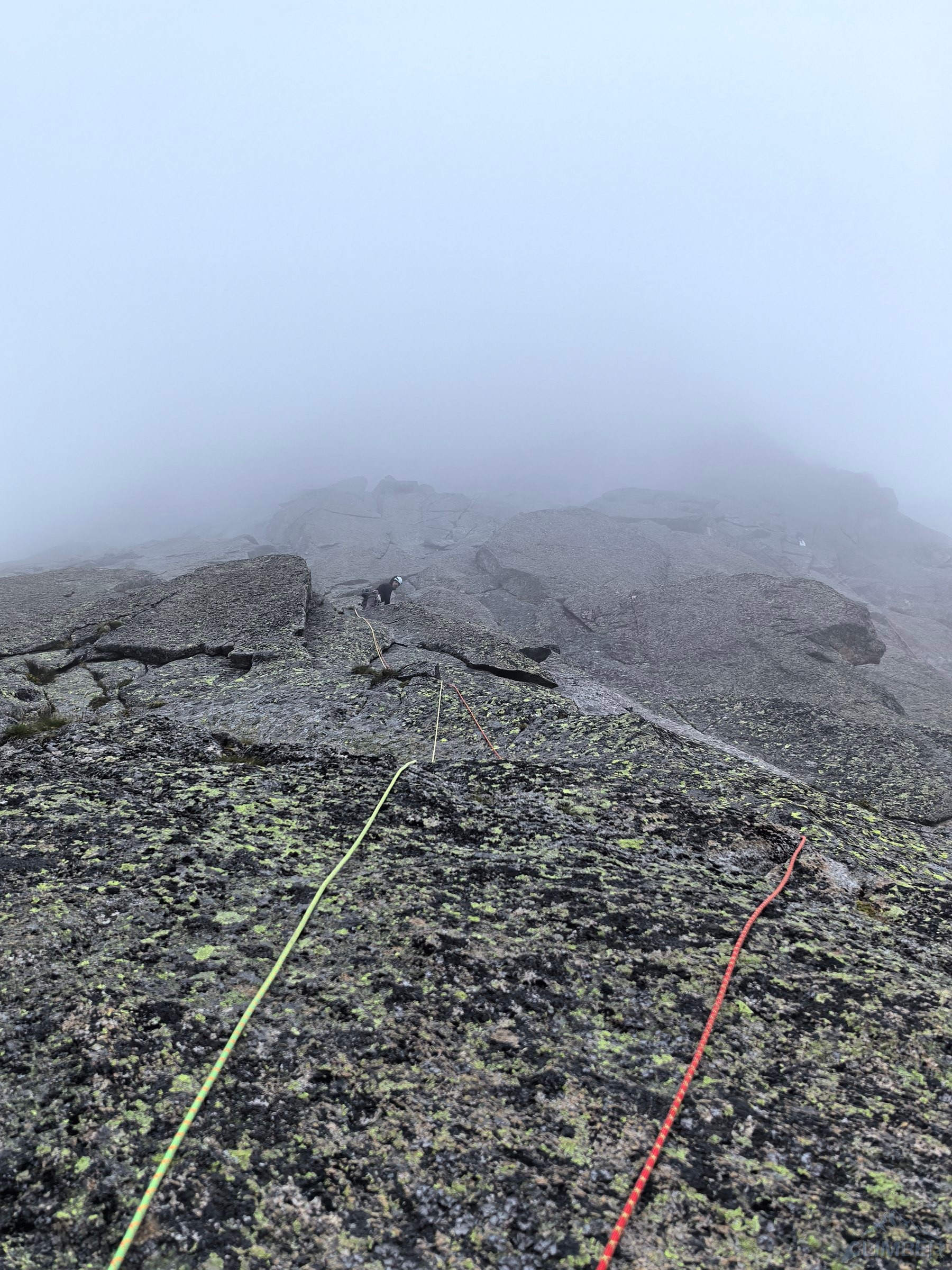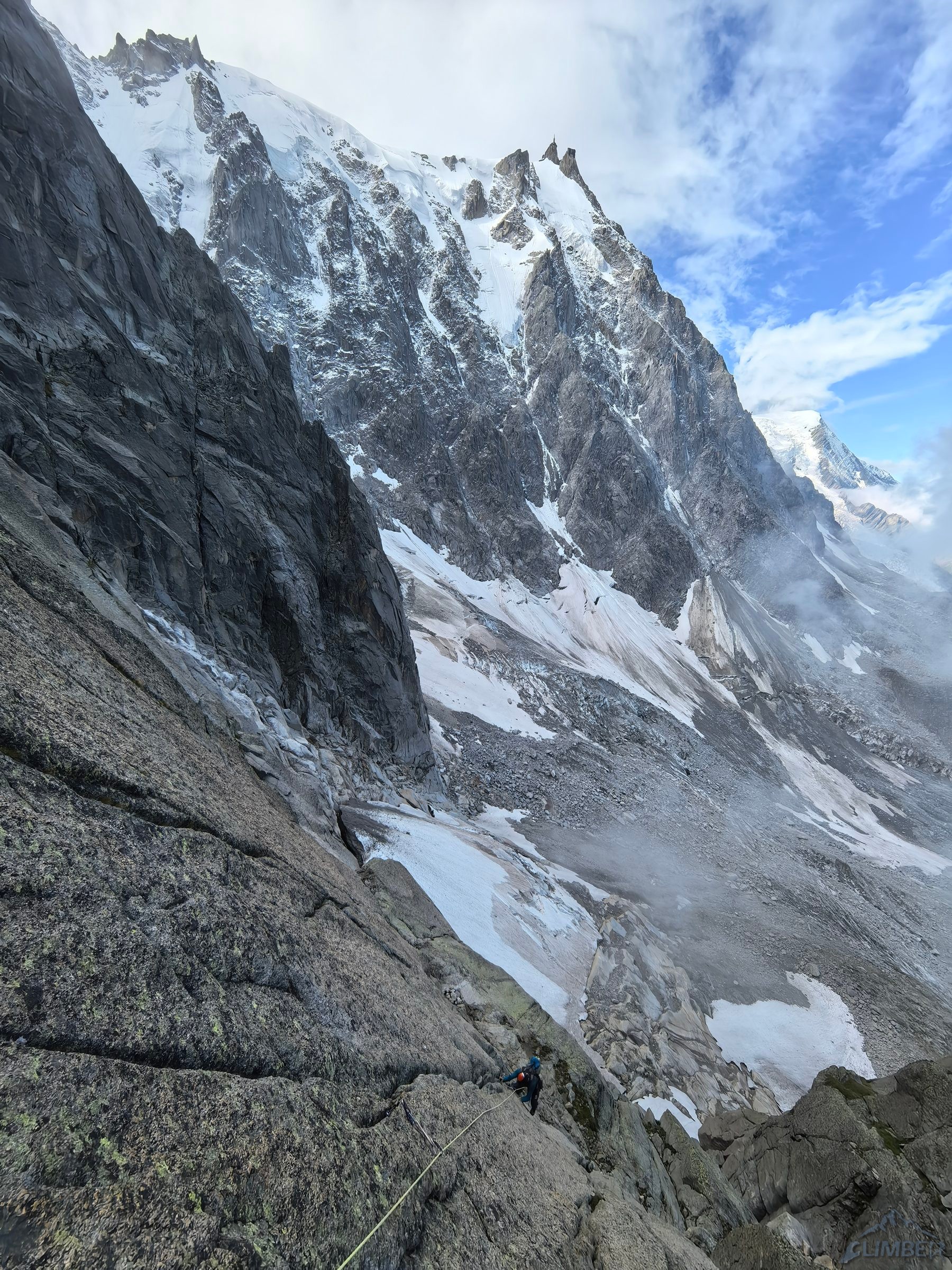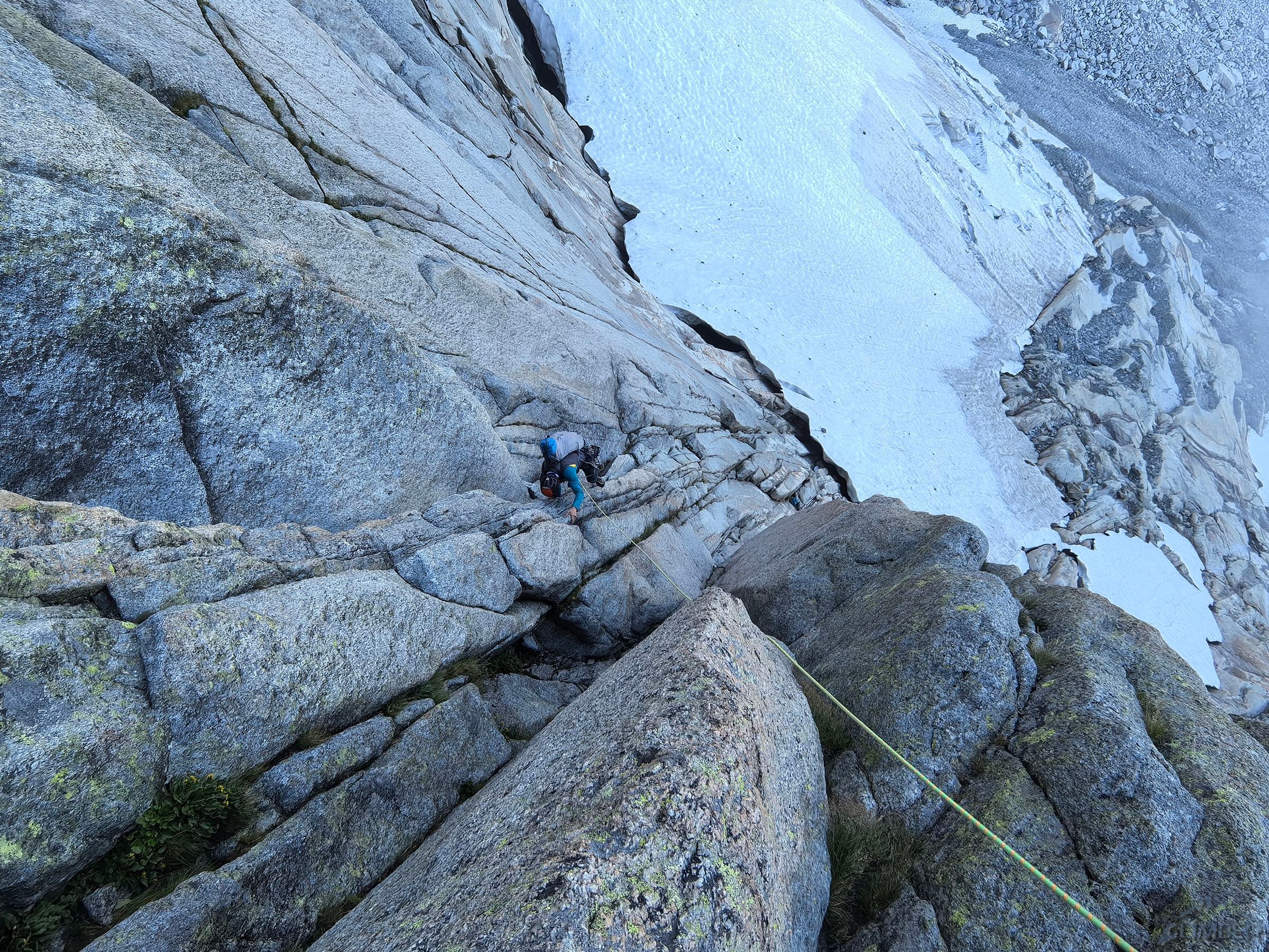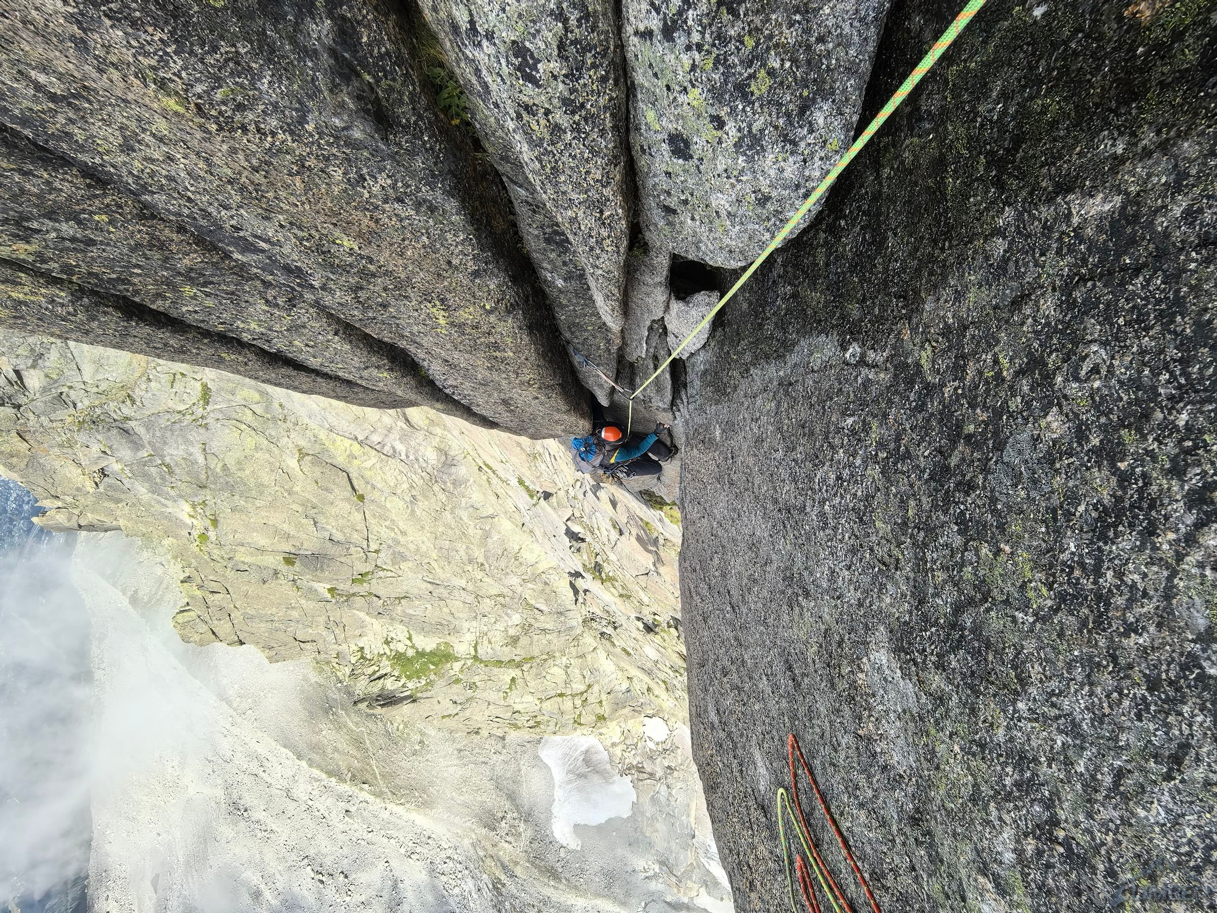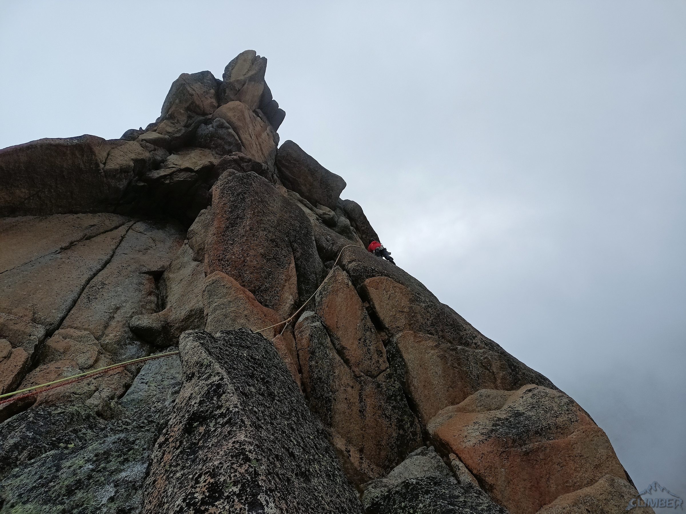 Końcówka w tych warunkach to nadal nie formalność, trzeba się mocno trzymać i gęsto asekurować aż do ostatnich metrów. Na wyciągu dwunastym zaczynamy obłą, do tego mokrawą już rysą (6a+), po której łatwiej kierujemy się skośnie w lewo na półkę. Ostatni wyciąg (6a) mimo zimna i wilgoci bardzo mi się podoba – na początek rysy i piękny dilferek, potem przewinięcie do komina w prawo i wyjście z niego na kant do spita i powrót w lewo aż do szczytu turni na której droga się kończy - całość poszła OS-em, mimo to zeszło ponad 9 godzin. Co prawda podobno lepsze są zjazdy drogą Postscriptome, w gęstych chmurach wolimy jednak wracać linią którą pokonaliśmy do góry – po około dwóch godzinach jesteśmy na półce startowej, zbieramy zostawione rzeczy i zmierzamy w dół. Ostatnia kolejka oczywiście odjechała, ponownie czeka nas więc bonus w postaci dwugodzinnego zejścia na nogach do Chamonix. Po takiej pięknej drodze to jednak żaden problem, większym zmartwieniem będą przysypane śniegiem ściany jakie zobaczymy z okna kolejnego ranka…