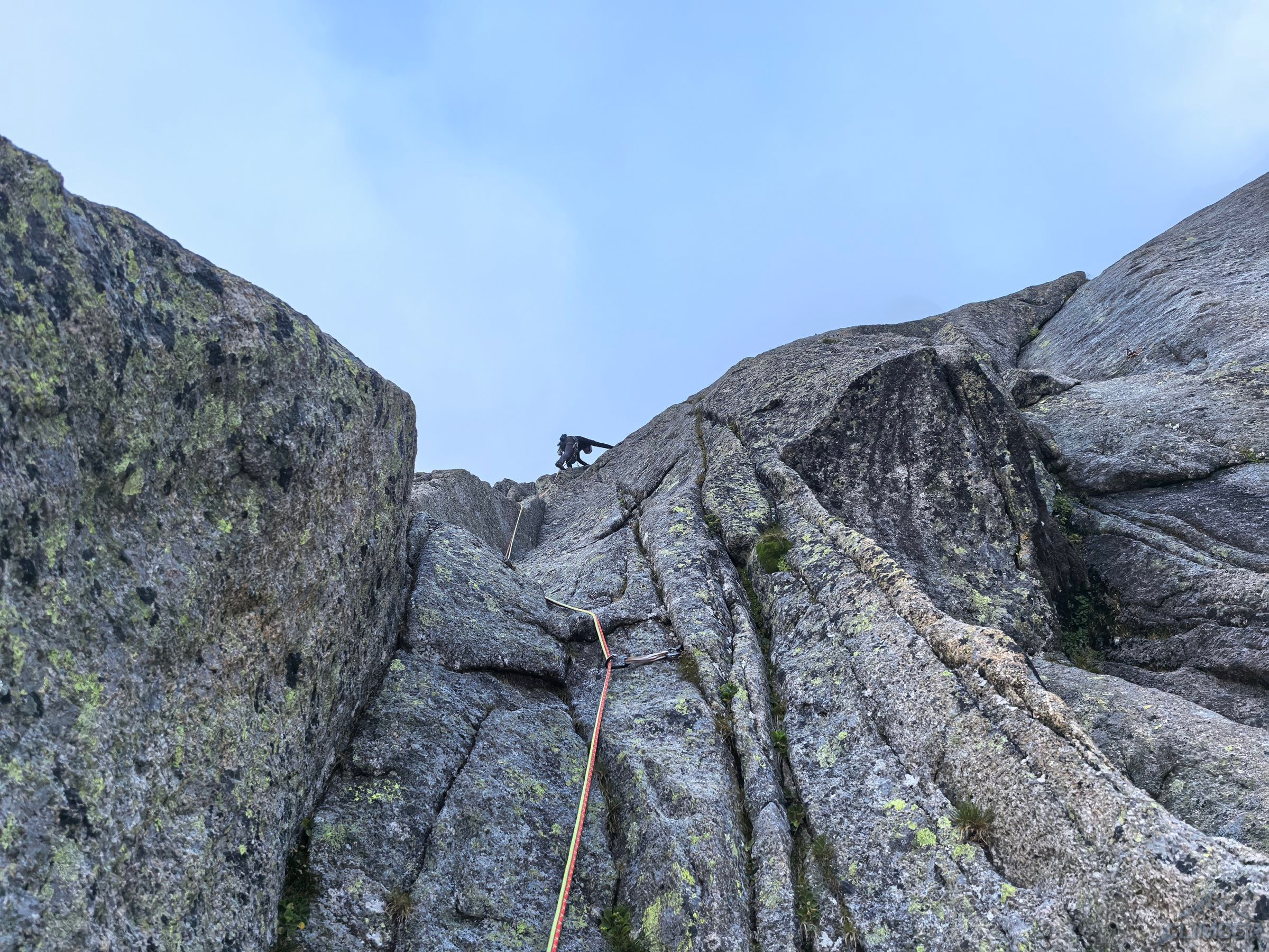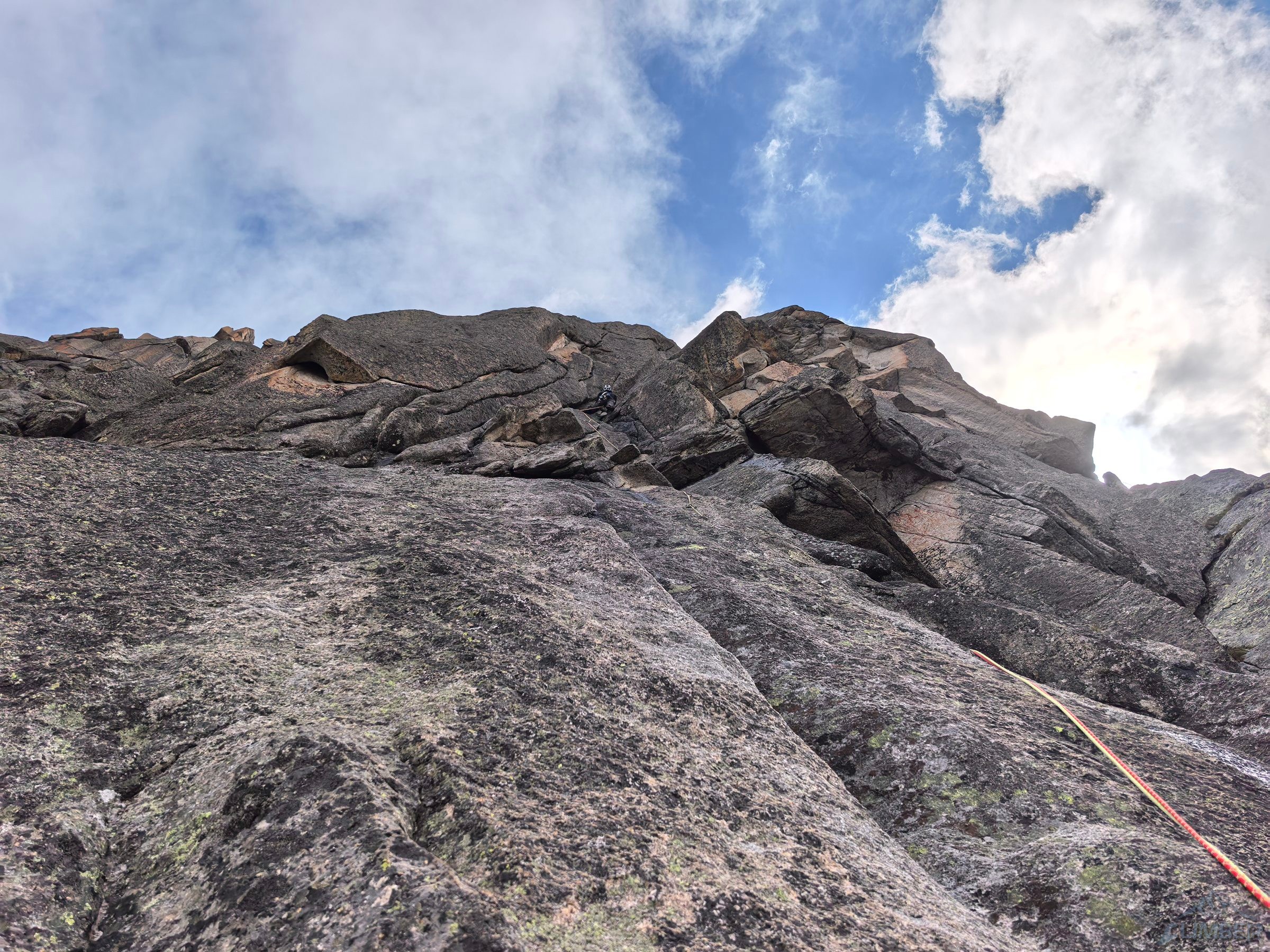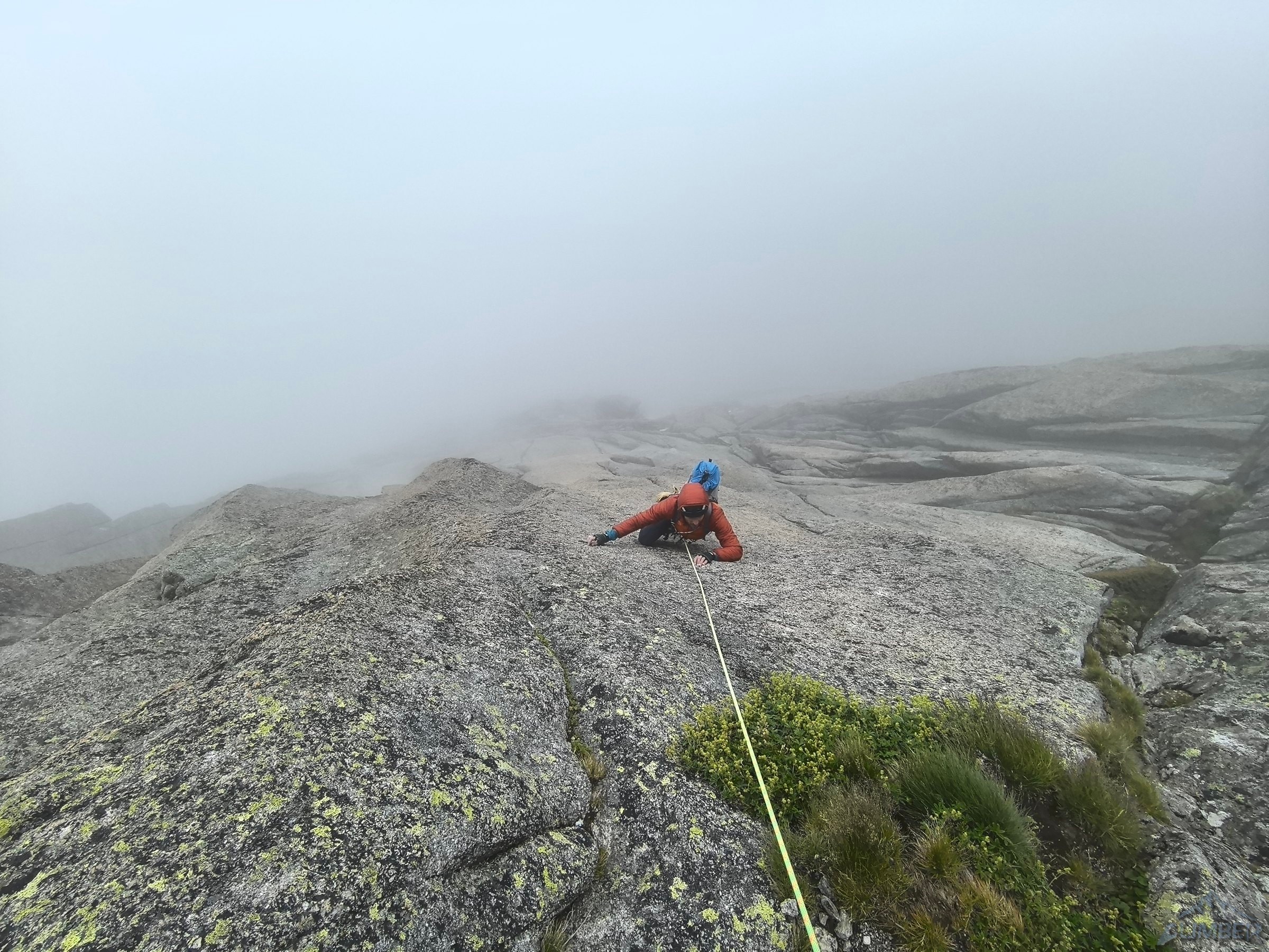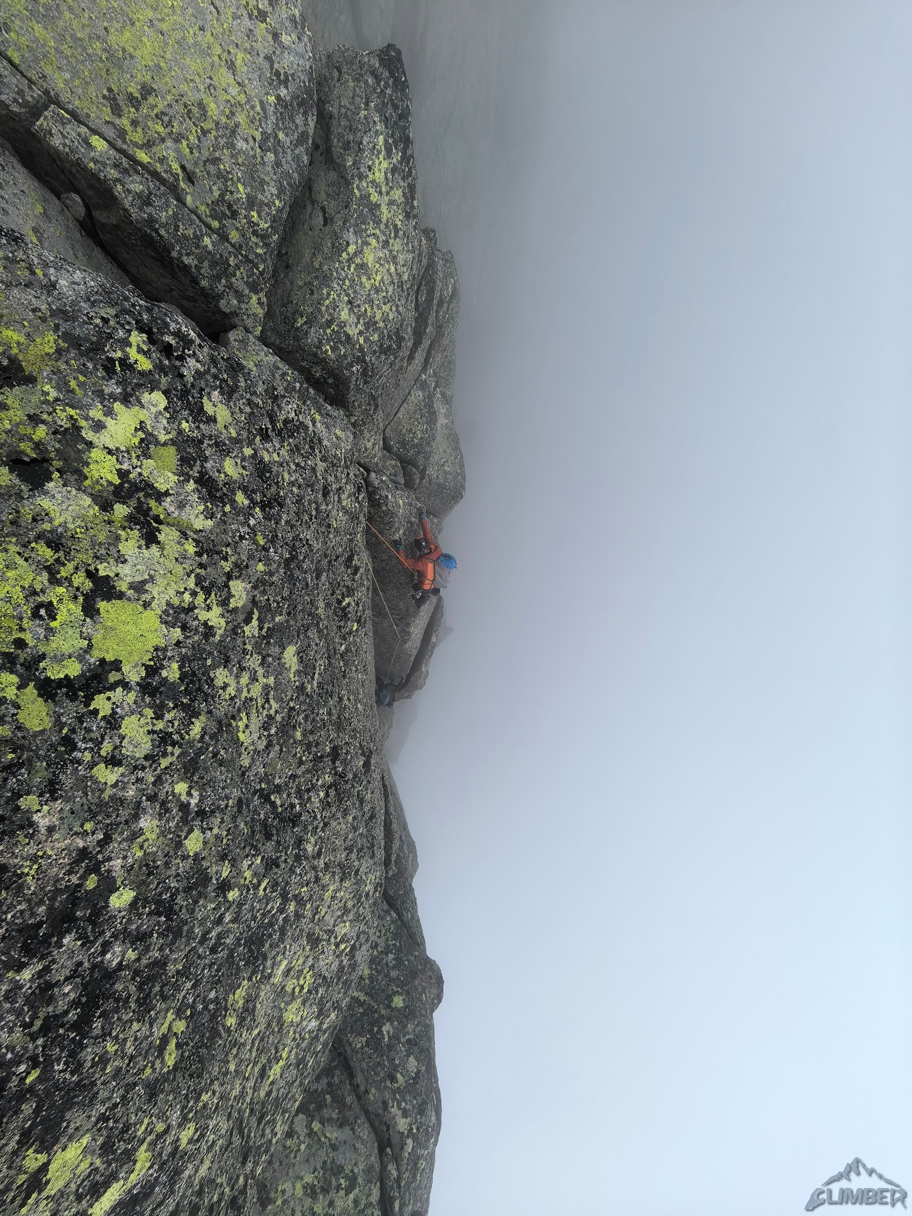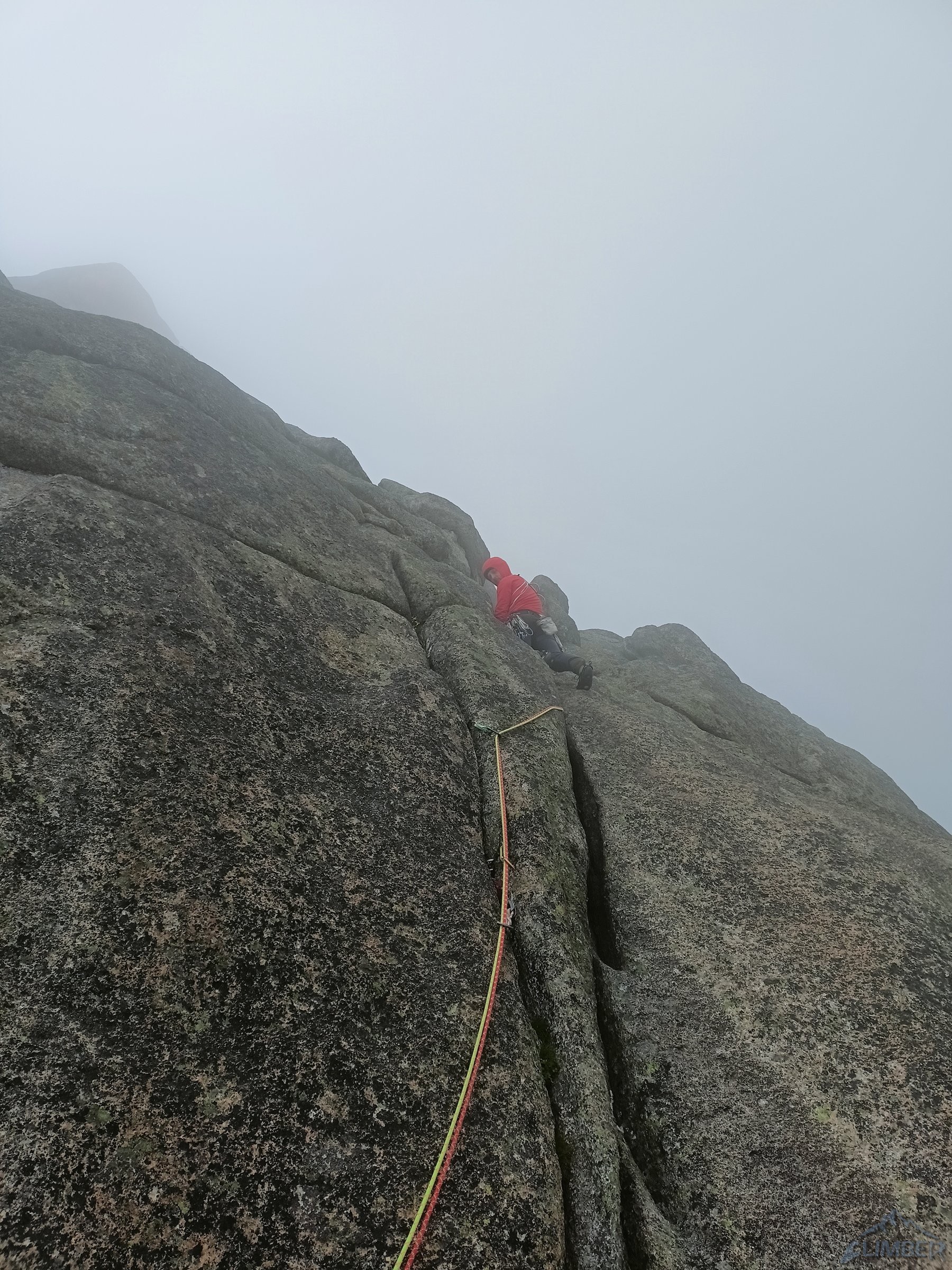 Z tego miejsca zaczyna się dużo ciekawsze i nieco bardziej wymagające wspinanie. Szósty wyciąg (6a+) zaczynamy rysą po prawej, trawersujemy pod okapikiem w lewo i odbijamy wzdłuż spitów rajbungową płytą skośnie w prawo – jedno miejsce to fajny tarciowy bulderek. Kolejny odcinek jest najtrudniejszym w dolnej części drogi (6b+) – idziemy rysami i zacięciami pomiędzy okapy, odbijamy do spita w lewo i pokonujemy wymagający fragment, po którym przewijamy się do zacięcia z wiszącym stanowiskiem. Prowadzenie przejmuje Bartek – czeka na niego przepiękny wyciąg z dilferkami (6a) prowadzący wprost do góry i w lewo na koniec. Kolejne dwa wyciągi (6a) to dalszy ciąg zacięć z rysami na własnej – palce lizać! Tutaj spotykamy się z jedynym oprócz nas zespołem w ścianie tego dnia, Francuzami robiącymi drogę Mazino – mamy wspólny wyciąg, po którym oni idą wprost w okapy a my pod nimi w prawo. Na półce pod górnym spiętrzeniem robimy więc dłuższą przerwę i szykuję się do prowadzenia trudności – pogoda niestety pogarsza się z minuty na minutę, nie będzie więc za wiele czasu na powtórki i może skończyć się przejściem za 6b+ A0.