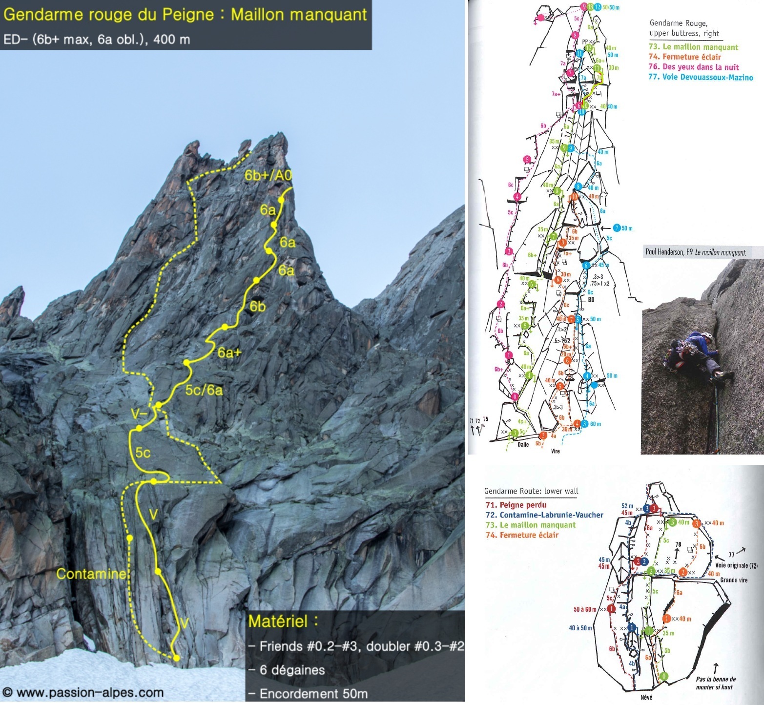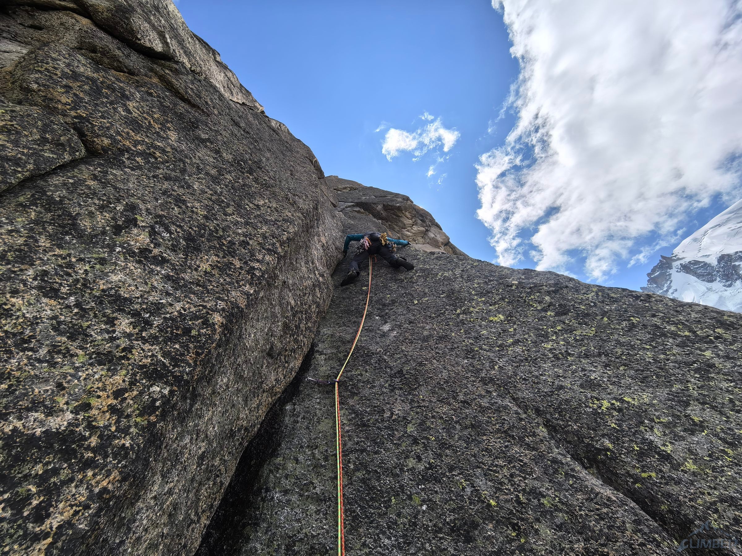 Kluczowy wyciąg zaczyna się od nietrudnego zacięcia wspólnego z drogą Mazino, z którego przewijamy się do ringa na płycie po prawej – tuż przy nim czeka trudny bulder (7b), który w razie potrzeby można pominąć łapiąc się ekspresa. Kilka minut przystawiam się do problemu i w końcu próbuję – po sięgnięciu klamy pojawia się radość ale i stres czy nie spalę wyciągu w dalszej części, która jest całkiem wymagająca (6b+). Najpierw wejście do obłej rysy, a po jej przejściu trikowy bulder (ringi). Dalej nie idziemy do góry między przewieszki (co się zdarza przez błąd w schemacie MB Granite, poprawiony przeze mnie grubą kreską) tylko trawersujemy w prawo i przewijamy się przez mały okapik do półki ze stanowiskiem. Na szczęście dysponując innymi materiałami i uzyskując potwierdzenie od Francuzów mimo wątpliwości trafiłem gdzie trzeba, inaczej byłby problem - idąc przez okapy dojdziemy do drogi Mazino, nie będzie to jednak łatwe...