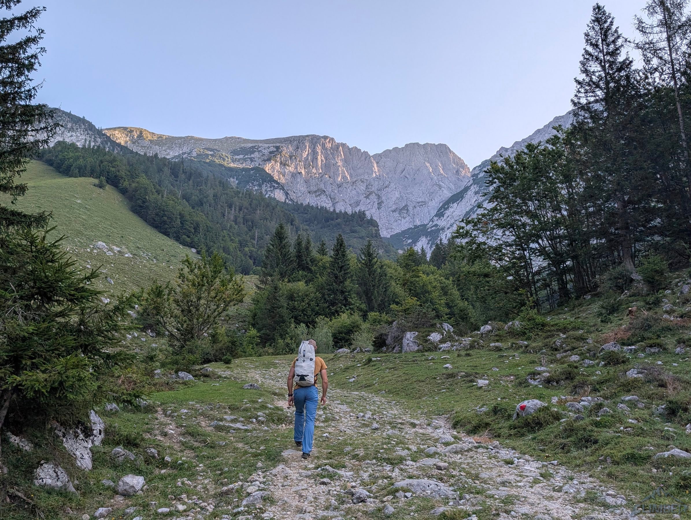 Na piku czekają piękne widoki i alpejska łąka, schodzimy oznaczonym szlakiem na zachód – przez położony obok szczyt Kopfkraxen i dalej granią z której w dół do doliny. Nie mając już od dłuższego czasu wody ochoczo biegniemy do umiejscowionego obok szlaku „punktu orzeźwienia” składającego się z wanienki zapełnionej piwem i innymi napojami oraz skrzyneczką na opłaty. Świetny patent aczkolwiek obawiam się, że u nas nie byłoby ani puszek ani skarbonki 😊.
