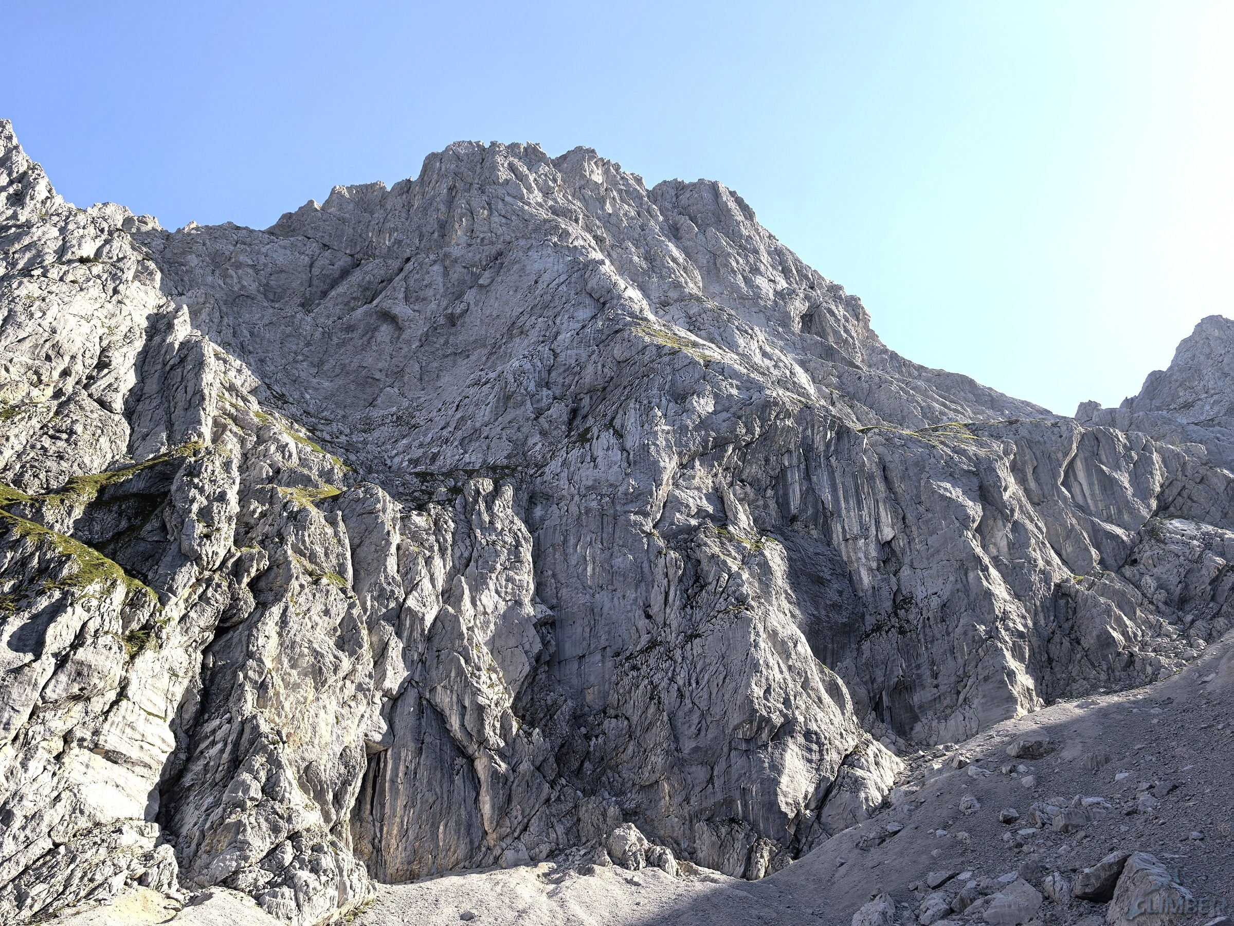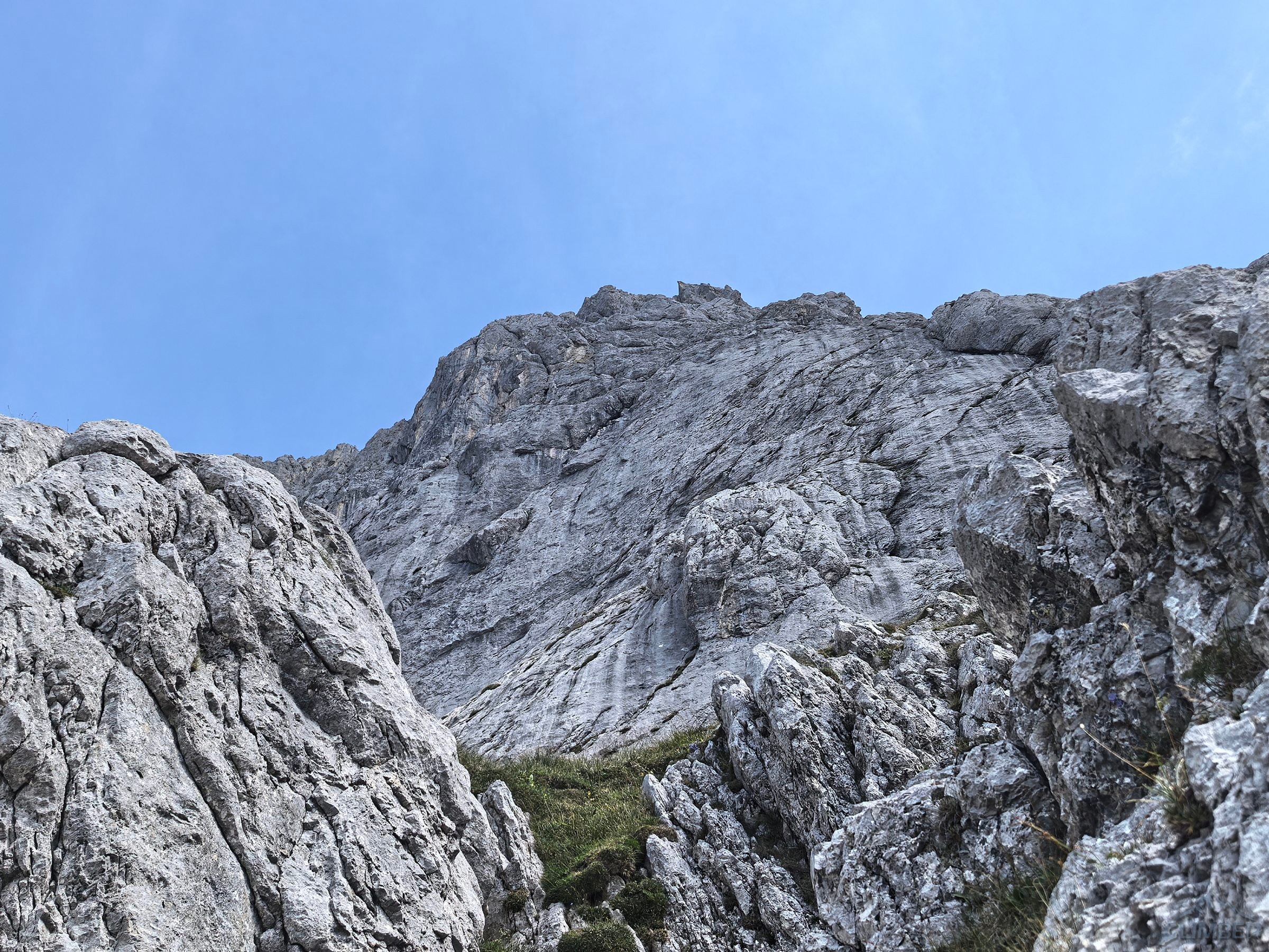 Dotarcie pod ścianę z parkingu przy hotelu Jägerwirt w Scheffau zajmuje około dwóch godzin, po drodze mijamy inną fajną dużą ścianę z kilkoma klasykami, Kopfkraxen. Nasza droga startuje na lewo od żlebu przecinającego ścianę – na prawo od niego biegnie popularny Sonnenpfeiller (6+). Początkowo niechcący podchodzimy żlebem, po połapaniu się że jesteśmy już pod drugim wyciągiem wracamy jednak do podstawy ściany.