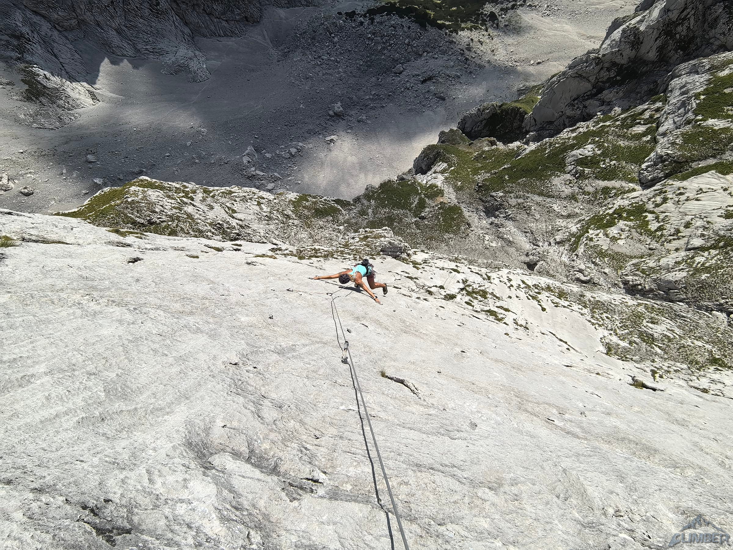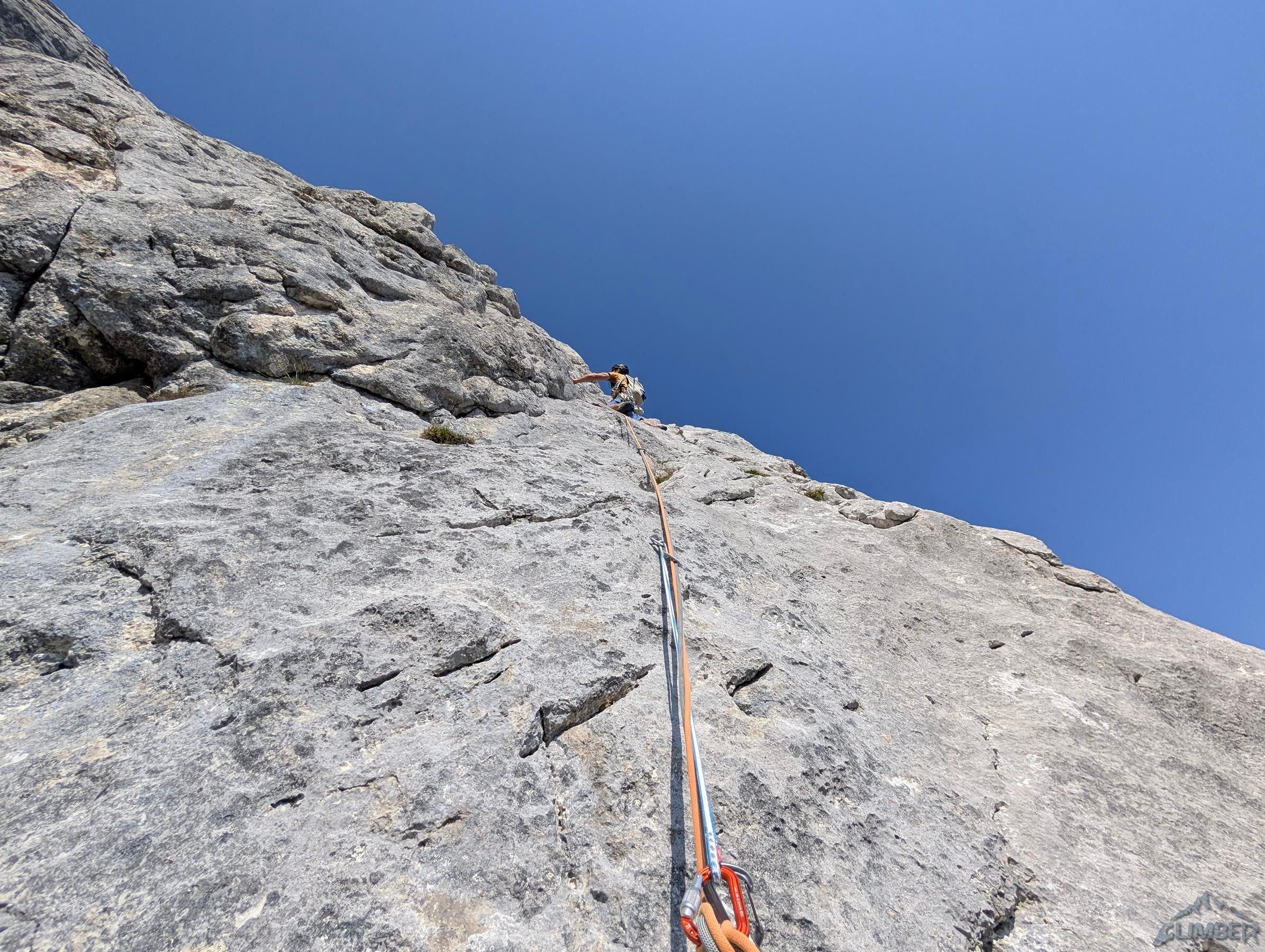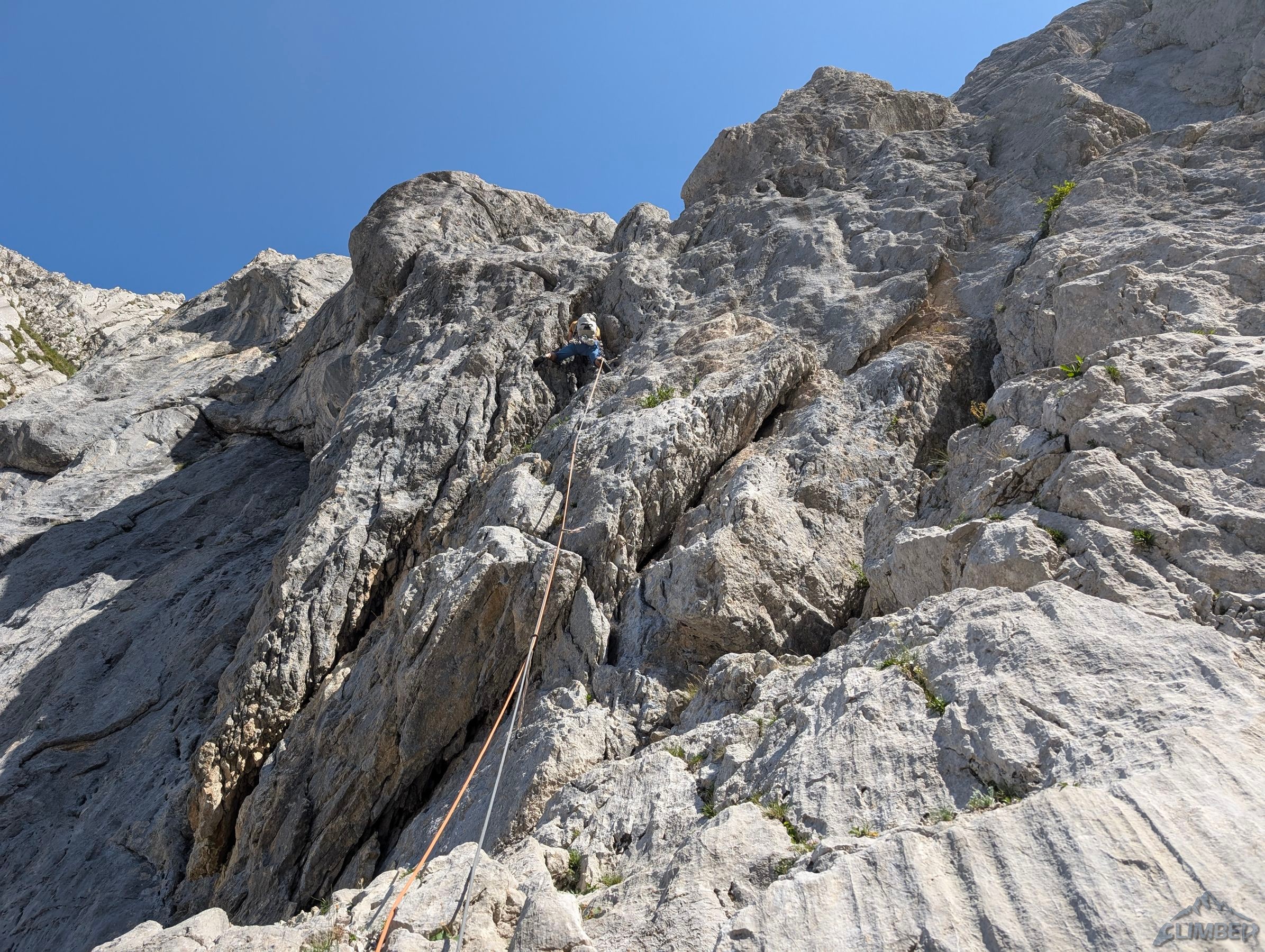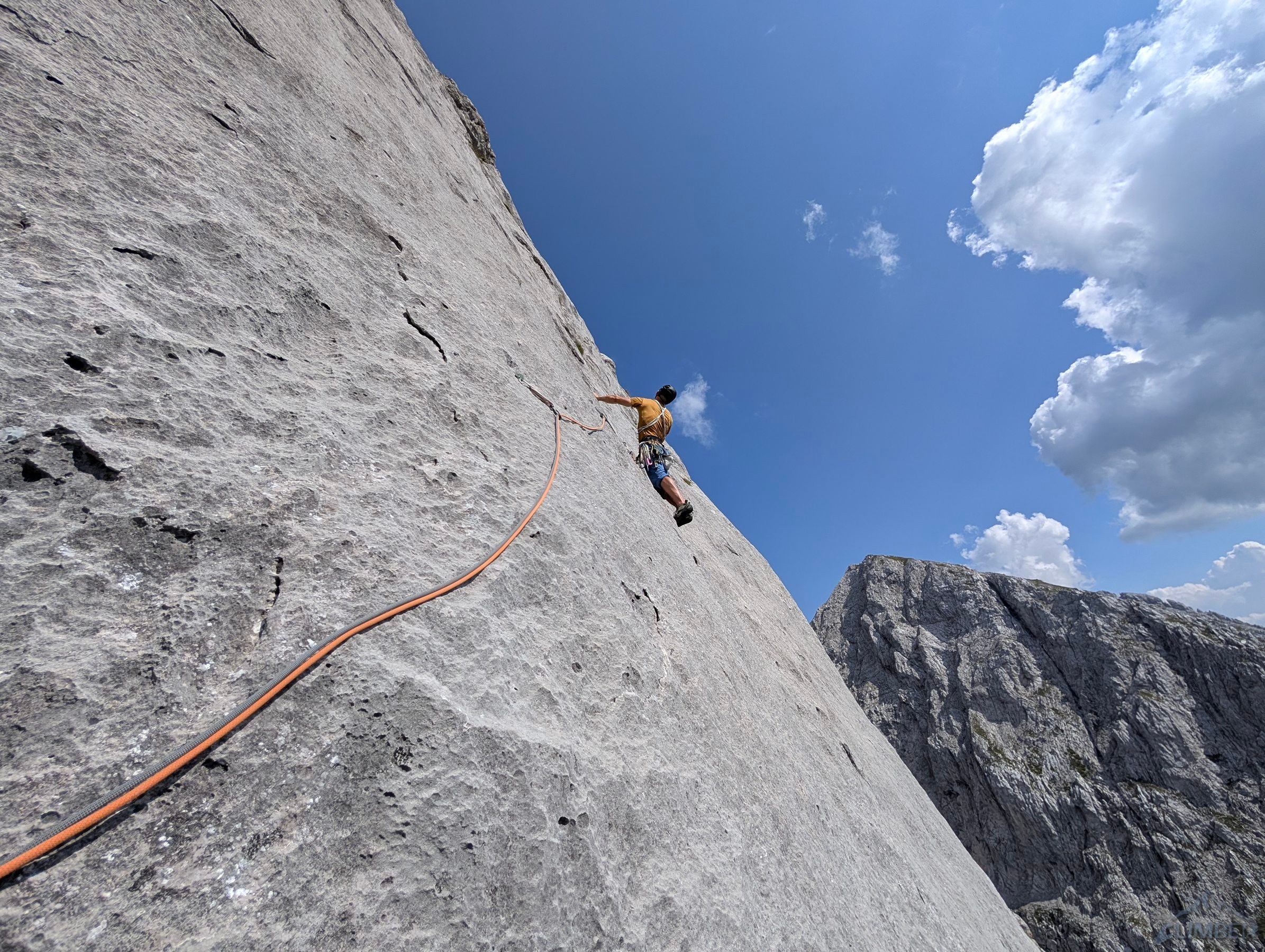 Zaczynamy od nieewidentnego odcinka – pokonujemy okapik ze starym repem i dopiero po 15 metrach lokalizujemy pierwszego spita w płycie, od którego kontynuujemy wzdłuż kilku kolejnych pokonujących kilka czujnych miejsc (w przewodniku wycena to 5, na Bergsteigen 7-). Drugi odcinek to płytowe wspinanie przez całe 50 metrów, kilka miejsc daje do myślenia i zmusza do lekkiego wyjścia ze strefy komfortu choć trudności są teoretycznie szóstkowe (w Bergsteigen 7 😊). Po rozgrzewce czas na danie główne czyli trzy świetne i wymagające wyciągi w bardziej spionowanej i gładkiej części ściany. Na pierwszym z nich po łatwym starcie czeka prawie 30 metrów ciągowego technicznego wspinania (7) z niebanalnym trawersem do stanowiska na koniec. Wyżej rzeźba zanika – trudności więc rosną (7+), tym razem rozłożone są jednak na trzy fragmenty przedzielone przydatnymi restami. Kluczowy wyciąg (8-) zaczynamy od razu cruxem czyli mega technicznym trawersem po małych chwytach i słabych stopniach – ponownie grzeje Słońce więc stopy dostają niezły wycisk dlatego walczę na całego by udało przejść się OS-em. Gdy już cieszę się sukcesem okazuje się że czeka jeszcze jedno podchwytliwe miejsce – na szczęście i ono puszcza w przedziwny sposób, radośnie pokonuję więc kolejne wyraźnie łatwiejsze metry do stanowiska.