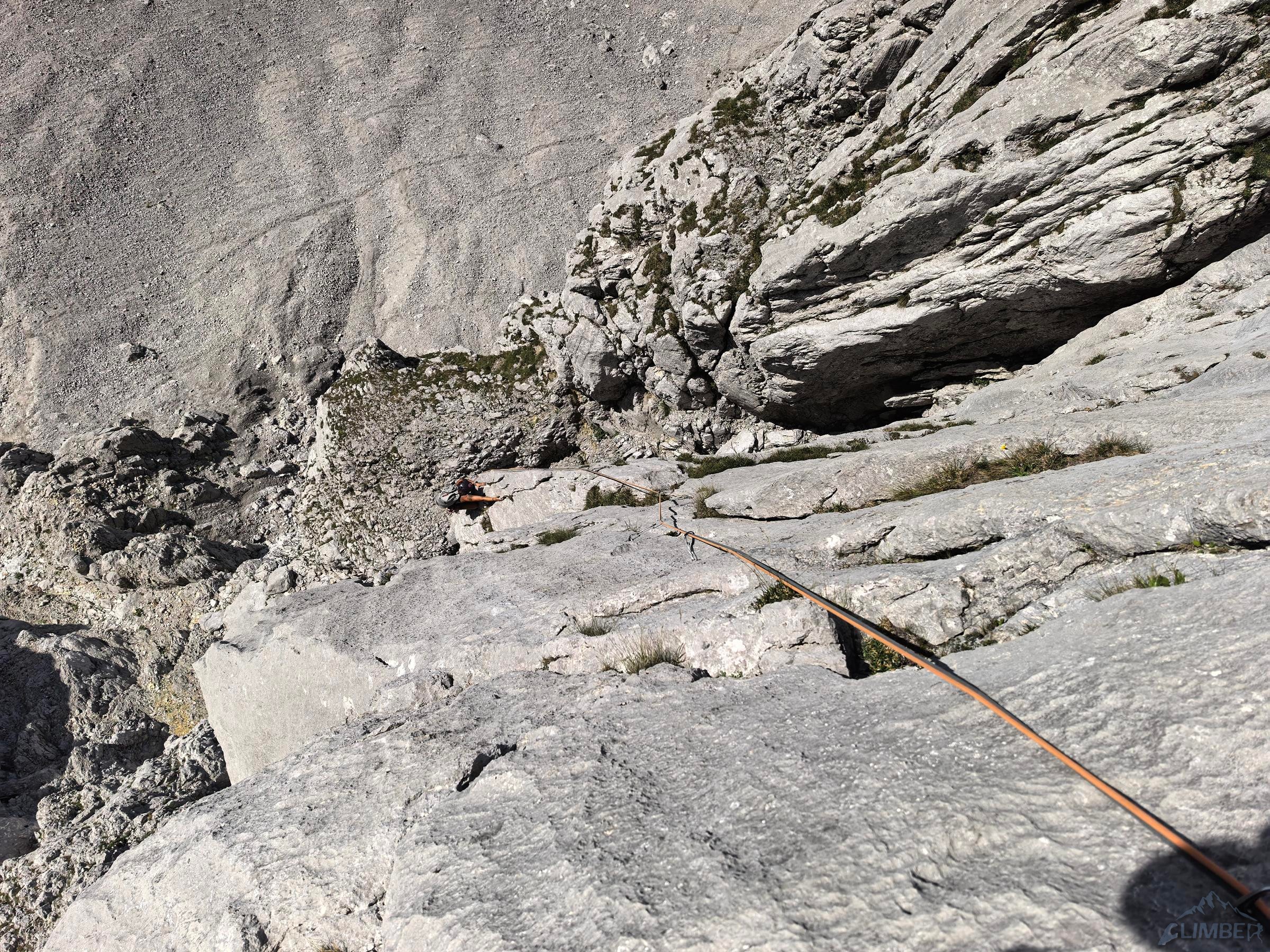 Na półeczce spotykamy się z drogą Sonnenpfeiller – ta idzie jednak do góry, podczas gdy my trawersujemy bardzo mocno w lewo – idziemy poziomo za spitami (4+) aż do stanowiskowego spita z koluchem. Wyciągu następnego mimo niskiej wyceny (5 do 6-) nie ma co lekceważyć – kluczymy w dość kruchym terenie a spity są dość rzadko, warto więc dorzucić własnego frienda (dwa zabrane średnie totemy były w sam raz). Mimo iż idę wzdłuż spitów tym razem nie ma żadnego z koluchem sygnalizującym stanowisko, niechcący więc przedłużam wyciąg i ładuję się w wymagający (6/6+) kominek mając prawie całą długość liny – stanowisko robię tuż powyżej. Ostatni fragment też potrafi zaskoczyć – po kilku metrach czeka trikowe przewinięcie w lewo, gdzie można się zdziwić 😉. Droga kończy się na przełamaniu ściany – do szczytu pozostaje około 100 metrów, pokonujemy je bez liny choć sugeruję jednak lotną (trudności II-III).