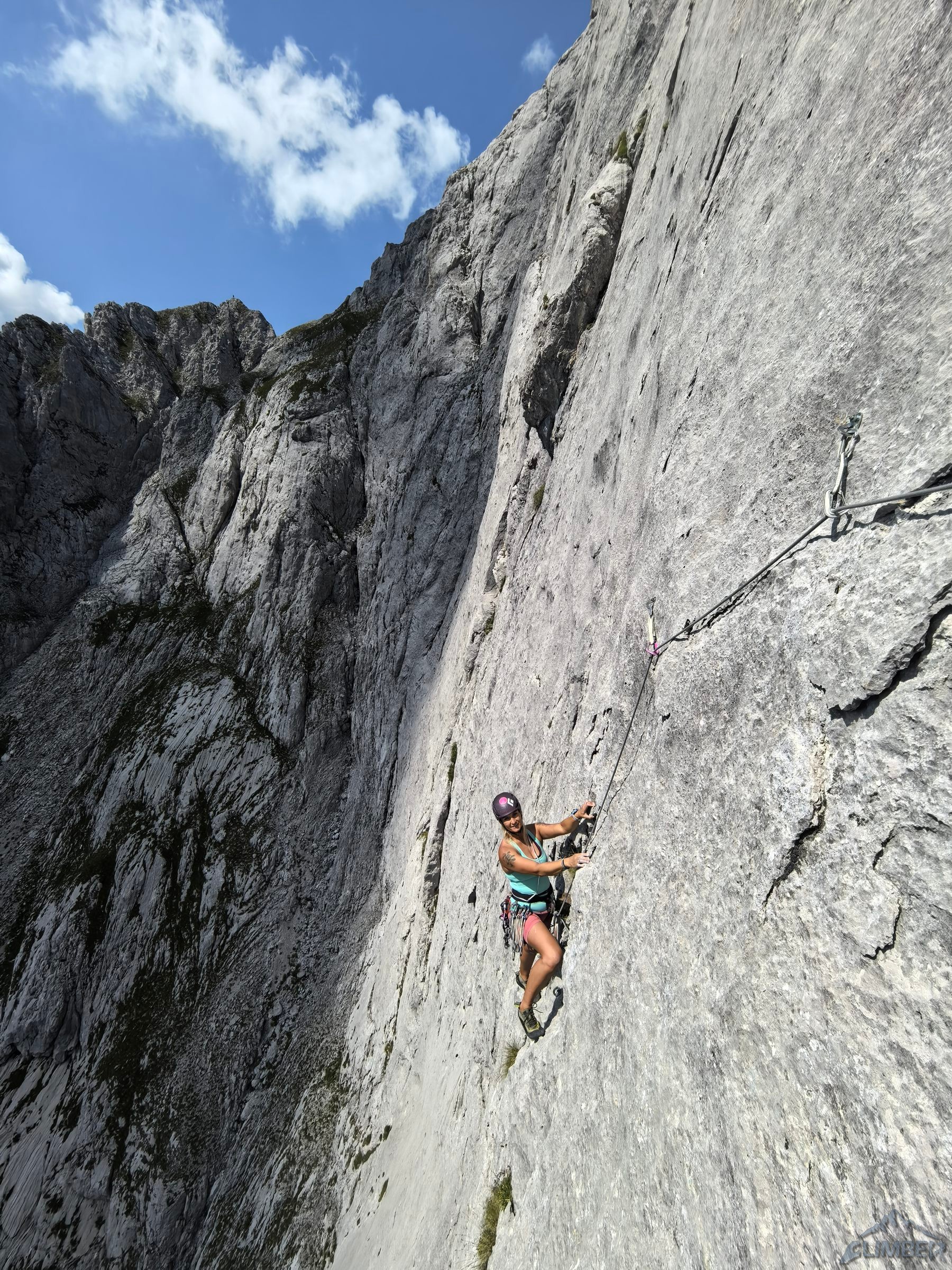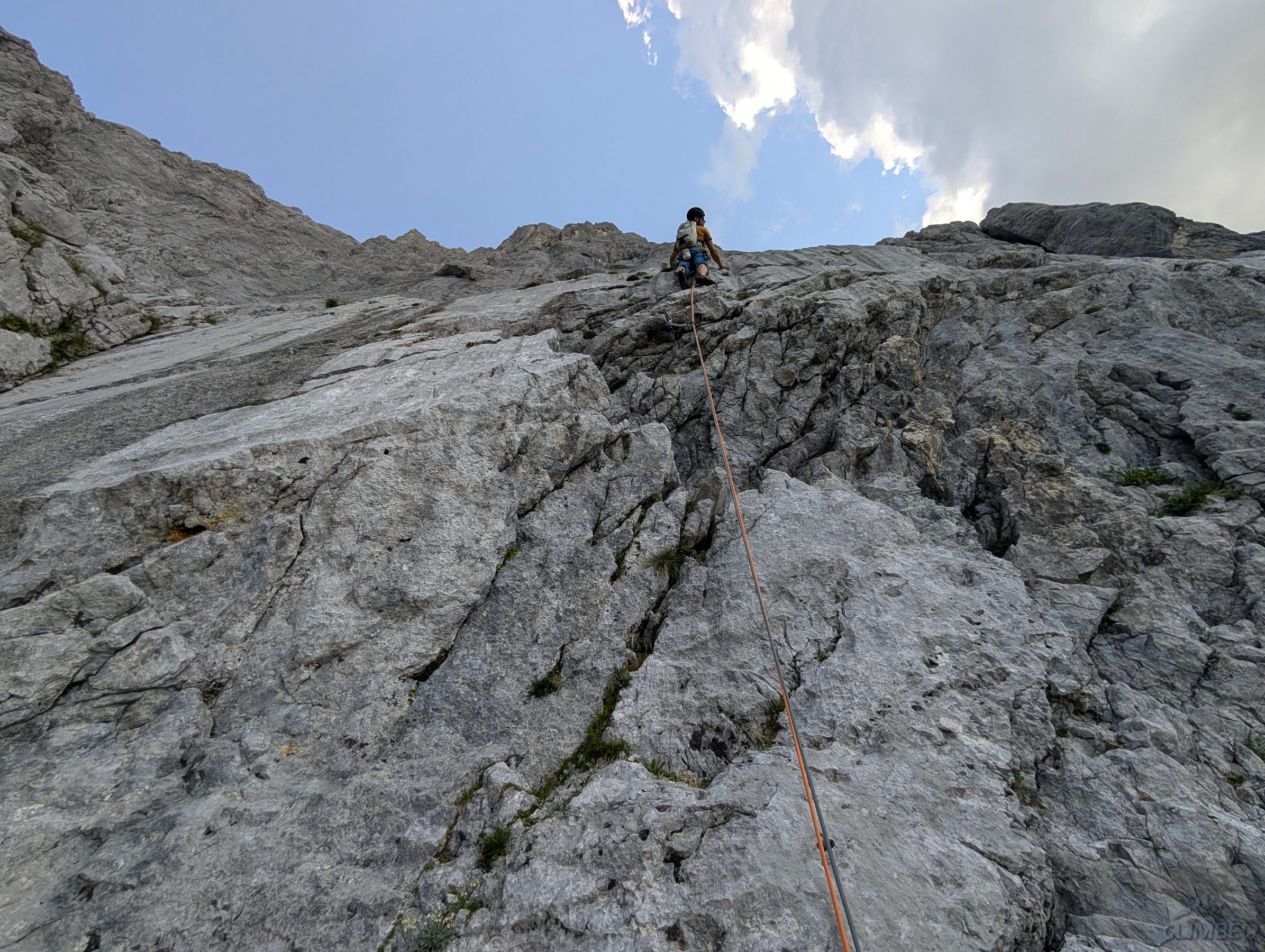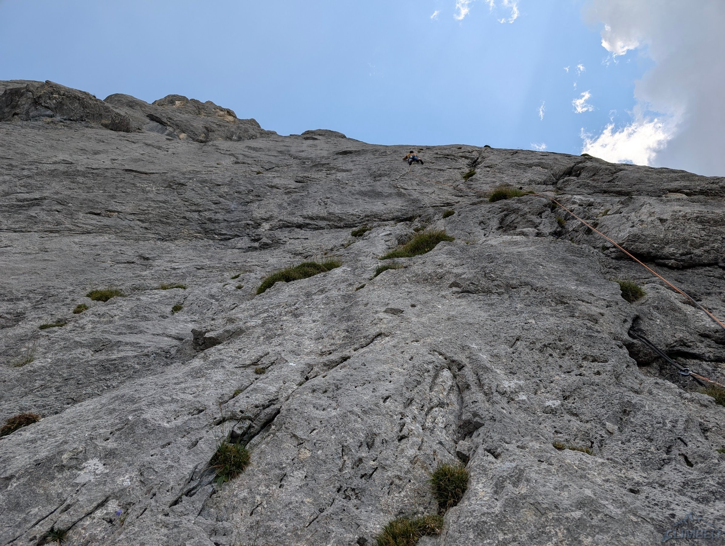 Pierwszy wyciąg (6) Delikatesse startuje płytką w podwieszony filarek, gdzie kontynuujemy przecinającą go depresją – wspinanie jest dość siłowe, a spity co kilka metrów (ocena asekuracji to E2- gdzie E1 to kompletne sportowe obicie, po czym skala narasta do E5). Drugi wyciąg (6+) to już wyraźnie trudniejsza techniczna płyta wzdłuż efektownego kantu – niespodziewane trudności i upał mocno daje się we znaki więc zaczynamy martwić się co będzie wyżej… Trzeci odcinek jednak nieco uspokaja – wycena (7-) wąskiego zacięcia jest adekwatna, wyżej teren się przełamuje i wychodzimy pod wielki taras u podstawy drugiej części ściany. Po przejściu 50 metrów skośnie w lewo namierzamy start HAZO i robimy krótką przerwę – ku naszej uldze pojawiają się chmury więc nie będziemy cierpieć w morzu płyt powyżej 😉. Straszą nas tylko trochę wycofujący się obok Austriacy ostrzegający przed burzą - nasze prognozy są jednak bardziej optymistyczne, poza tym stwierdzamy że najwyżej zjedziemy ścianą spod grani bez wychodzenia na szczyt, co jednak finalnie okazałoby się nie takie proste z powodu kluczenia linii oraz górnych stanowisk z jednego spita...