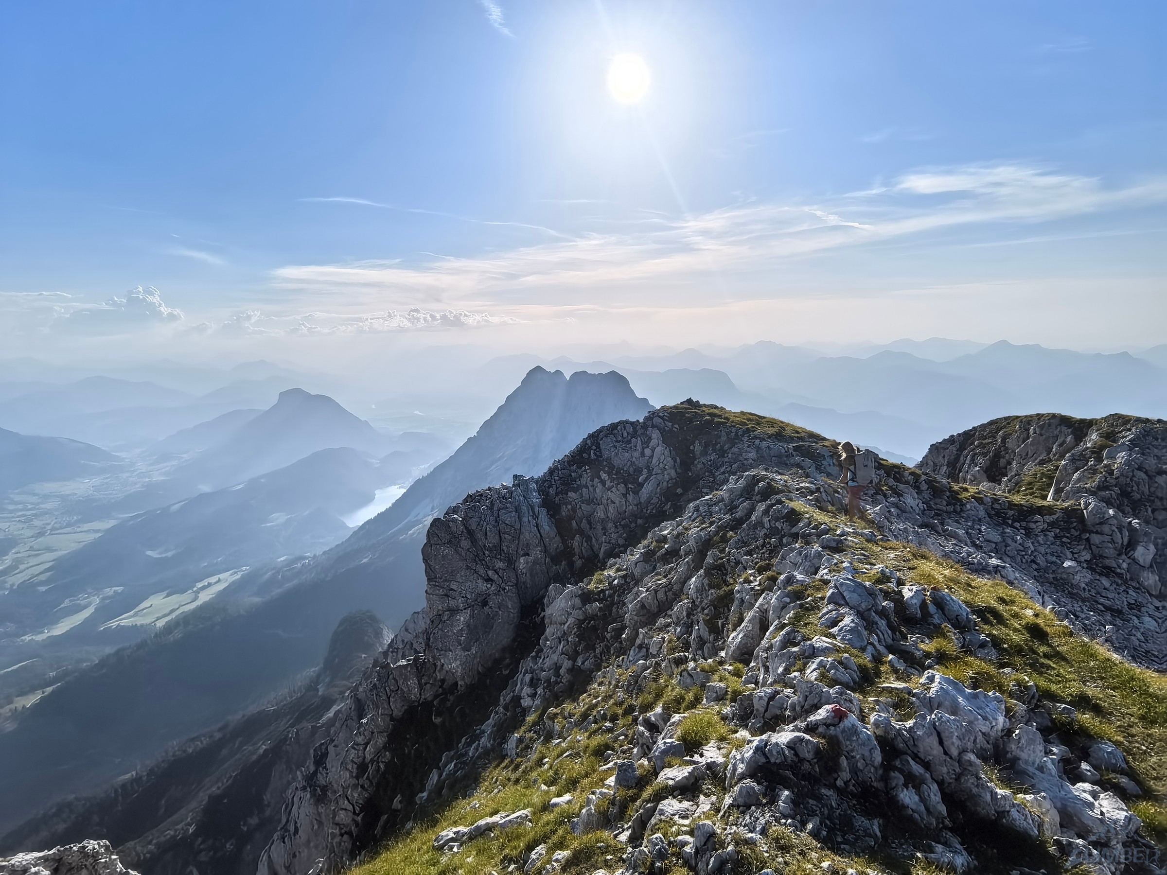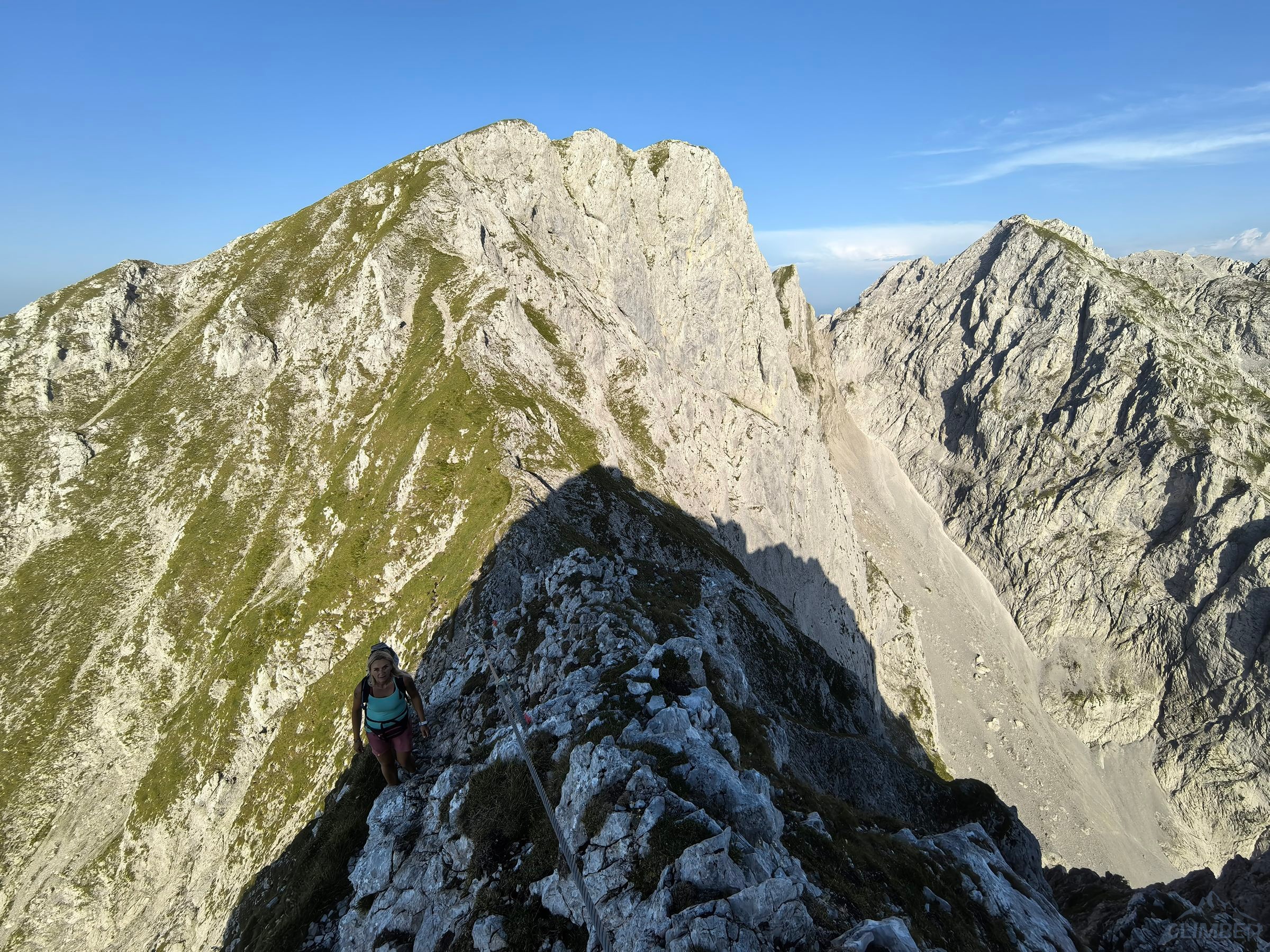 Decyzja o wyborze celu po zarwanej nocy jest nieco ryzykowna biorąc pod uwagę podejście, długość drogi oraz słoneczną wystawę przy wysokiej temperaturze – ponieważ jednak kolejne dwa dni ma padać stwierdzamy, że dobrze od razu jak najwięcej się powspinać i wejść na jeden z głównych szczytów masywu. Pierwsza droga to najciekawsze wspinaczkowe „podejście” pod drugą, gdzie czekają piękne i wymagające wyciągi w stromych płytach oraz końcówka w bardziej górskich formacjach. Prowadzę całość, kombinacja jest faktycznie świetna i daje przedsmak tego co może czekać na innych nowoczesnych liniach Wilder Kaiser. Od razu potwierdzają się też krążące opinie o dość surowych wycenach, które należy brać pod uwagę przy wyborze celów 😉.