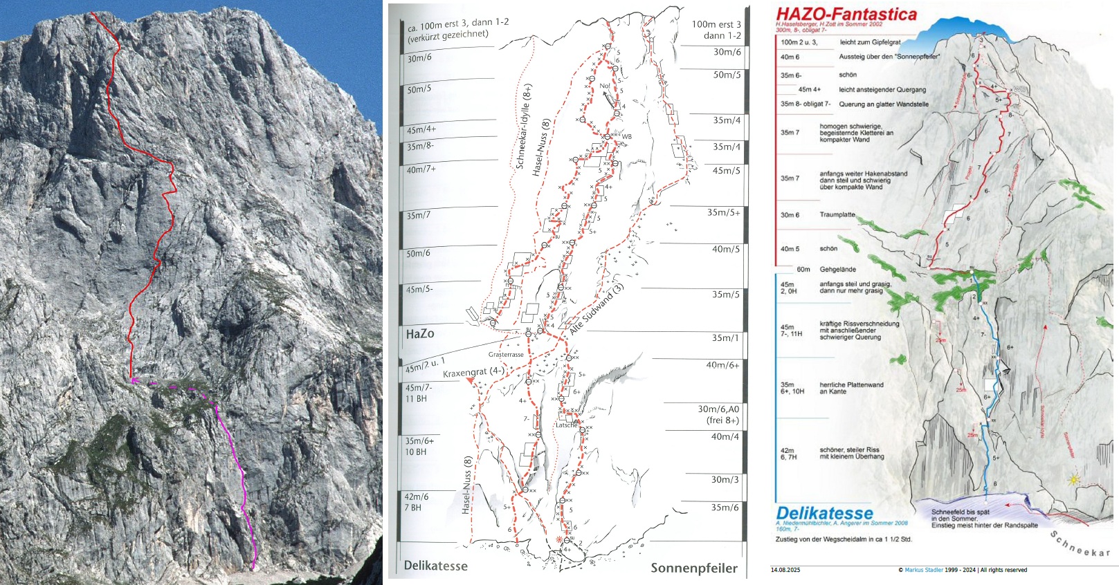 * Zamieszczone topo pochodzi z przewodnika Markusa Stadlera, który na swojej stronie dzieli się też opisami i schematami do poszczególnych dróg, link do HaZo TUTAJ. Dobre uzupełniające topo jest też na Bergsteigen TUTAJ.