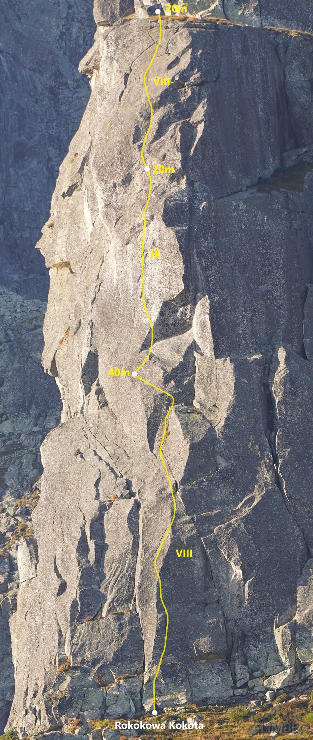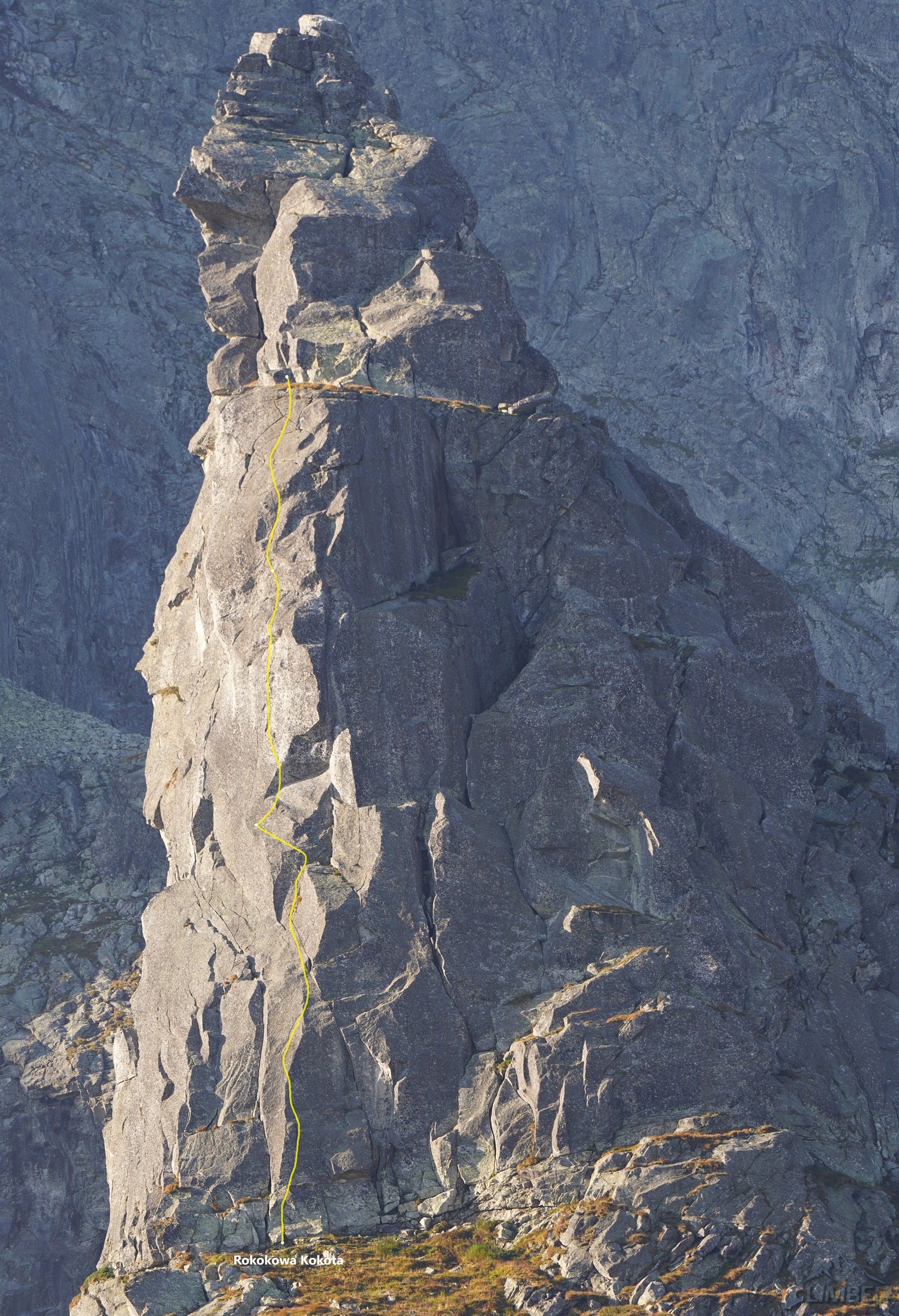 Rokokowa Kokota startuje z tarasu pod ścianą północną i biegnie pomiędzy dwoma klasykami – tradowym Kantem Hakowym oraz sportową Superatą Młodości. By się rozgrzać Dawid proponuje powieszenie ekspresów na pierwszym wyciągu, który miał okazję już kiedyś prowadzić – przystaję na propozycję bo OS nam już nie grozi, a będę miał większe szanse na przejście w pierwszej próbie (fleszem, co też się udaje). Droga jest kompletnie i prawie na całej długości komfortowo obita, własny sprzęt (1-2 średnie friendy) mogą przydać się tylko na około 10-metrowym piątkowym odcinku wspólnym z Kantem, gdzie celowo nie umieszczono spitów.