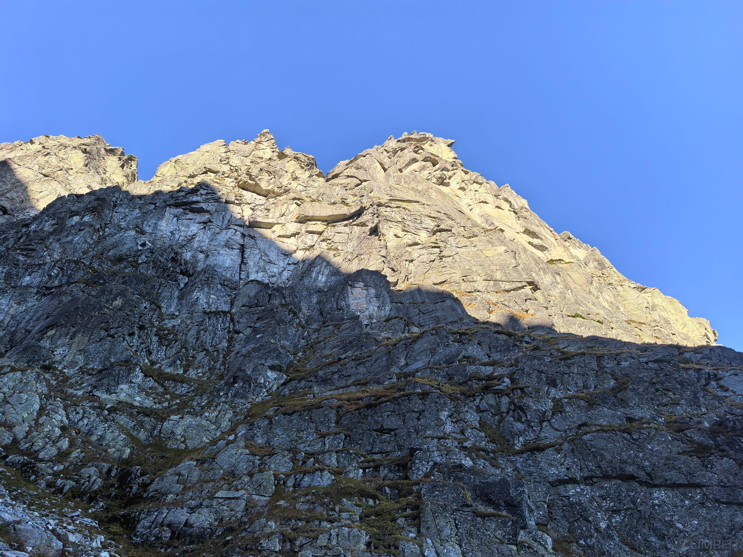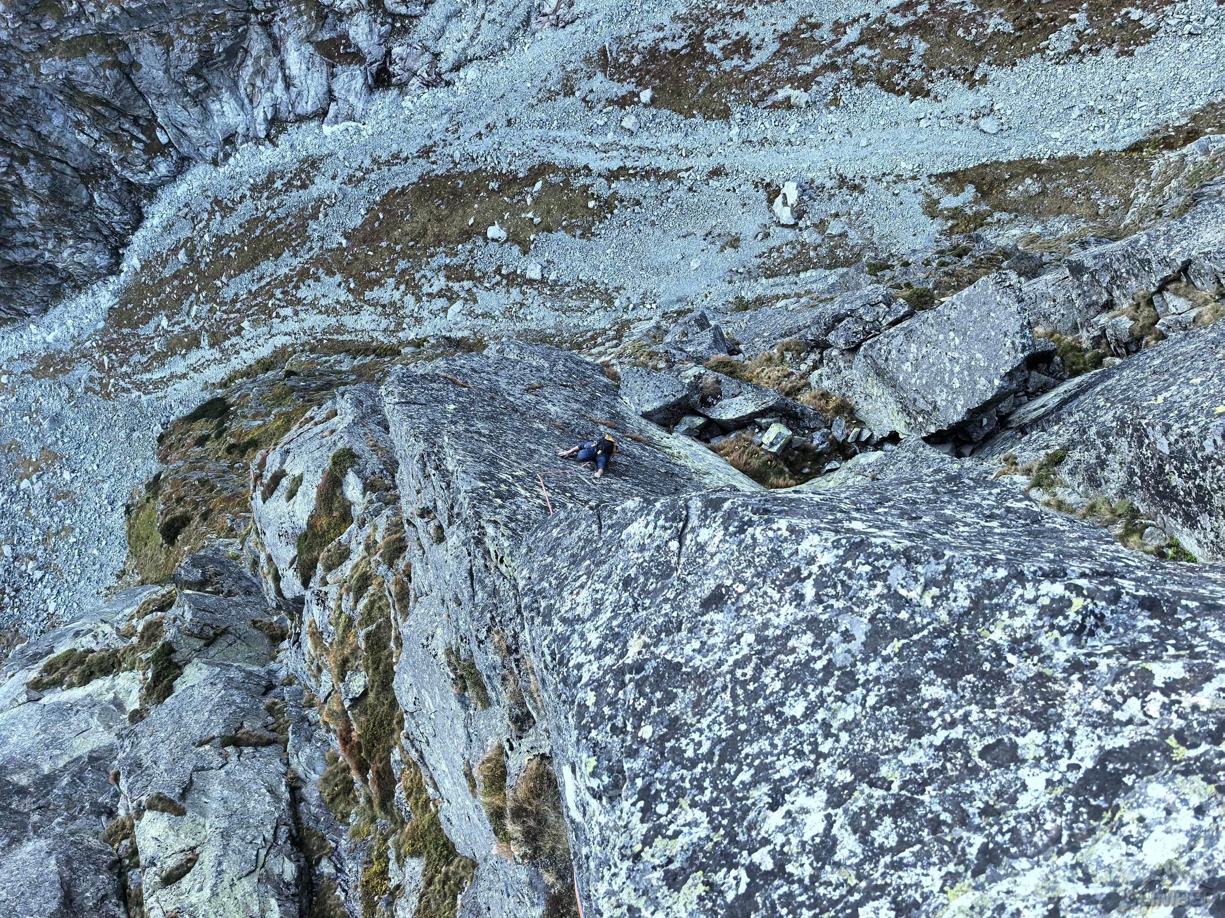 Na ostatnim wyciągu (VII) mam nadzieję, że nie będzie powtórki z rozrywki – na szczęście tym razem udaje się od strzału. Wspinamy się po krawądkach litą Czarną Płytą i po czwartej wpince trawersujemy technicznie w prawo za kant, gdzie kontynuujemy wzdłuż rys (łatwiej) na własnej asekuracji prosto na wierzchołek. Wracamy zjazdami wzdłuż linii drogi (45m pod L5, 35m, 55m aż do stanowiska startowego i z niego 40m do żlebu). Pod ścianą meldujemy się o zmroku, udało się więc klasycznie rzutem na taśmę - dzięki temu mieliśmy jednak dwa razy więcej fajnego wspinania i dobrą lekcję z motywacji 😉. Drogę oczywiście bardzo polecamy!