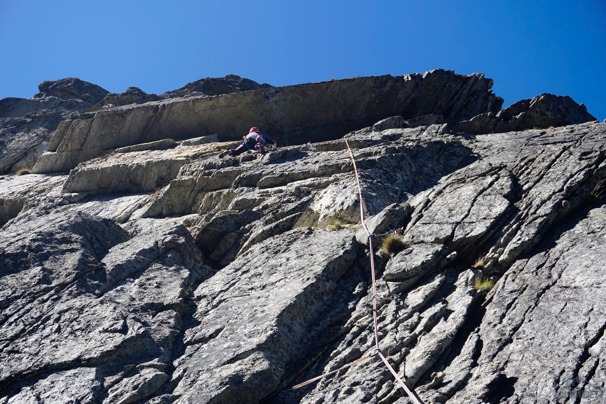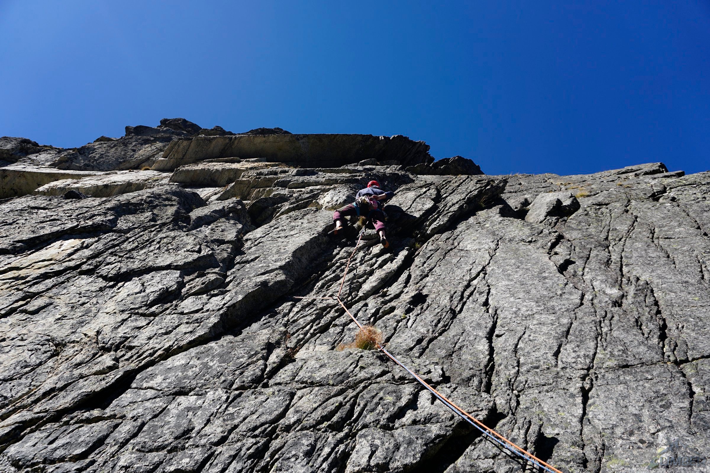 Czwarty odcinek zaczynamy od łatwego podejścia skośnie w lewo do krótkiej przewieszonej ścianki, pokonujemy ją bulderową sekwencją (VIII, spity) i wychodzimy na połogą płytę. Z niej wchodzimy do ciasnego zacięcia (ok. VII) i w dogodnym miejscu przewijamy się w lewo za kant, gdzie czeka jeszcze spękana płyta prowadząca na półkę w filarze. Tym razem moja kolej na prowadzenie – nie odczytuję prawidłowo cruxa, po chwili jednak rozpracowuję problem i przekazuję szczegółowe informacje koledze, który sprawnie przechodzi całość fleszem.