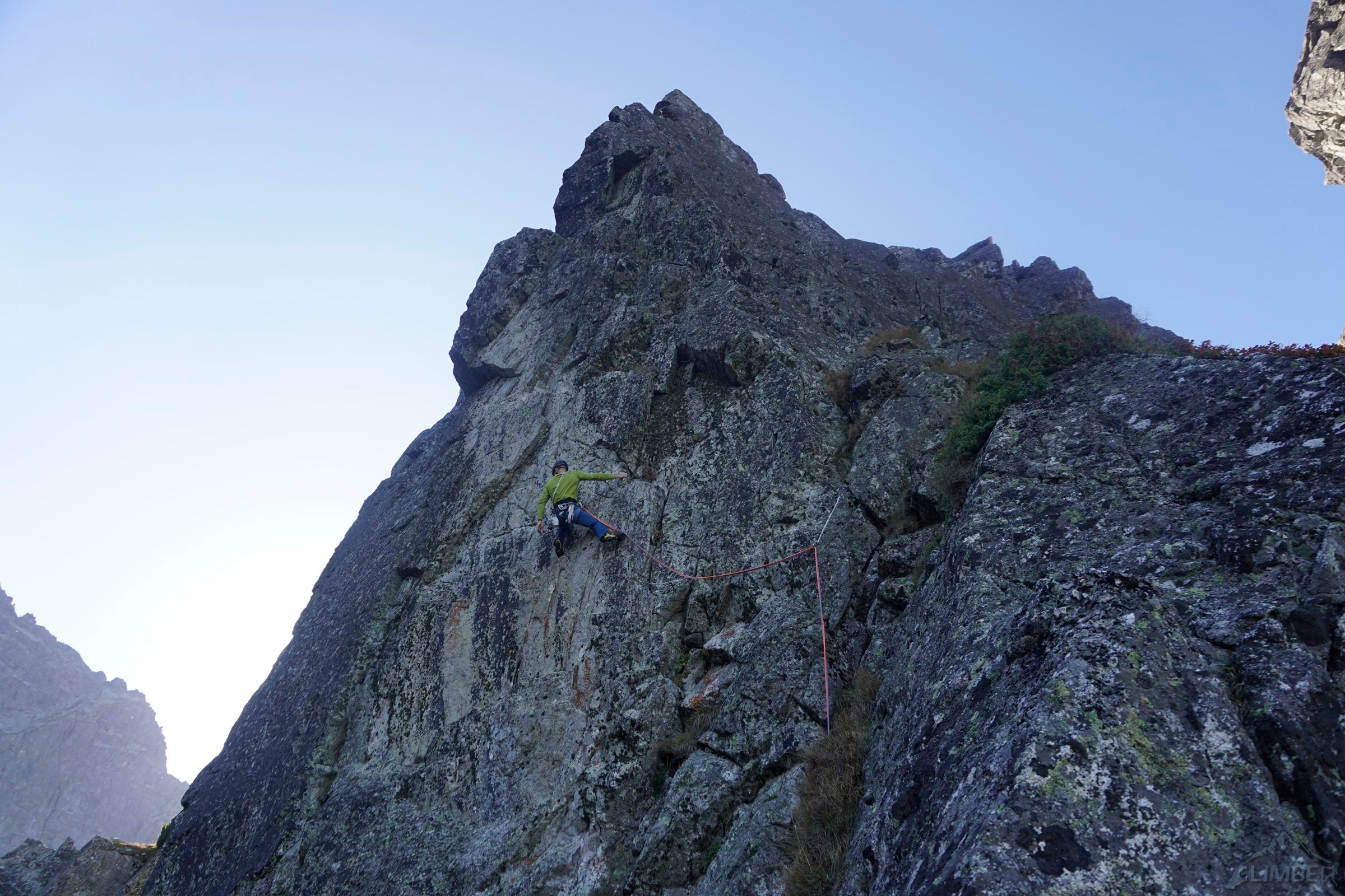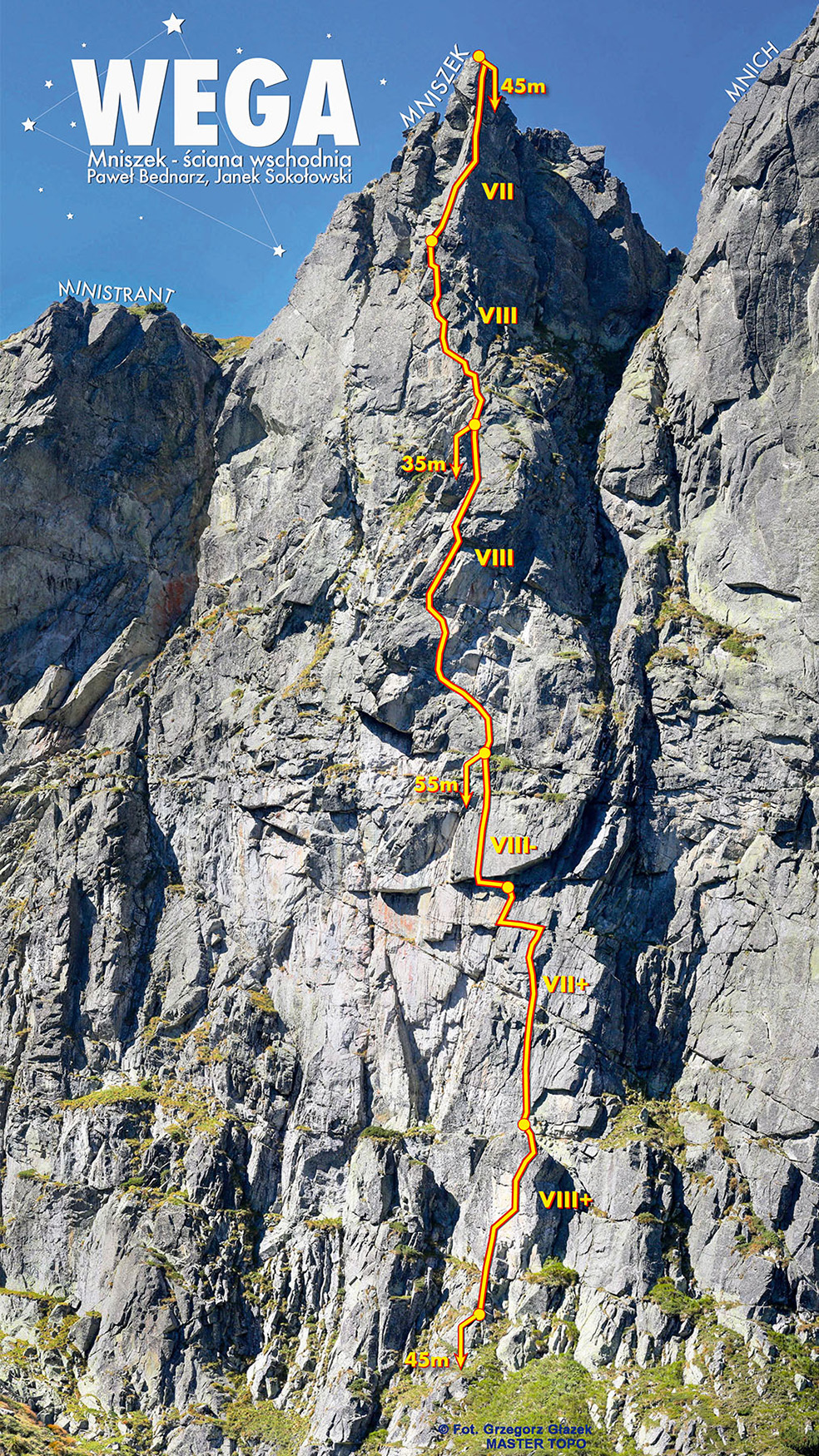 Dzień po wspinaniu po słowackiej stronie Tatr wybieram się z Damianem na Wegę (VIII+ 160m) na Mniszku. Droga okazuje się świetna - oferuje różnorodne wspinanie o dużej intensywności, do przejścia są bowiem cztery ósmekowe i dwa siódemkowe wyciągi w zaskakująco dobrej skale. Klasą porównać można ją do American Beauty na sąsiedniej ścianie (relacja z tego wielkiego klasyka TUTAJ), wymaga jednak zakładania własnej asekuracji – na wyciągu przez Okap Śmigło całkowicie, na pozostałych częściowo w łatwiejszym terenie. Z pewnością jest to jedna z lepszych linii w tych trudnościach w Tatrach i mimo niewielu przejść do tej pory zasługuje na miano nowoczesnego klasyka!