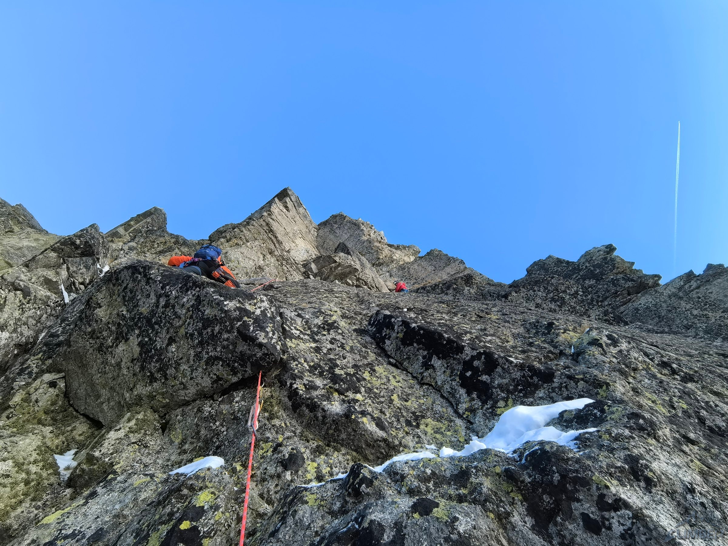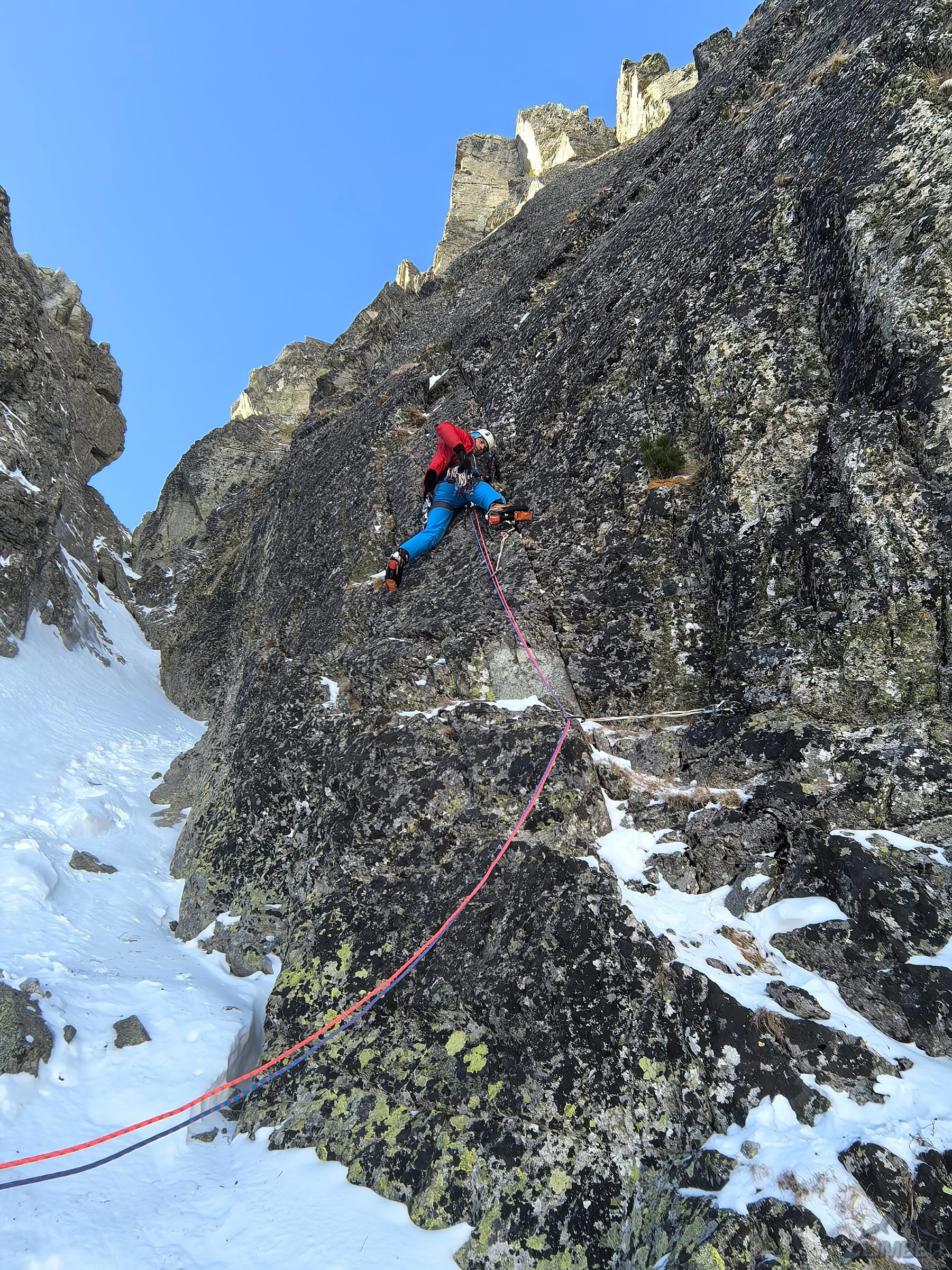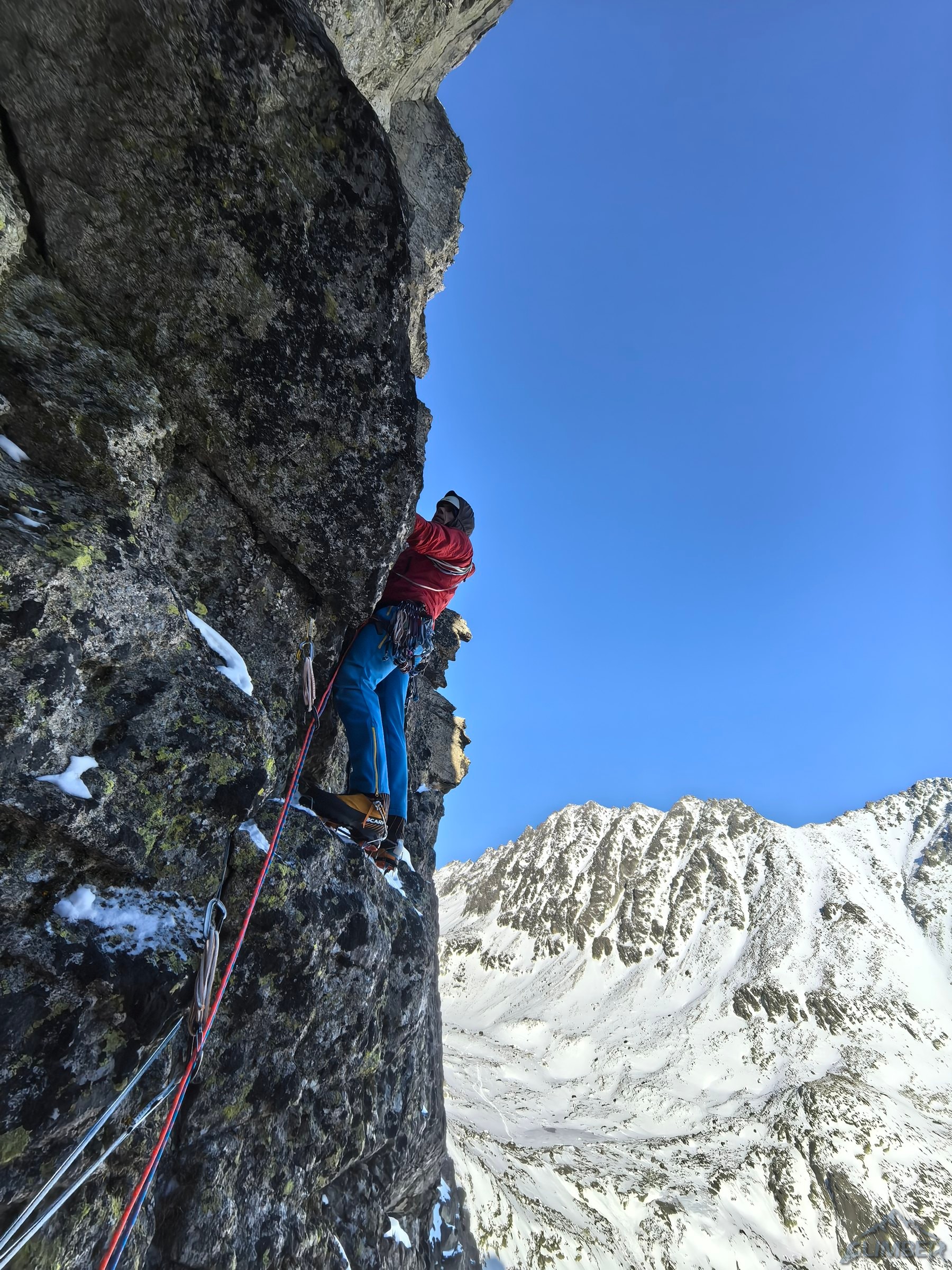 Z Moka do którego z Michałem i Szymonem zmierzaliśmy dostajemy info, że ściany zaklejone śniegiem, zmieniamy więc plany na coś pewniejszego. Po słowackiej stronie niżej położone ściany suche, słonecznie i z lekkim mrozem – wyciągamy więc z listy pozycję dobrą na takie warunki, Bumerang (M7+) na Skrajnym Solisku. Droga mimo niewielkiej długości oferuje zajmujące wspinanie na własnej asekuracji od początku do końca i nie dziwi, że mimo iż uklasyczniona zimowo została dopiero w 2024 roku (latem 2019) zyskuje status drytoolowego klasyka. Po trzech piątkowych wyciągach w płytach o mocno letnim charakterze danie główne to dwa wyciągi M7+. Szczególnie drugi z nich to prawdziwa tatrzańska perełka – przewieszone zacięcie z cienką rysą wpadło mi w oko już kilka lat temu podczas przejścia letniego klasyka (Kantu) tuż obok.