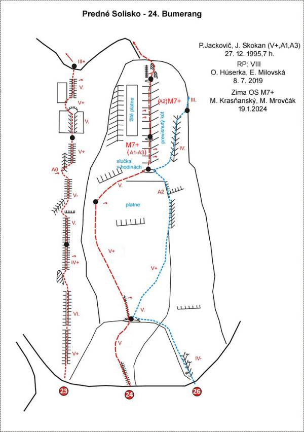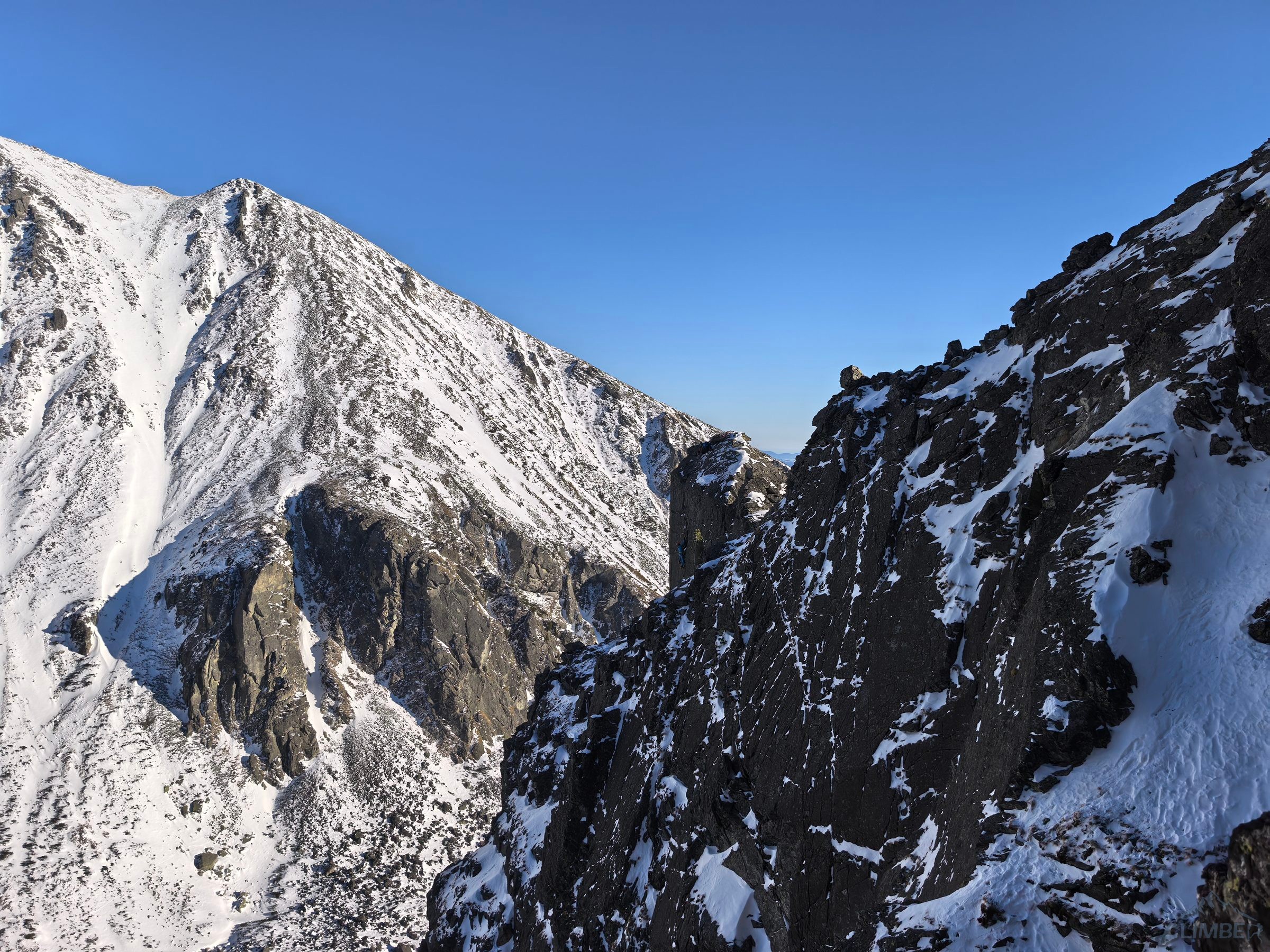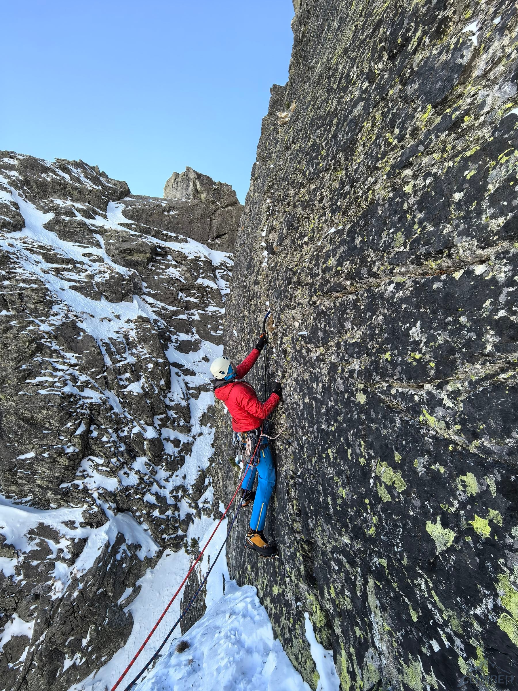Z Moka do którego z Michałem i Szymonem zmierzaliśmy dostajemy info, że ściany zaklejone śniegiem, zmieniamy więc plany na coś pewniejszego. Po słowackiej stronie niżej położone ściany suche, słonecznie i z lekkim mrozem – wyciągamy więc z listy pozycję dobrą na takie warunki, Bumerang (M7+) na Skrajnym Solisku. Droga mimo niewielkiej długości oferuje zajmujące wspinanie na własnej asekuracji od początku do końca i nie dziwi, że mimo iż uklasyczniona zimowo została dopiero w 2024 roku (latem 2019) zyskuje status drytoolowego klasyka. Po trzech piątkowych wyciągach w płytach o mocno letnim charakterze danie główne to dwa wyciągi M7+. Szczególnie drugi z nich to prawdziwa tatrzańska perełka – przewieszone zacięcie z cienką rysą wpadło mi w oko już kilka lat temu podczas przejścia letniego klasyka (Kantu) tuż obok.