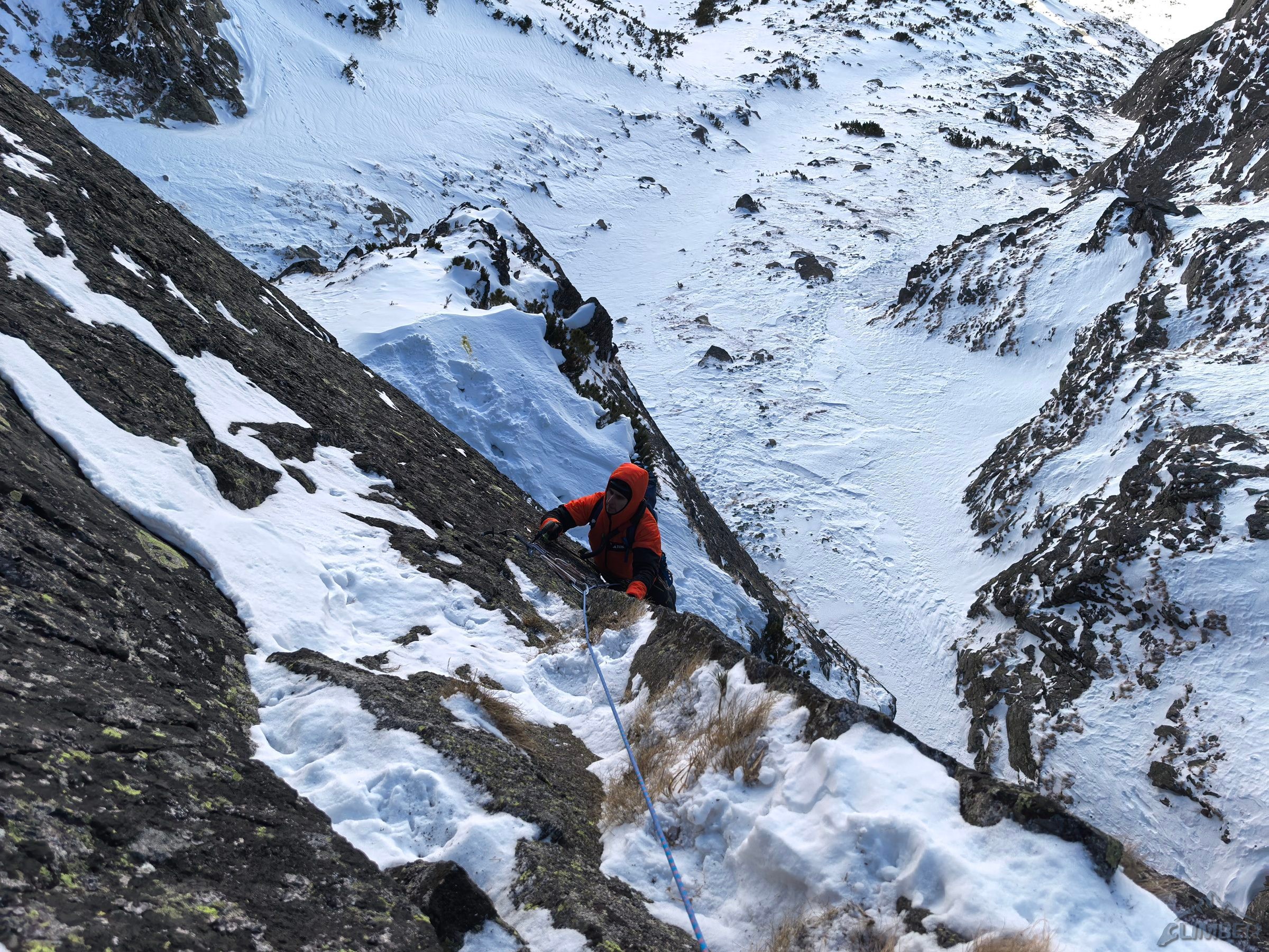 Wyciąg ma raptem 10 metrów ale jest bardzo treściwy (latem VII, zimą M7+ ale o ile tyle ma ostatni to tutaj raczej M7), a do jedynego haka trzeba dokładać własny sprzęt. W dwóch miejscach są wyraźnie słabsze chwyty i niełatwo o wypadnięcie – koledze udaje się jednak utrzymać bez konieczności powtarzania i po chwili zameldować na półce (haki) pod daniem głównym.