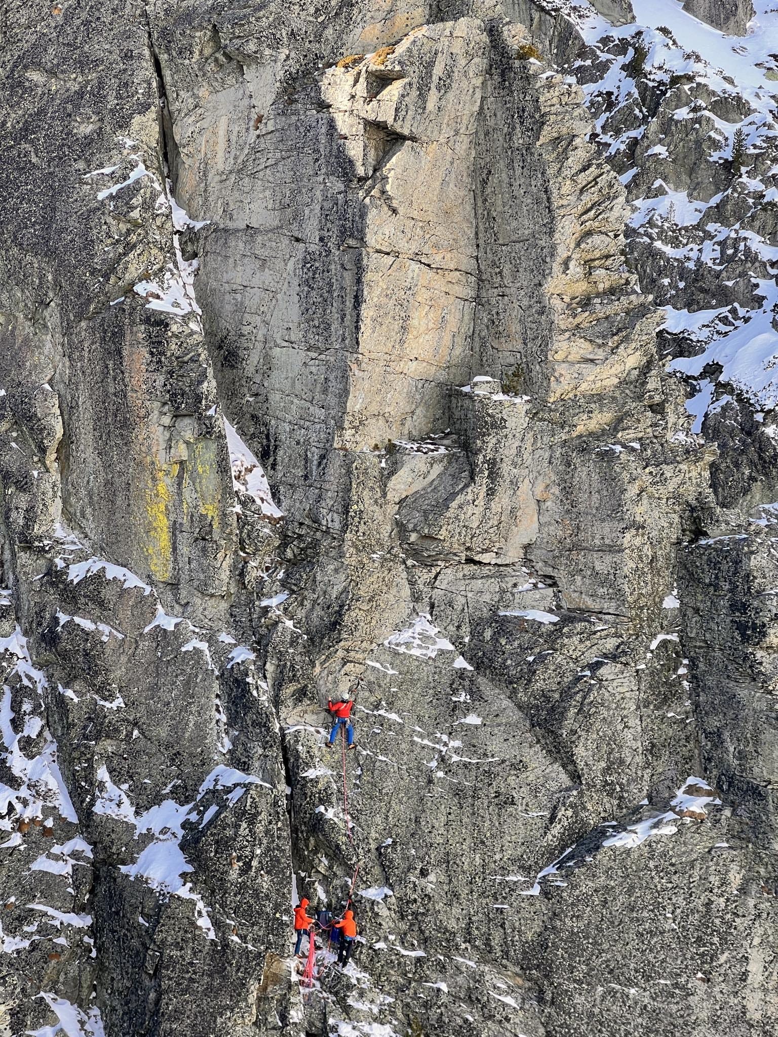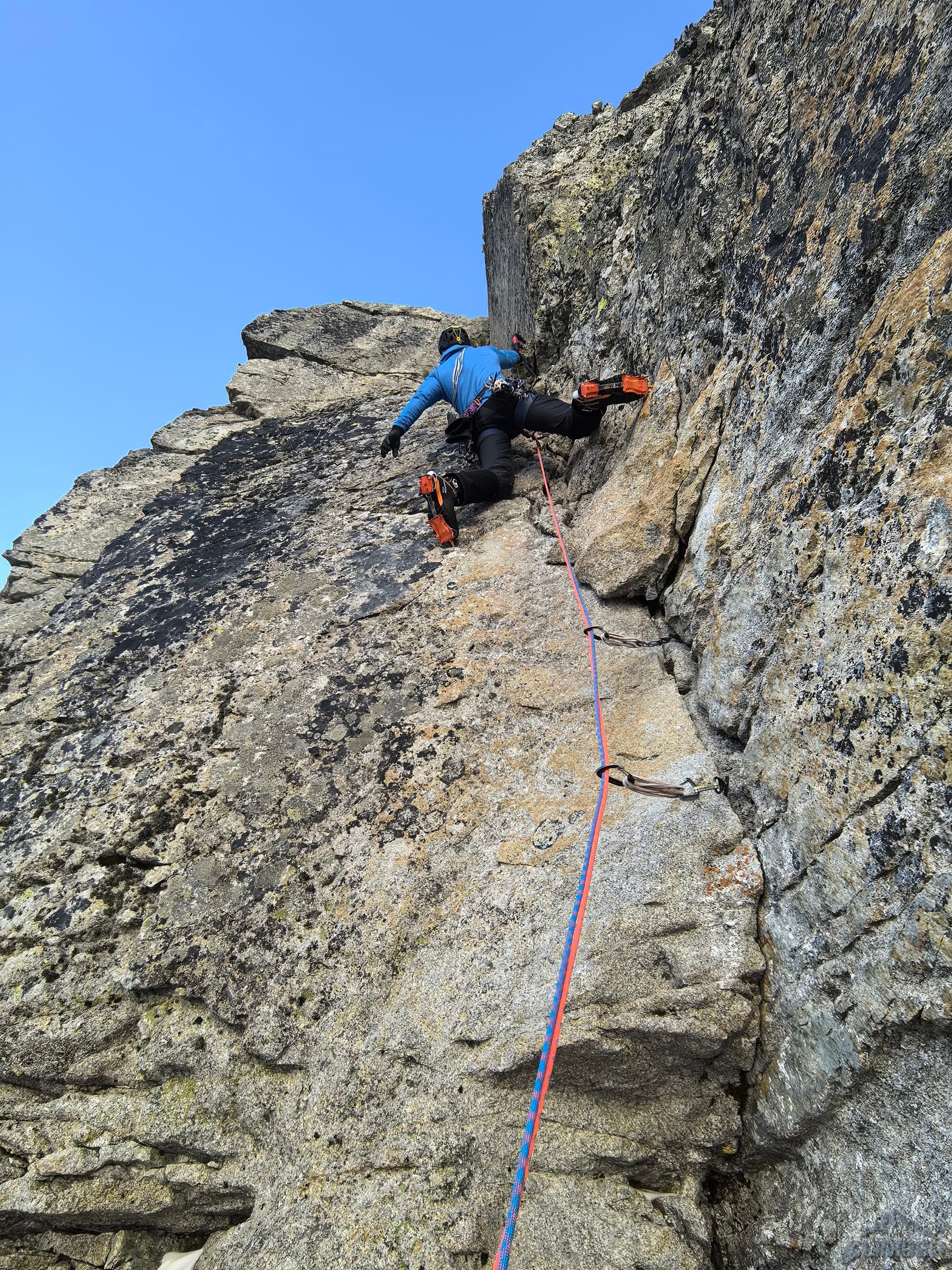 Trzeci odcinek (V/V+, latem ok. M5+) to efektowny start przez powietrzny kant na prawo i przewinięcie przez odspojony głaz na tarciową płytę powyżej. Letni charakter wyciągu daje mimo wszystko dobre możliwości przejścia z dziabami – pod koniec mamy piękną rysą i czujny trawers w prawo na półeczkę, gdzie robimy stanowisko. Nad nami pierwsze z dwóch zacięć, decydujących o trudnościach drogi – prowadzenie od Szymona przejmuje więc nasz etatowy drytoolowiec czyli Michał 😊.