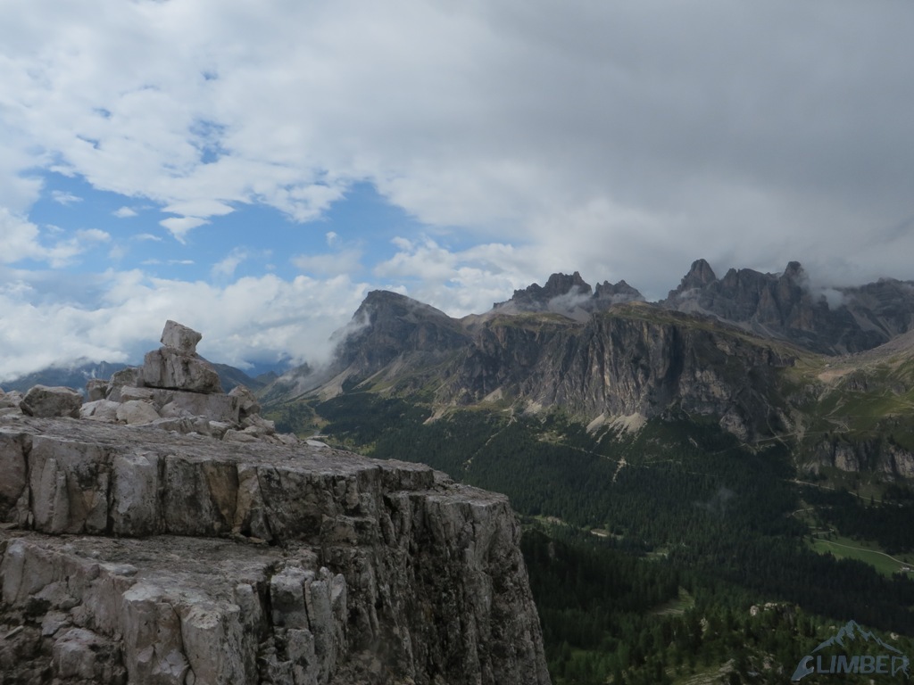 Czując niedosyt i widząc, iż deszcz powinien pojawić się dopiero za 1-2 godziny podchodzimy pod Armidę (VI), którą wcześniej robili Mariusz z Pawłem - wspinanie głównie na własnej z obitą kluczową płytką, która jest bardzo wytężająca. Krótka dyskusja, napływ spręża i za chwilę zaczynamy się wspinać, już tylko w dwójkę z Jurasem. Po chwili na dole zbierają się pozostałe zespoły, które już pokończyły drogi i mają niezły widok na nasze poczynania 😉. Dzięki temu mam pamiątkę w postaci fotki Mrocznego, do którego relacji z tego dnia odsyłam - TUTAJ. Niestety pogoda nie wytrzymała i ostatni, na szczęście już łatwy wyciąg, robiliśmy w deszczu. Na szczycie na chwilę odpuściło więc mogliśmy podziwiać widoki, m.in. na sąsiednie Averau, niesamowite turnie Croda da Lago i majestatyczną Tofanę di Rozes. Później pozostaje nam powrót na camp i rozpoczęcie imprezy bo wiadomo było iż kolejnego dnia znowu ma lać i można zapomnieć o jakimkolwiek poważnym działaniu…