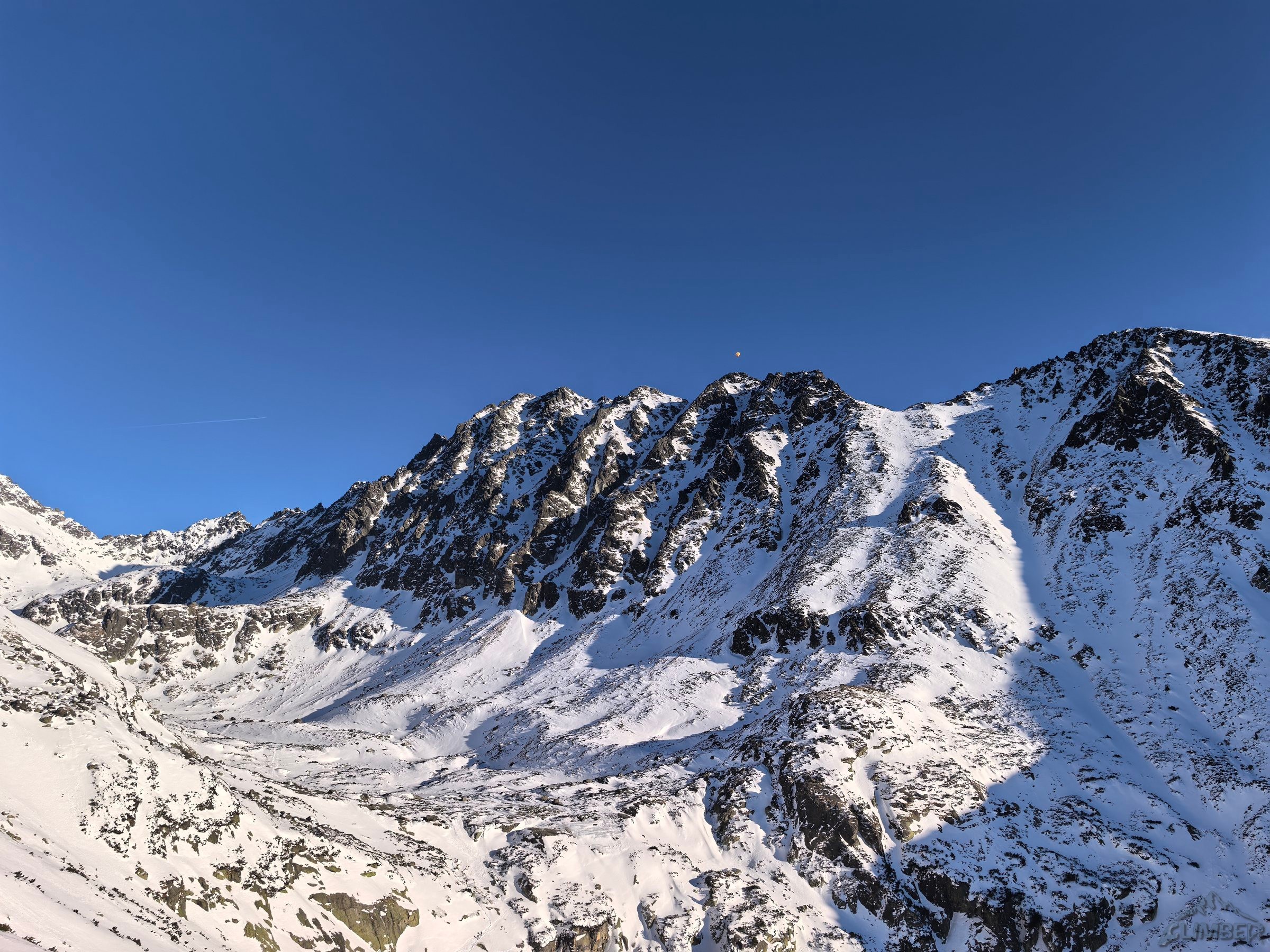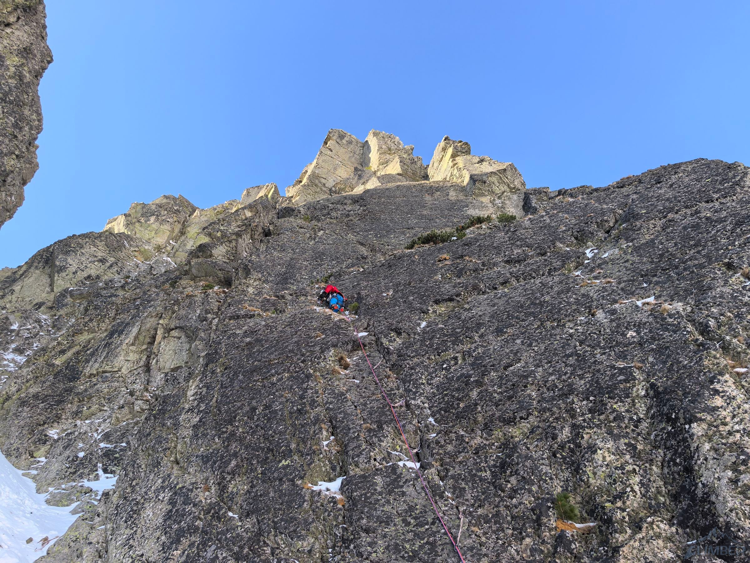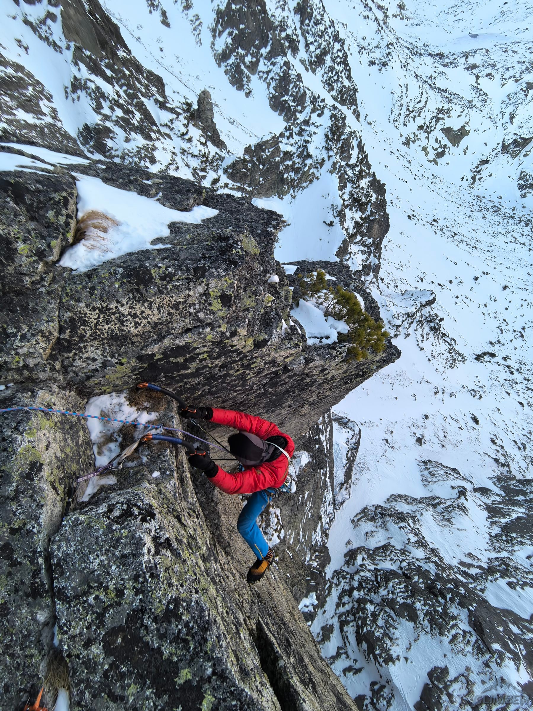 Z Moka do którego z Michałem i Szymonem zmierzaliśmy dostajemy info, że ściany zaklejone śniegiem, zmieniamy więc plany na coś pewniejszego. Po słowackiej stronie niżej położone ściany suche, słonecznie i z lekkim mrozem – wyciągamy więc z listy pozycję dobrą na takie warunki, Bumerang (M7+) na Skrajnym Solisku. Droga mimo niewielkiej długości oferuje zajmujące wspinanie na własnej asekuracji od początku do końca i nie dziwi, że mimo iż uklasyczniona zimowo została dopiero w 2024 roku (latem 2019) zyskuje status drytoolowego klasyka. Po trzech piątkowych wyciągach w płytach o mocno letnim charakterze danie główne to dwa wyciągi M7+. Szczególnie drugi z nich to prawdziwa tatrzańska perełka – przewieszone zacięcie z cienką rysą wpadło mi w oko już kilka lat temu podczas przejścia letniego klasyka (Kantu) tuż obok.