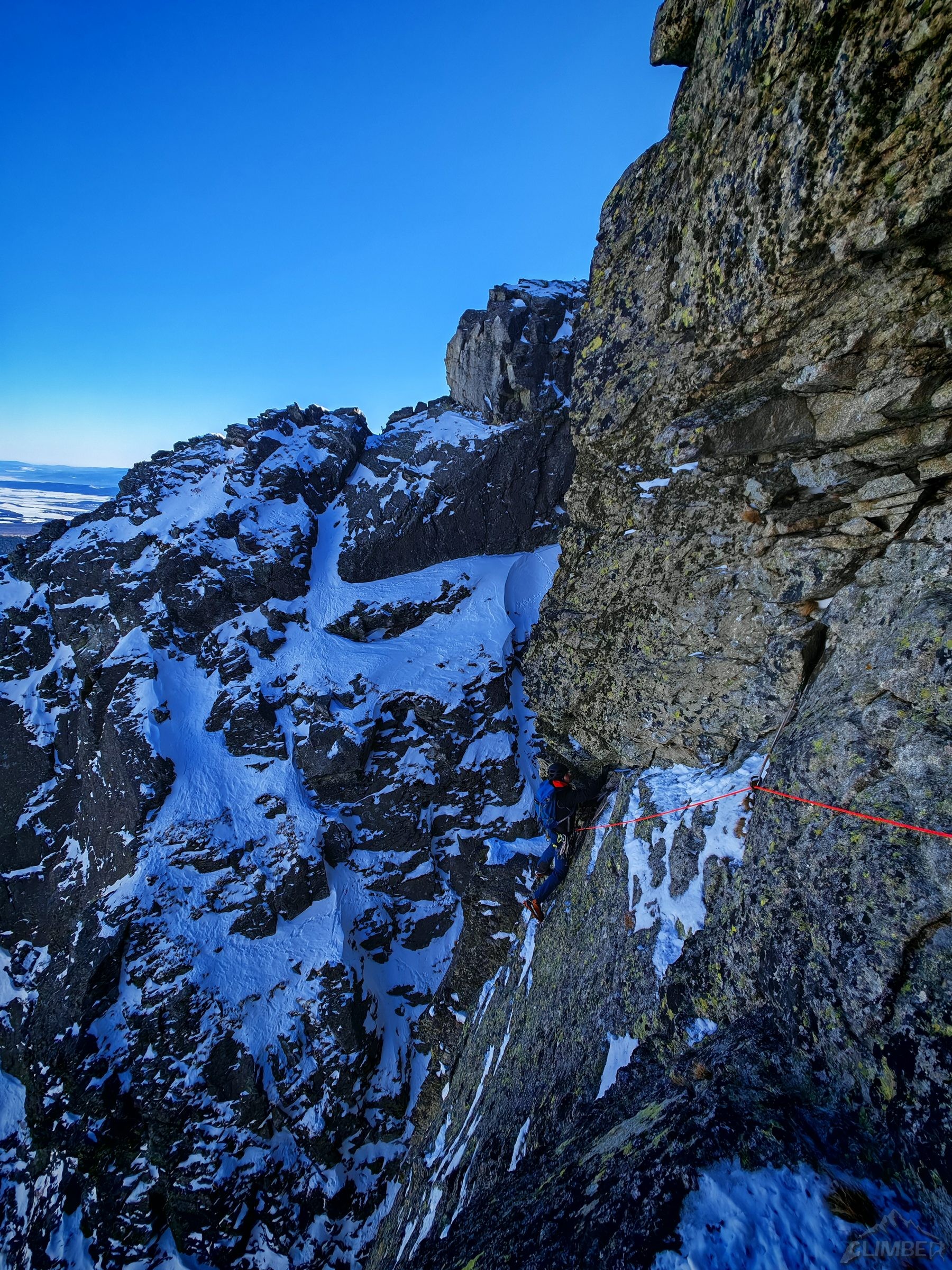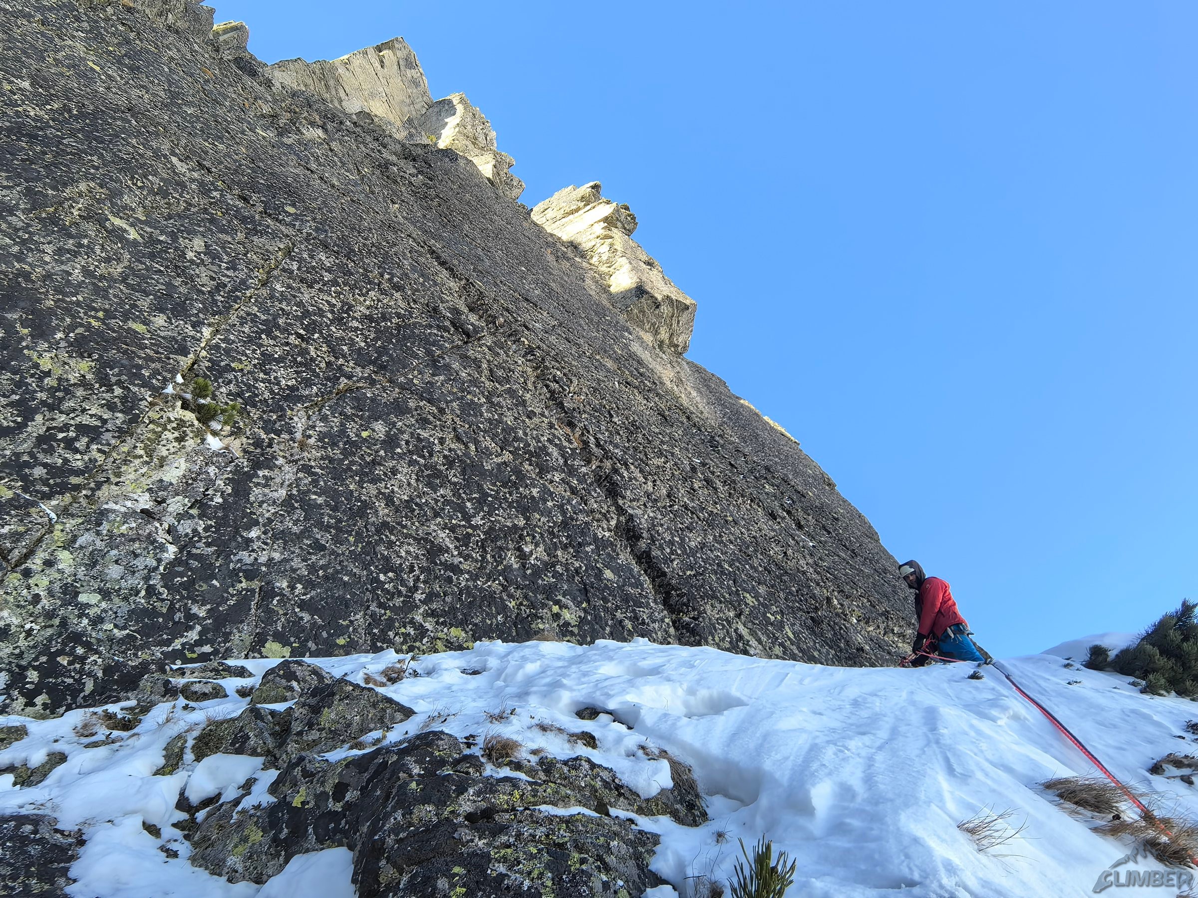 Wyciąg ma raptem 10 metrów ale jest bardzo treściwy (latem VII, zimą M7+ ale o ile tyle ma ostatni to tutaj raczej M7), a do jedynego haka trzeba dokładać własny sprzęt. W dwóch miejscach są wyraźnie słabsze chwyty i niełatwo o wypadnięcie – koledze udaje się jednak utrzymać bez konieczności powtarzania i po chwili zameldować na półce (haki) pod daniem głównym.
