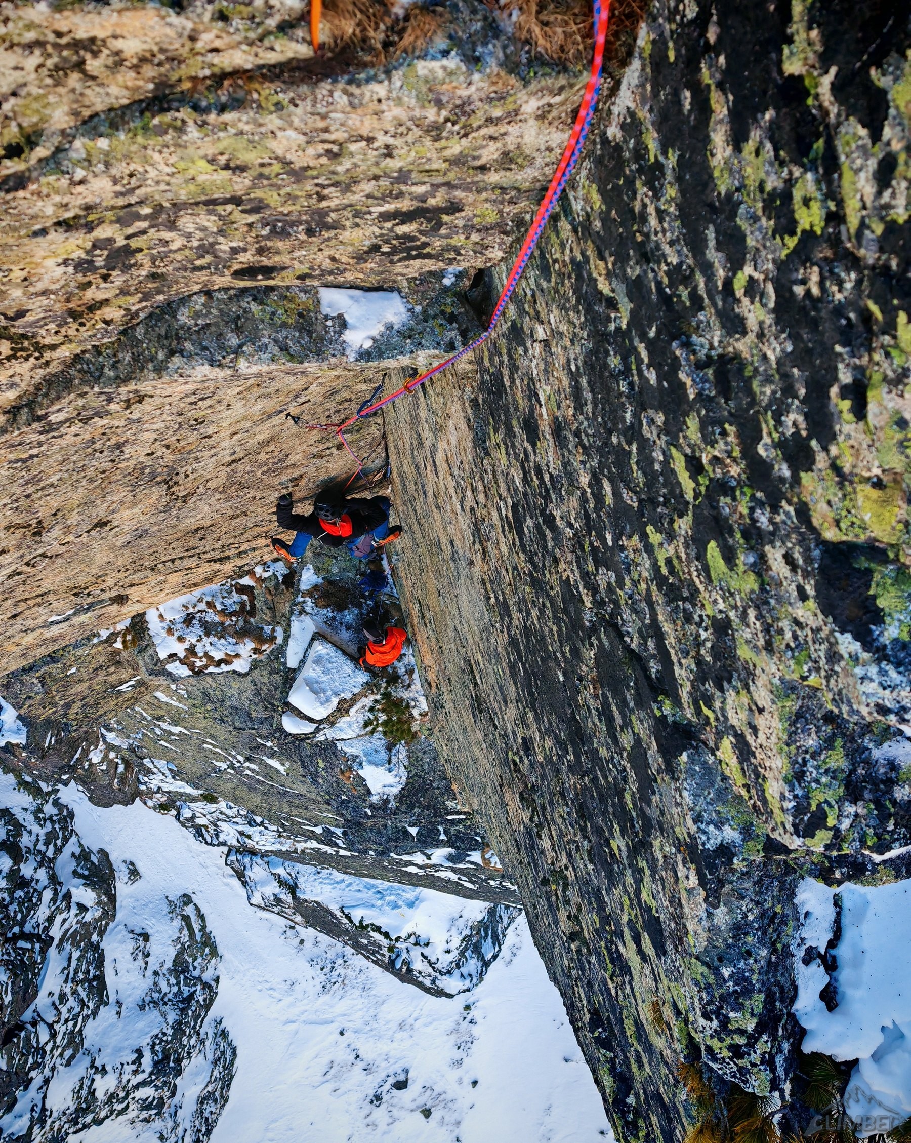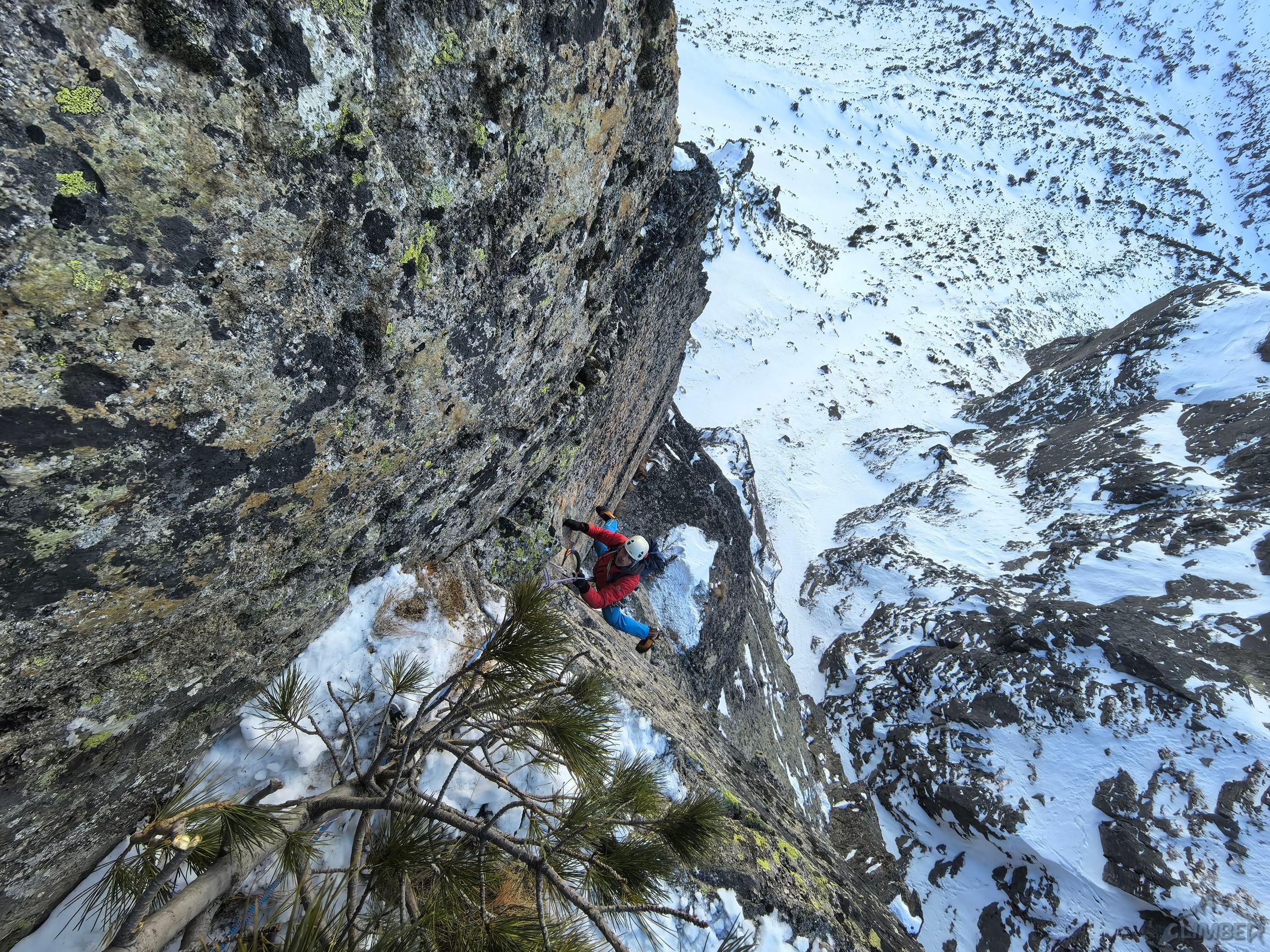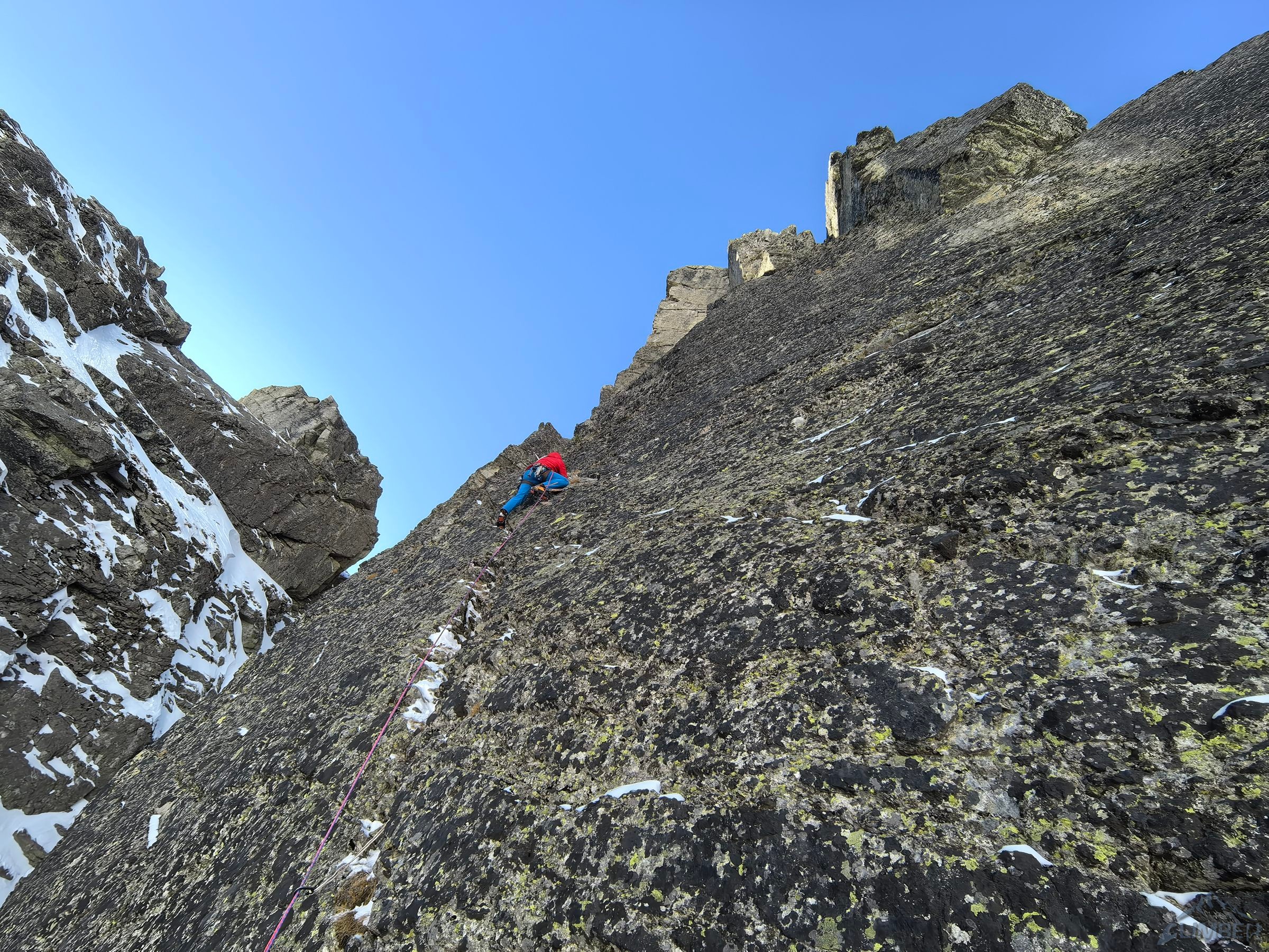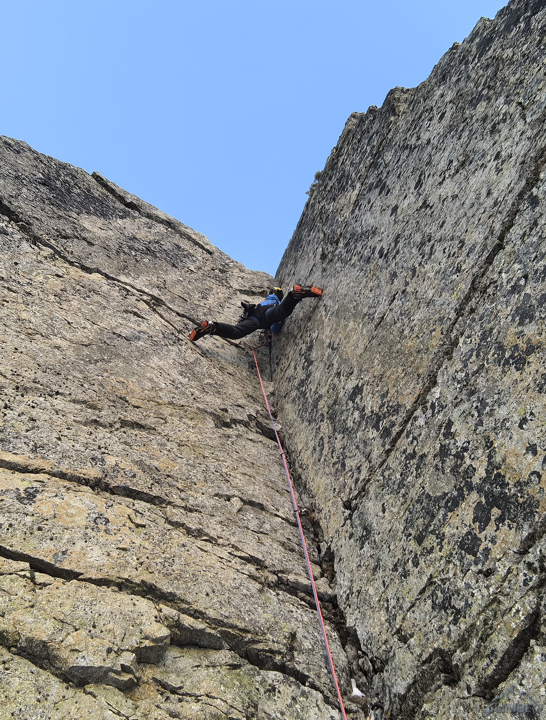 Trzeci odcinek (V/V+, latem ok. M5+) to efektowny start przez powietrzny kant na prawo i przewinięcie przez odspojony głaz na tarciową płytę powyżej. Letni charakter wyciągu daje mimo wszystko dobre możliwości przejścia z dziabami – pod koniec mamy piękną rysą i czujny trawers w prawo na półeczkę, gdzie robimy stanowisko. Nad nami pierwsze z dwóch zacięć, decydujących o trudnościach drogi – prowadzenie od Szymona przejmuje więc nasz etatowy drytoolowiec czyli Michał 😊.