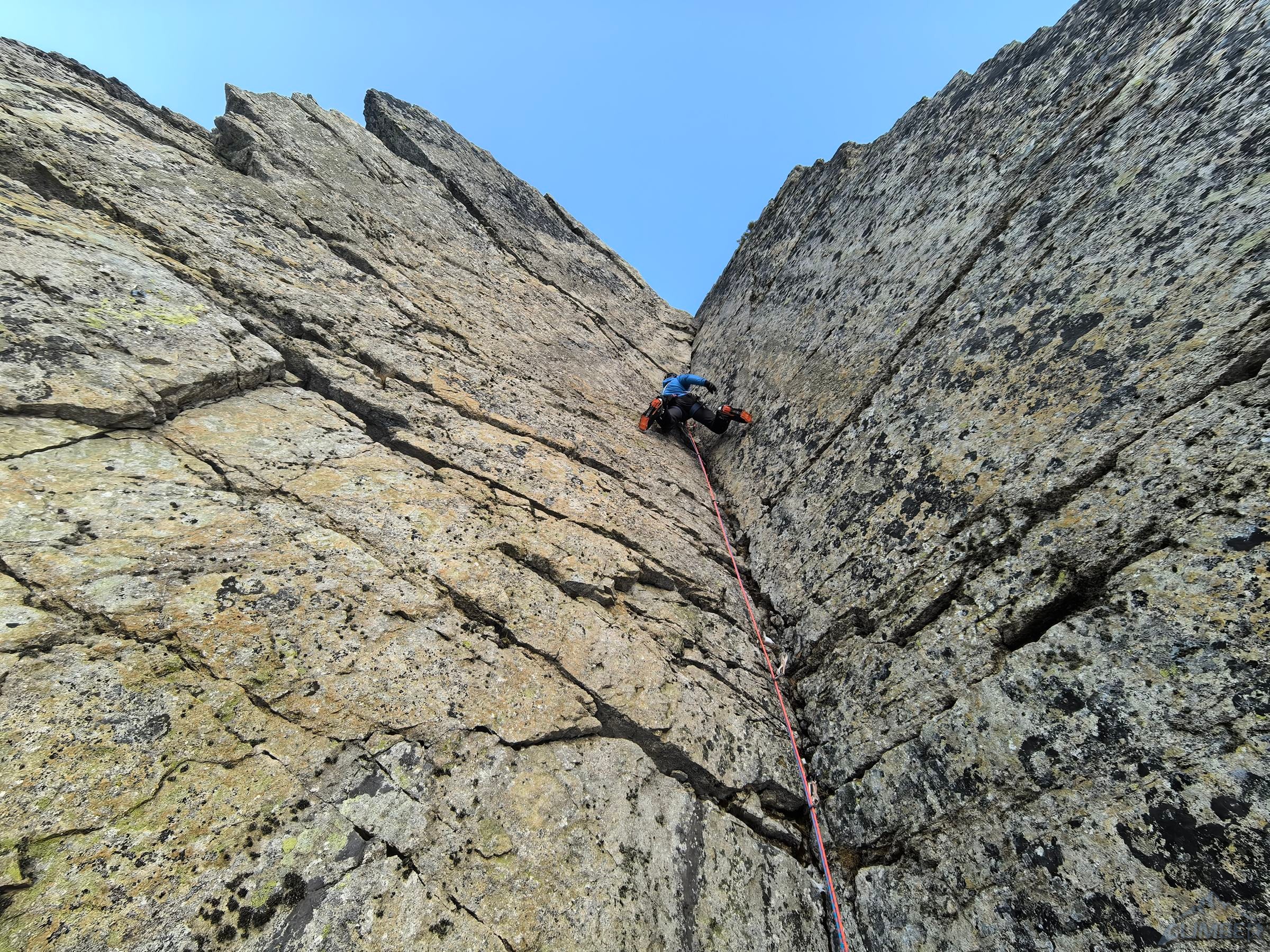 Początkowe metry w rysie są całkiem sprężne (V+/VI-, ok. M5+), miejscami chwyty mają bowiem mocno „letni” charakter a stopnie nie są zbyt pewne. Jest jeden słaby hak, asekuracja z friendów i kostek przyzwoita. Po pokonaniu ostatniego trudnego miejsca dostajemy się do trawiastej załupy, którą kontynuujemy skośnie w lewo aż do półeczki na prawo od komina – znajdziemy tutaj stan z dwóch haków, który należy wzmocnić.