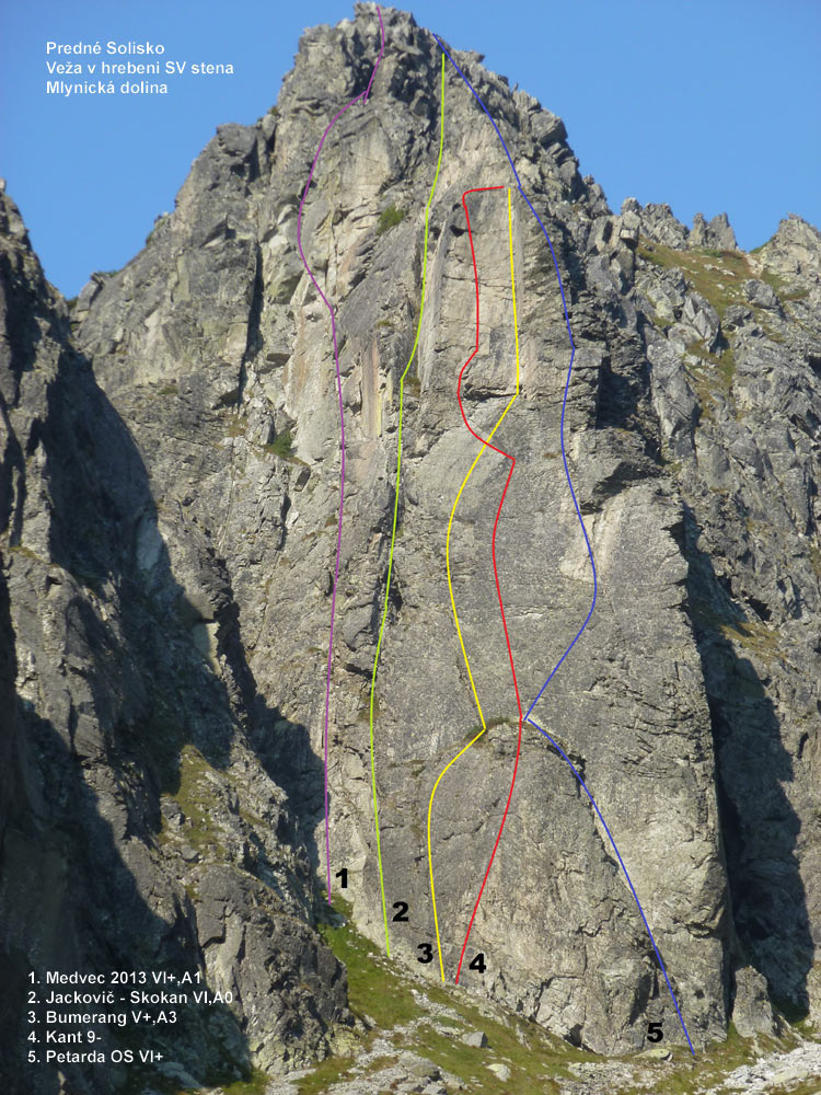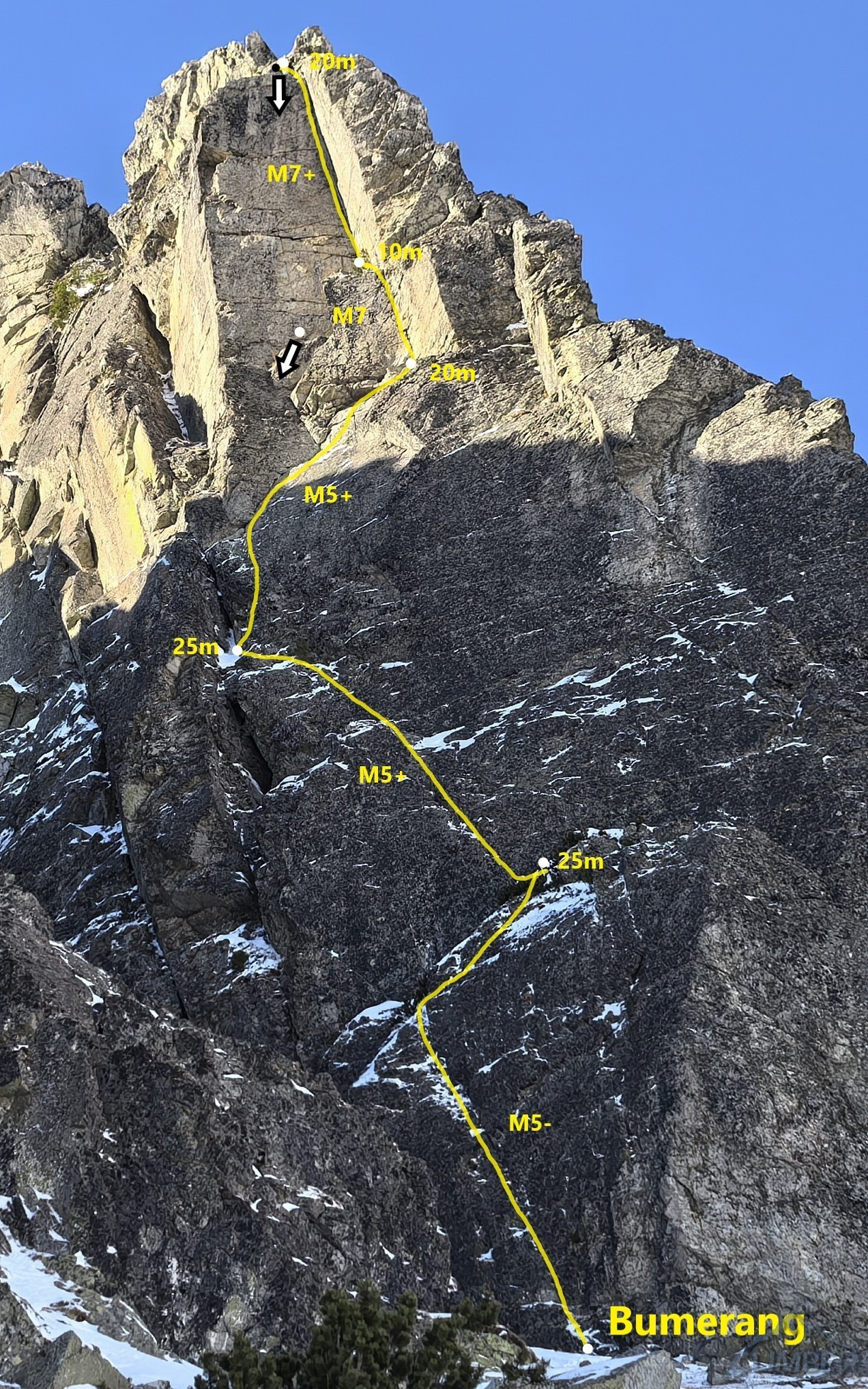 Tytułowa formacja – przewieszone zacięcie w kształcie bumerangu – robi wrażenie, do pokonania jest ok. 20 metrów, a stałe przeloty (1 dobry i 1 słaby hak oraz stara kostka) są tylko na pierwszych miejscach . Próbując w stylu OS nie ma mowy o biciu haków, kilka friendów (od mikro do #1, duble 0.3-0.5 lub kostki) w zupełności jednak wystarcza – poza jednym miejscem jest nawet całkiem komfortowo. Początkowo chwyty są w miarę dobre, mniej więcej w połowie robi się jednak wyraźnie trudniej, co w połączeniu z przewieszeniem i słabymi stopniami sprawia, że wyciąg zasługuje zgodnie z wyceną na co najmniej M7+ (latem VIII). Michał szukając jak najlepszych ustawień i korygując błędy prowadzi dobre 20 minut, "dogięcie" i wytrzymałość pozwalają mu jednak uporać się z tym pięknym odcinkiem już w pierwszej próbie. Po dotarciu do kolegi i złożeniu gratulacji zaczynamy zjazdy – pierwszy najlepiej zrobić na jednej żyle do stanowiska pod ostatnim wyciągiem Kantu, skąd 55m do żlebu (ewentualnie w dół do stanu po pierwszym wyciągu).