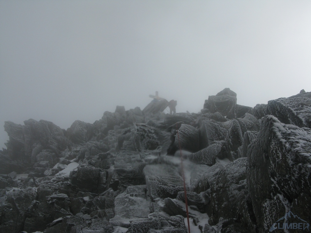 Skały są oblodzone, musimy więc wspinać się w rakach. Mimo to zapodajemy bardzo szybkie tempo i całą grań przechodzimy na asekuracji lotnej, meldując się na szczycie już ok. godziny 9 rano! Ciężko mi uwierzyć, że grań w tych warunkach "przebiegliśmy" w około 3 godziny... Schodzimy na przełęcz, gdzie zapodajemy drzemkę i czekamy na Romana podchodzącego z drugiej strony. Niestety kolega chwilę po dołączeniu do nas rezygnuje z wejścia na szczyt, zarządzamy więc powrót. Ekspresowa 2-dniowa akcja dobiega końca, wyjechaliśmy w sobotę rano a już w niedzielę w nocy jesteśmy w domach.