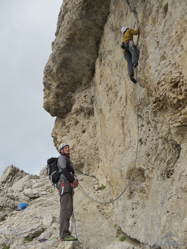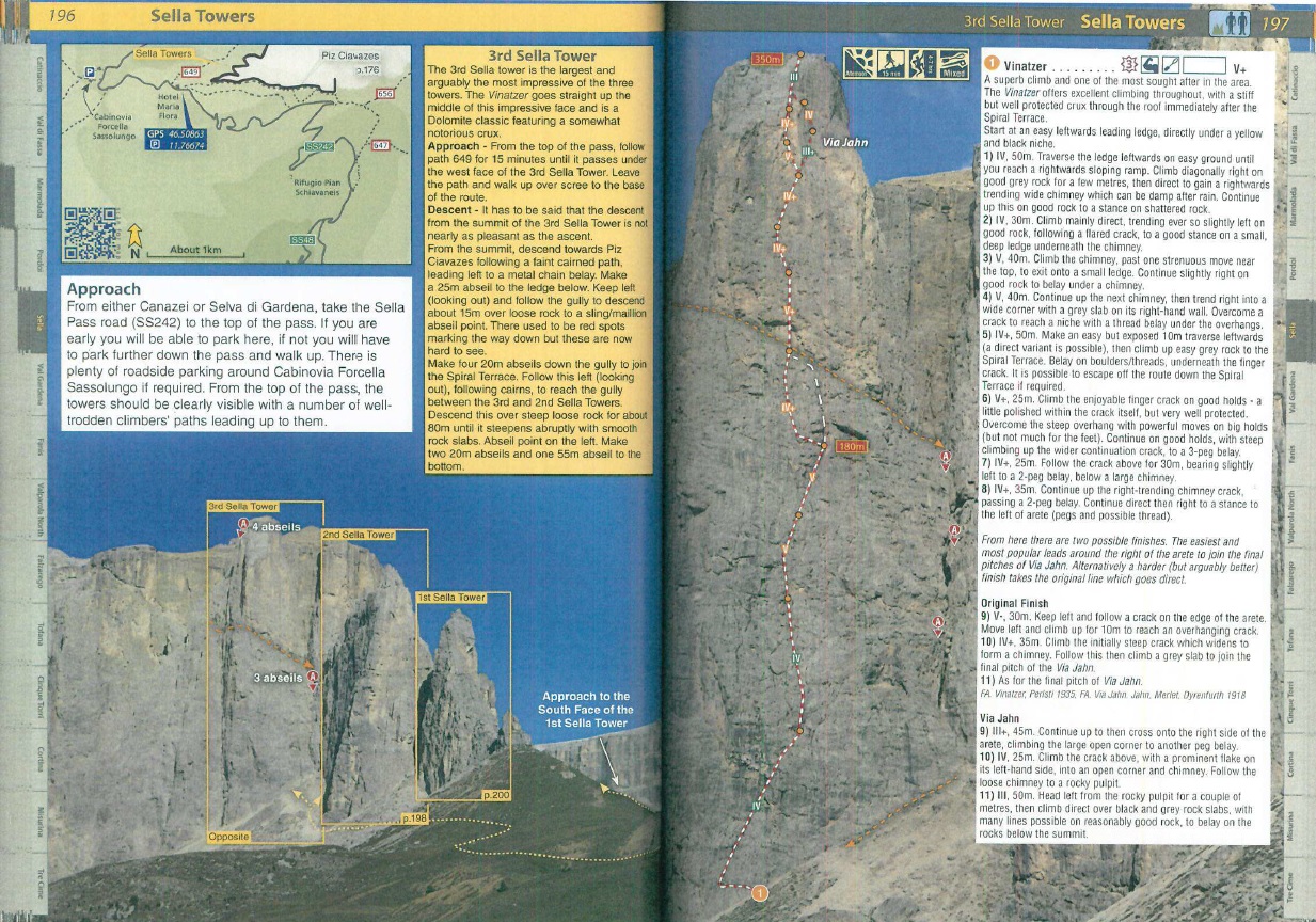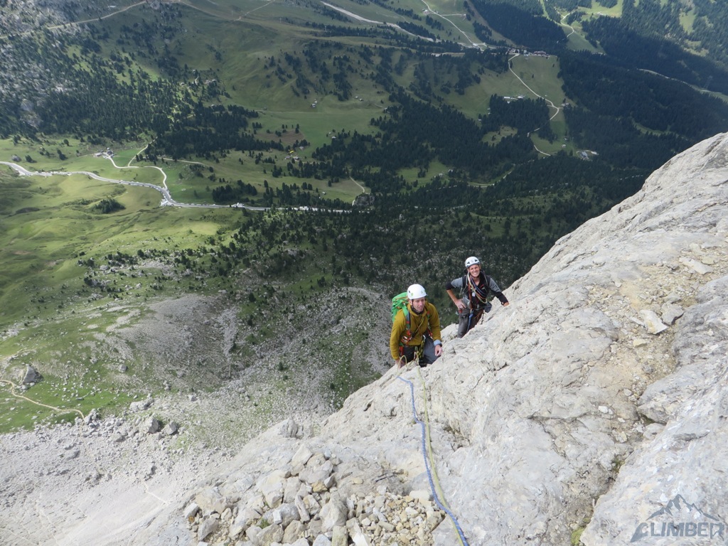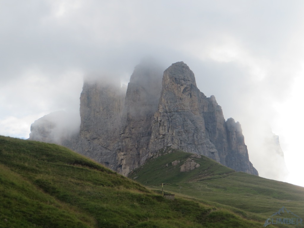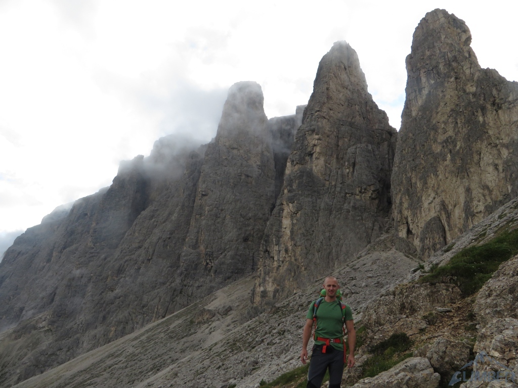 W planach był piękny i długi klasyk - Constantini-Ghedina na Tofanie, ale postraszyły nas prognozy zapowiadające popołudniowy opad, dlatego też jedziemy prawie dwie godziny na zachód by zmierzyć się z kolejną turnią i kolejną bardzo popularną drogą – prawie 400-metrowym Vinatzerem (V+) na Trzeciej Turni Sella. Podejście z samochodu jest mega przyjemne – spacer z przełęczy zajmuje nie więcej niż 30 minut. Szybko namierzamy drogę i ustawiamy się w kolejce za dwoma innymi zespołami.
