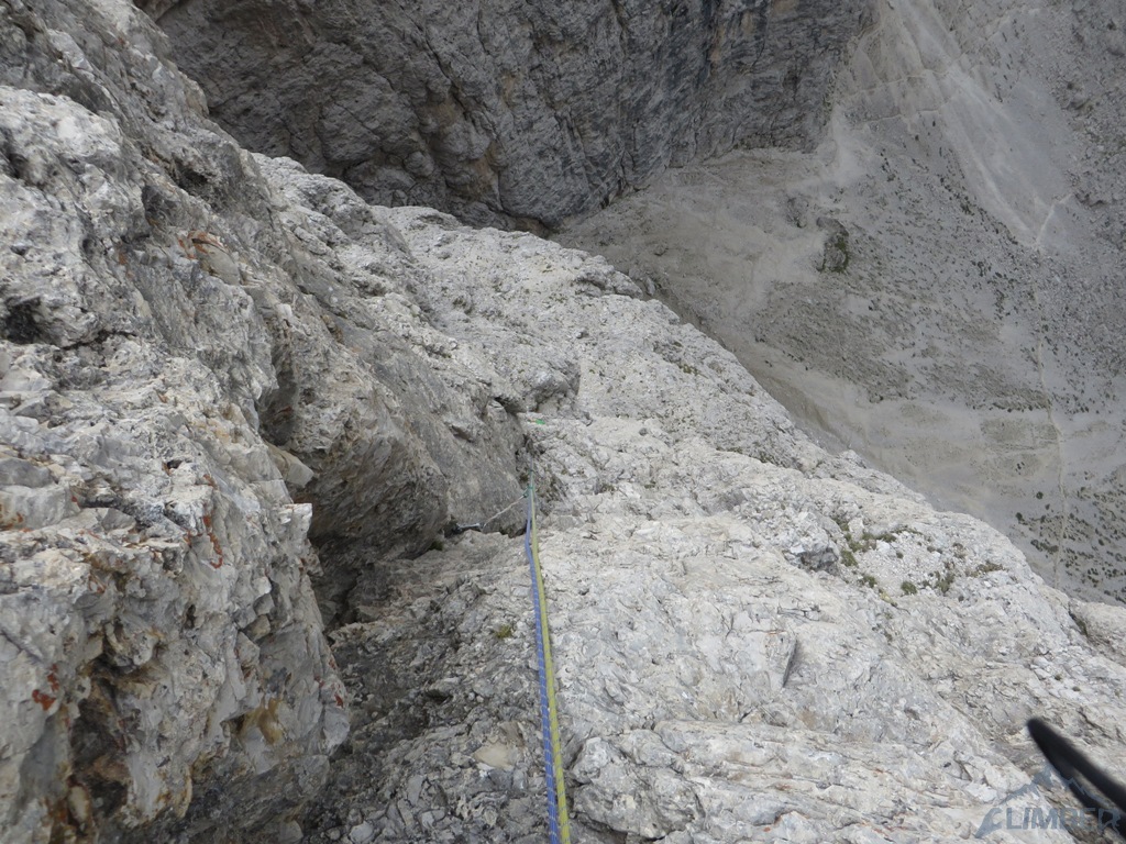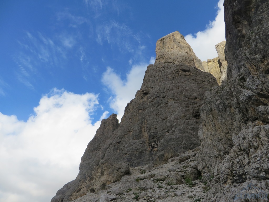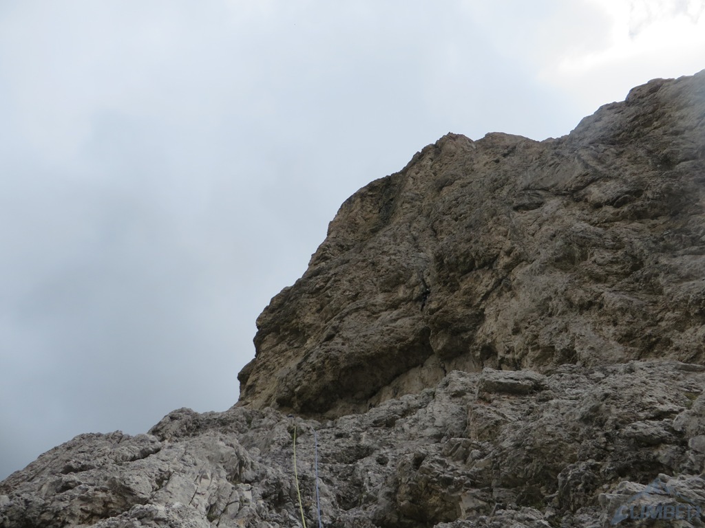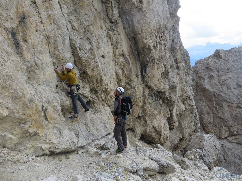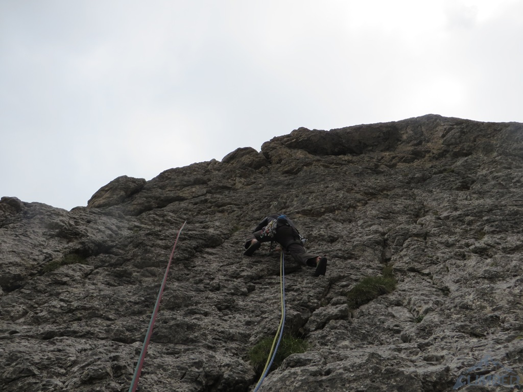 W planach był piękny i długi klasyk - Constantini-Ghedina na Tofanie, ale postraszyły nas prognozy zapowiadające popołudniowy opad, dlatego też jedziemy prawie dwie godziny na zachód by zmierzyć się z kolejną turnią i kolejną bardzo popularną drogą – prawie 400-metrowym Vinatzerem (V+) na Trzeciej Turni Sella. Podejście z samochodu jest mega przyjemne – spacer z przełęczy zajmuje nie więcej niż 30 minut. Szybko namierzamy drogę i ustawiamy się w kolejce za dwoma innymi zespołami.