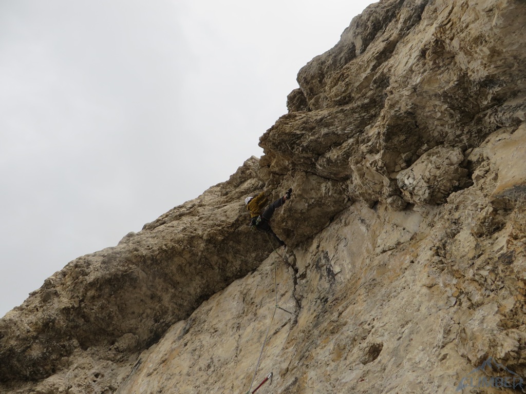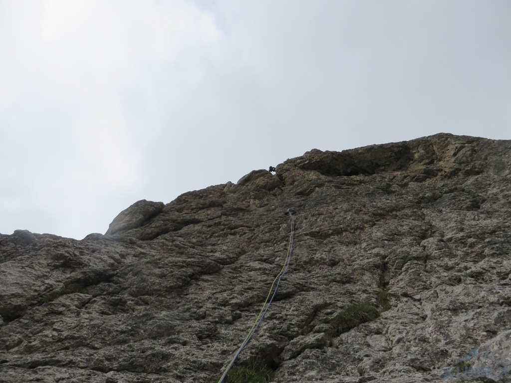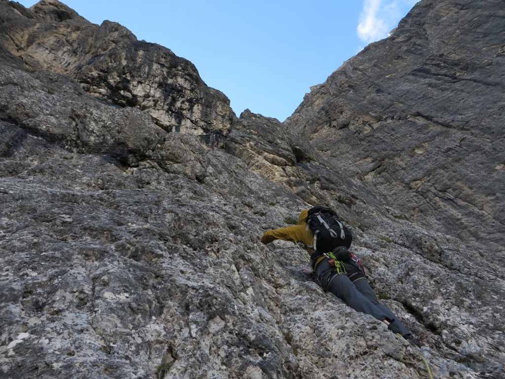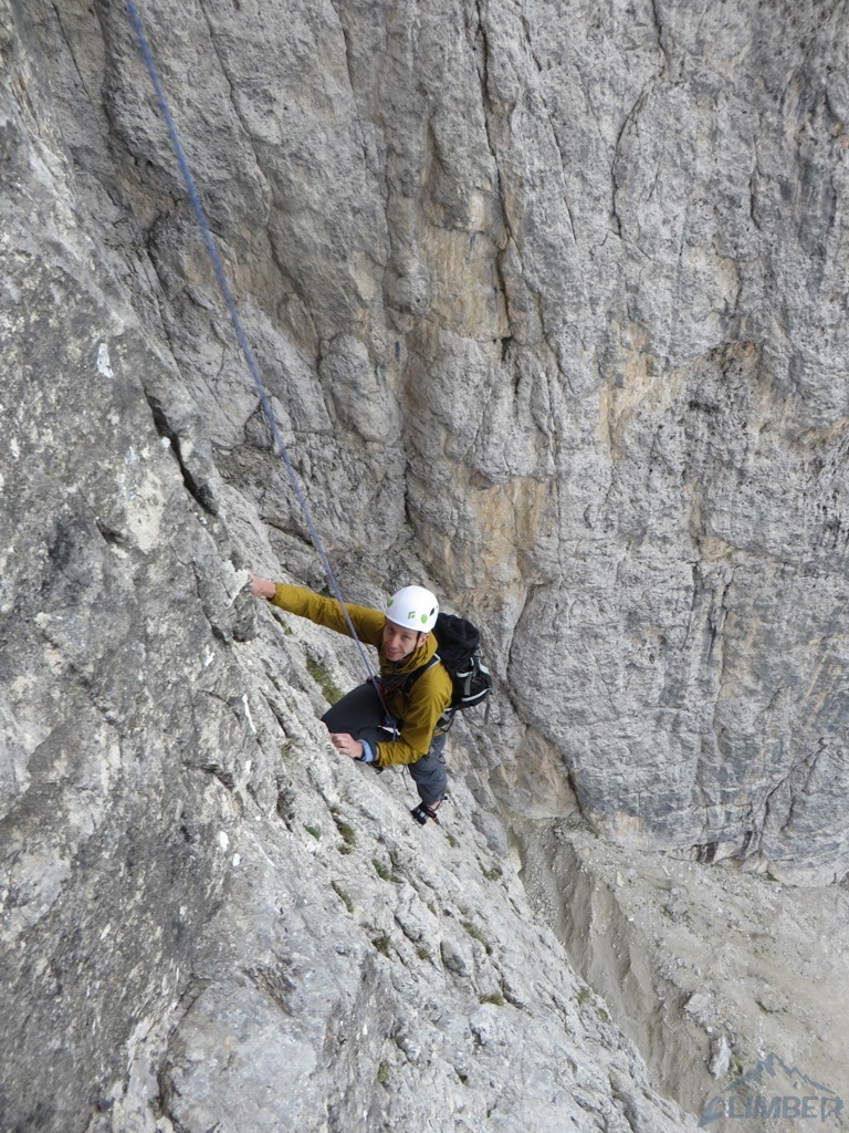 Zaczyna Jacek i szybko pokonuje pierwsze wyciągi, niestety sugeruje się wspinaczami przed nami, którzy moim zdaniem uciekli z drogi. Gdy moi koledzy przyznają mi rację, jest już za późno na wycof, kontynuujemy więc i po 3 „wariantowych” wyciągach wracamy na Vinatzera. Do cruxa startuje Grzesiek, źle jednak się składa i po „zbułowaniu" zapodaje lota na haku – zmieniam go i udaje mi się sprawnie pokonać najtrudniejszy, jak i kolejne wyciągi. Góra jest już łatwiejsza, dlatego też szybko meldujemy się na szczycie turni (wspinanie zajęło nam 5,5 godziny, 11 wyciągów).